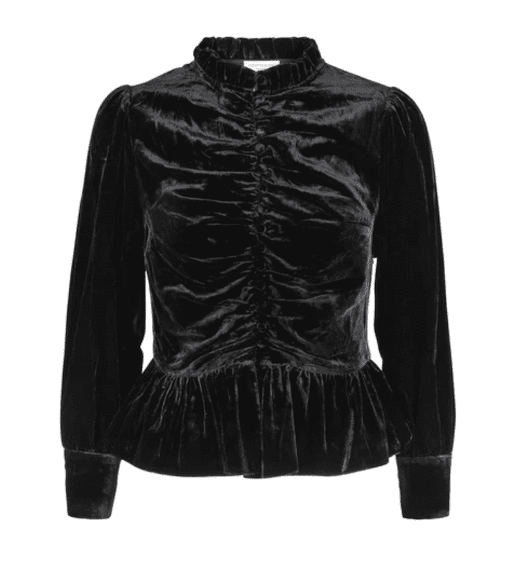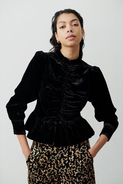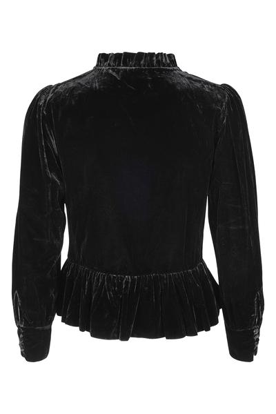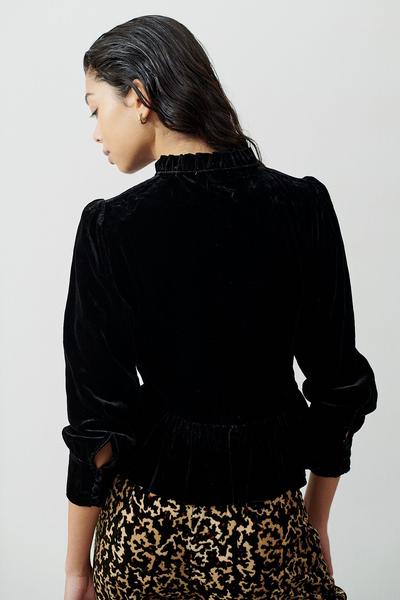 The Hofmann Copenhagen Morgane velour top in black is a stunning short and fitted velvet jacket. The jacket can also be worn as a blouse and looks amazing teamed with black denim for a seriously stylish look. The 3/4 sleeve top is has gathered detailing on the front as well as a peplum waist and fabric covered buttons all the way down the centre front. This stylish top is one that you will have for years to come, the perfect party top.