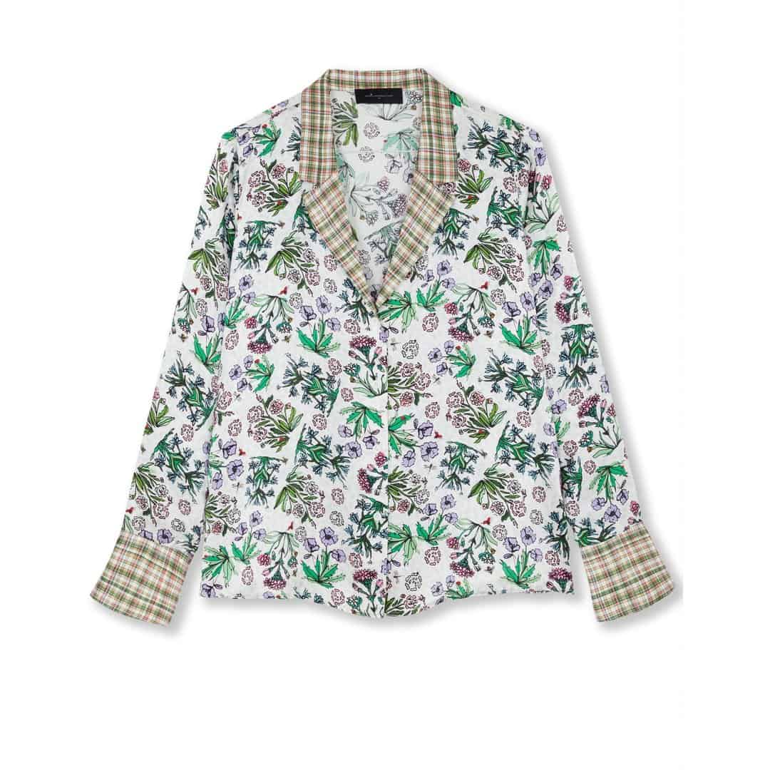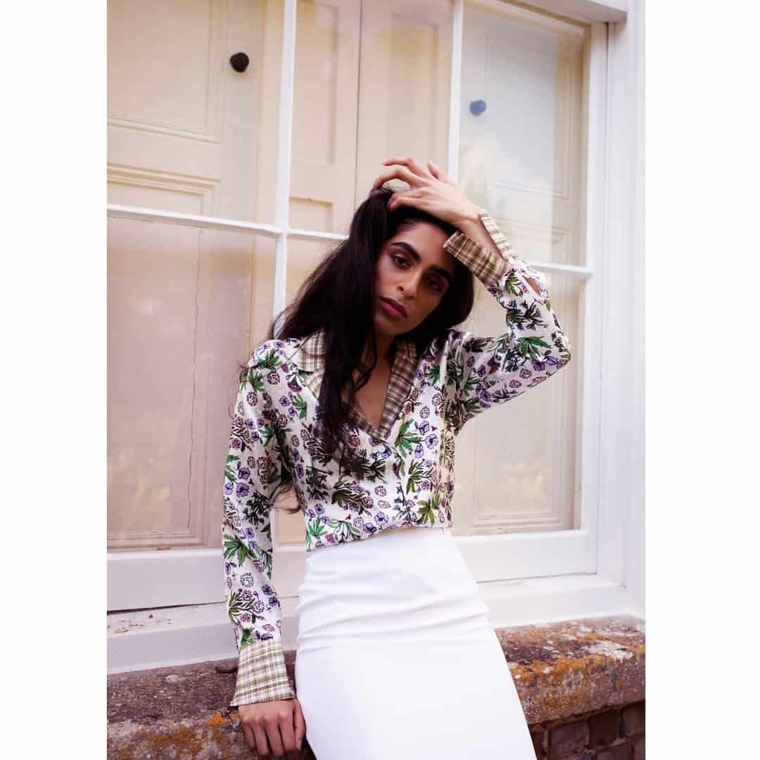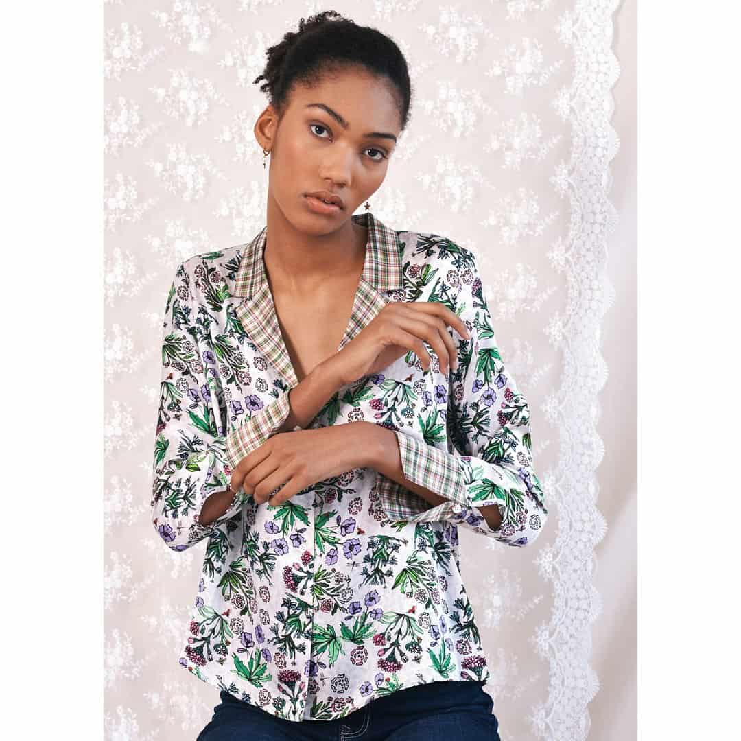 The Jessica Russell Flint Silk Blazer shirt in Celia's Garden is a beautifully cut blazer-style silk shirt that is a hugely flattering design for most shapes, with a slightly sexy twist on the classic slimline shirt. This can be worn with, or without an undergarment, as a simple solo piece or thrown over a t-shirt dress down ""shacket"" flair.