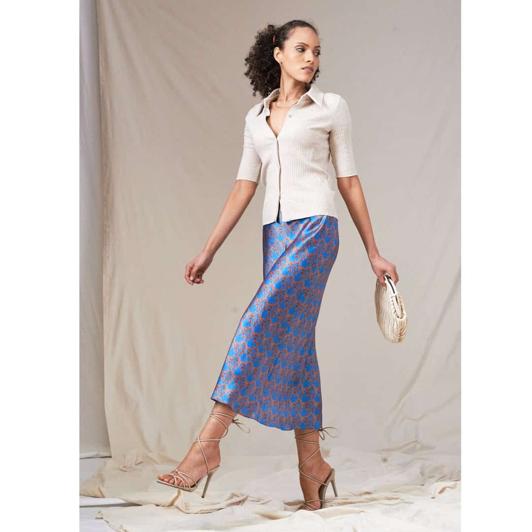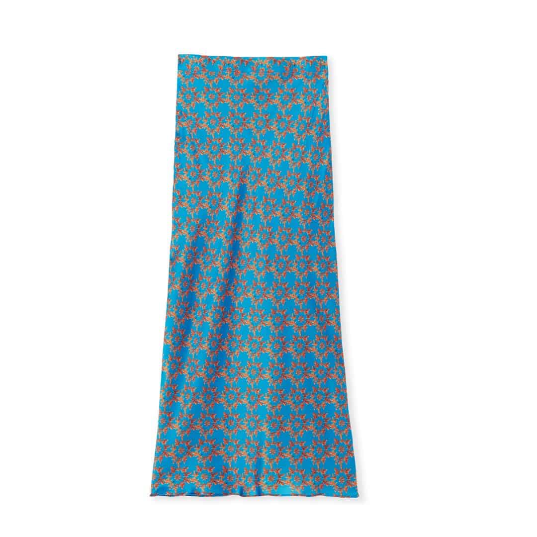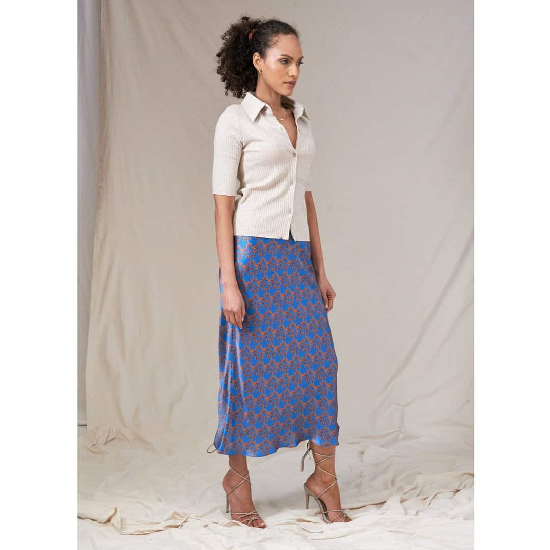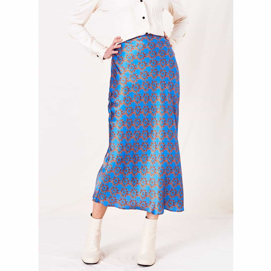 The Jessica Russell Flint Tavia bias cut skirt in blue is made from the most beautiful silk and is a simple AW21 classic. The skirt is in a statement electric blue colour with a crochet print detail all over. This skirt is a must for any wardrobe and will look equally great worn casually with trainers and a sweat or dressed up with heels for a more evening look.