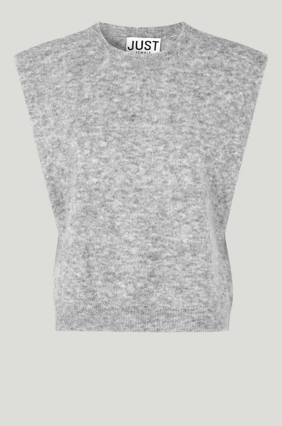 The Just Female Coldy knit vest in grey melange is a certified mohair and wool blend, super soft and cosy knitted vest. The vest has a round neck, defined shoulders and is slightly oversized. This is the perfect piece to style over anything from dresses to shirts for extra warmth when it is cold whilst not compromising on style.