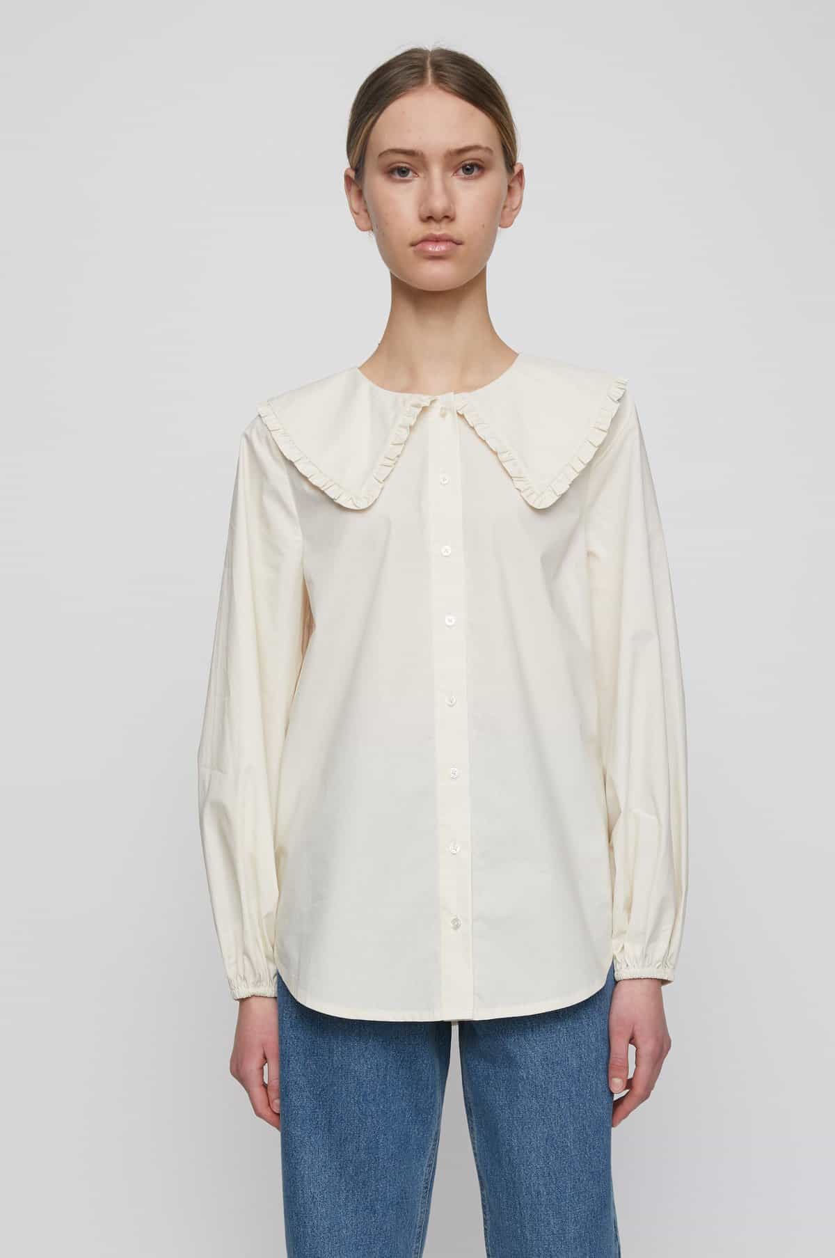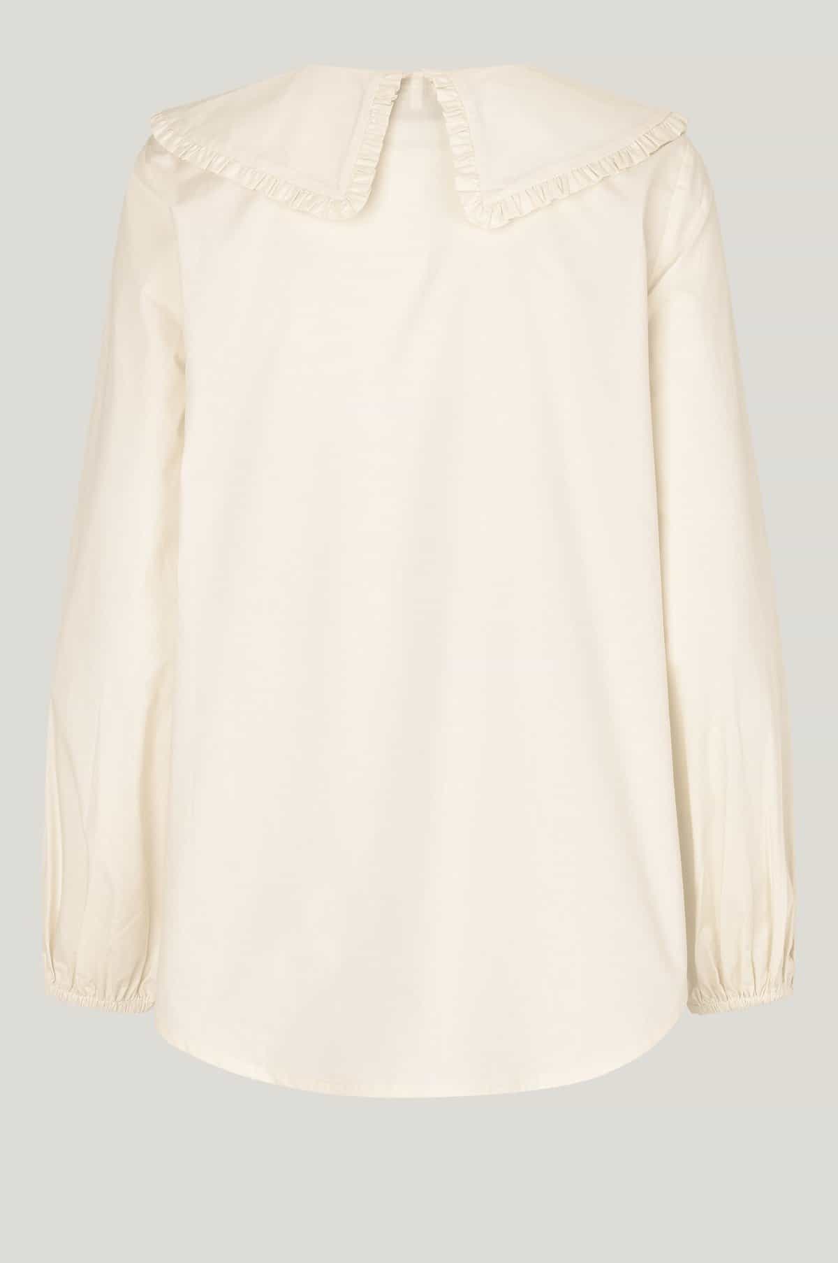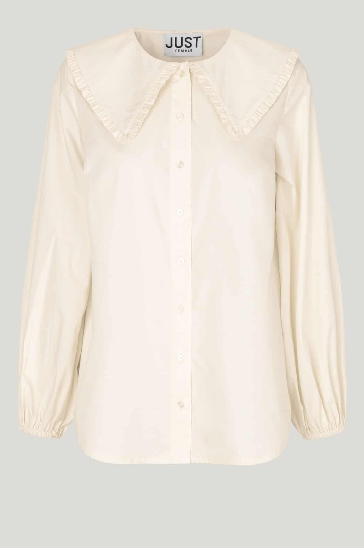 The Just Female Eve shirt in buttercream is a simple yet stylish 100% organic cotton shirt with a feminine oversize collar. The classic fit shirt has voluminous, long sleeves, a round neckline and front button fastening. The rounded hem ensures a perfect fit and look regardless of whether the item is tucked in or left out.