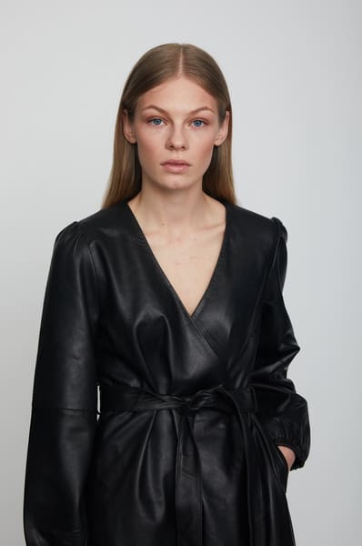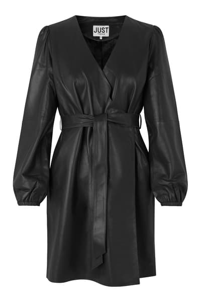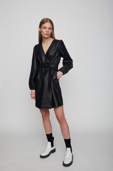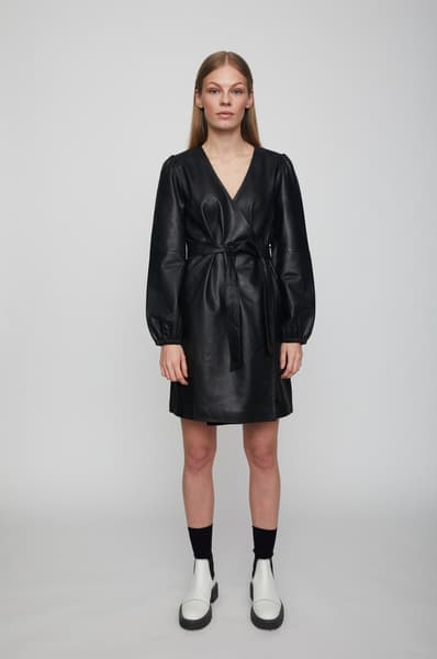 The Just Female Marley leather dress in black is a stunning dress in a buttery soft leather. The dress wraps over at the front with a leather belt at the waist and elasticated cuffs and the must have pockets on the side seams. This dress is one that you will have in your wardrobe year after year, a classic but stylish design that can be dressed up or down.