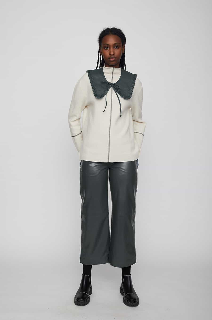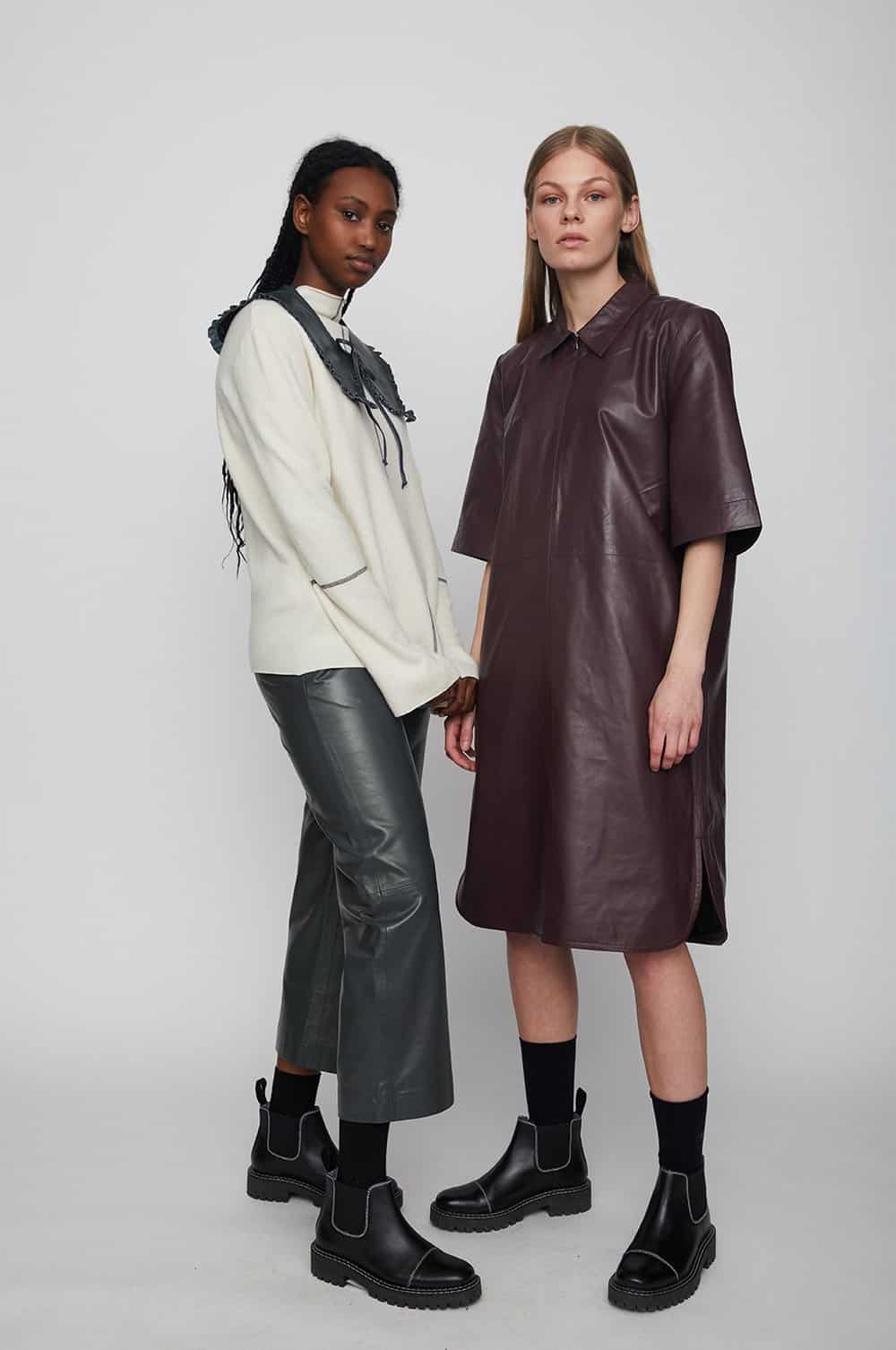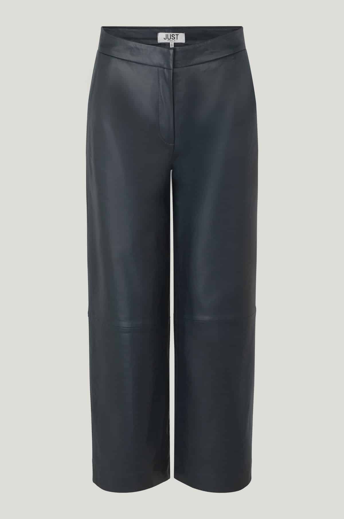The Just Female Roxy leather trousers in obsidian are gorgeous wide leg leather trousers in a beautiful blue tone. They are a high waisted style with a zip fly and side pockets. Made from 100% lambskin these trousers are extremely soft and the flared, wide leg is extremely flattering. Style with the BA&SH Batsy blosue tucked in at the front and heels or boots for a seriously stylish look.