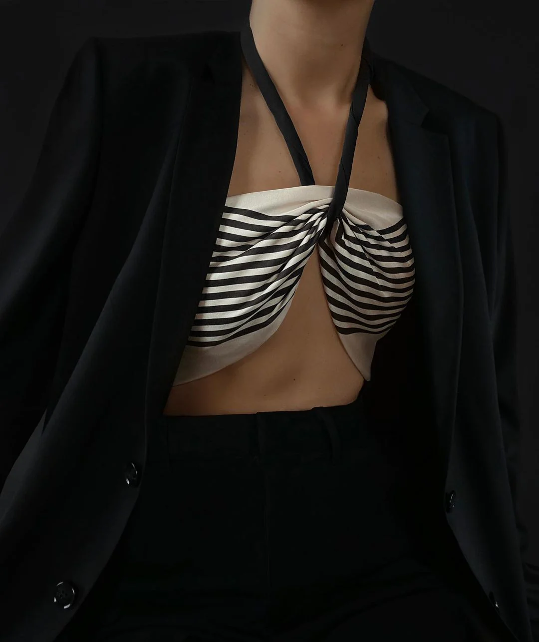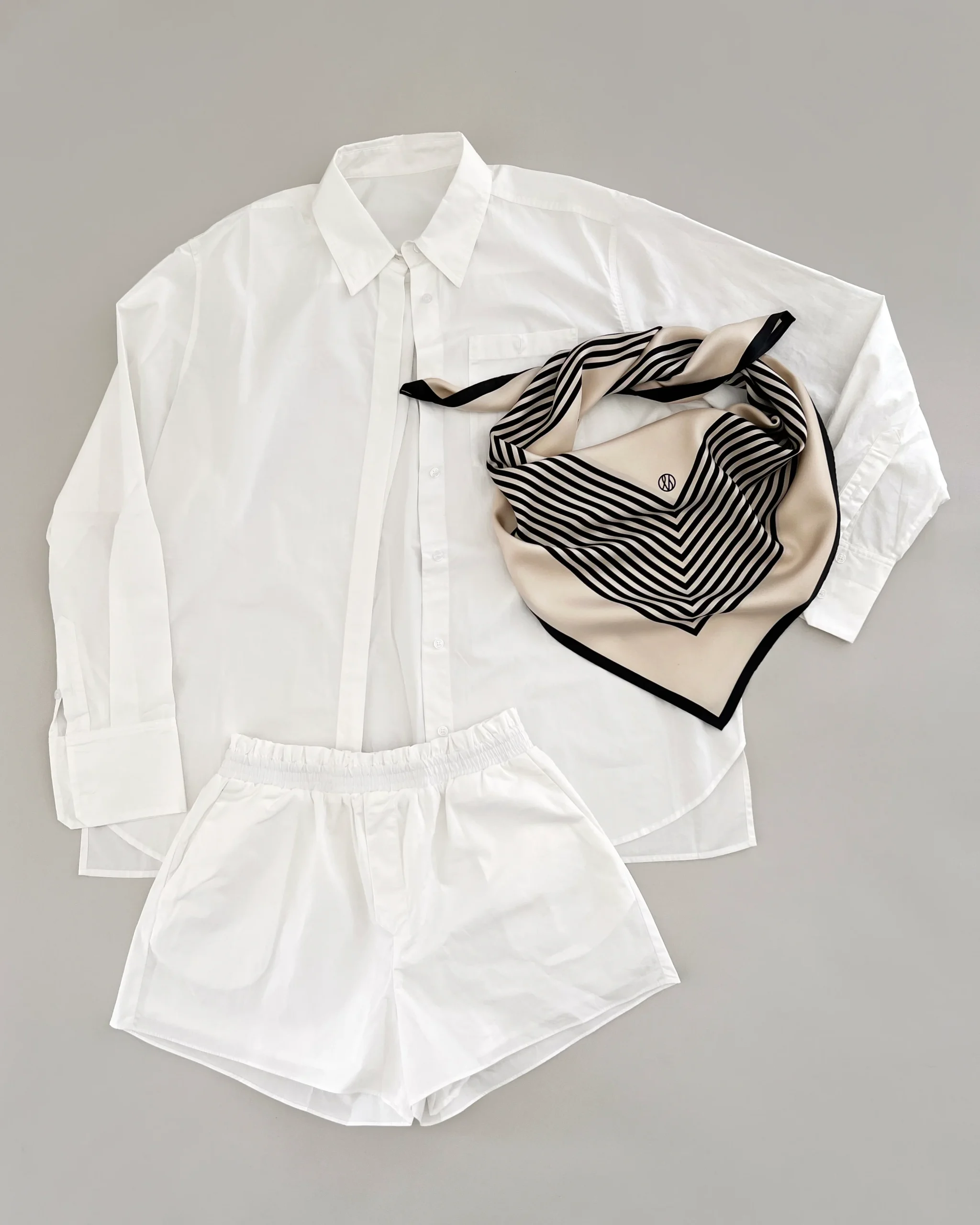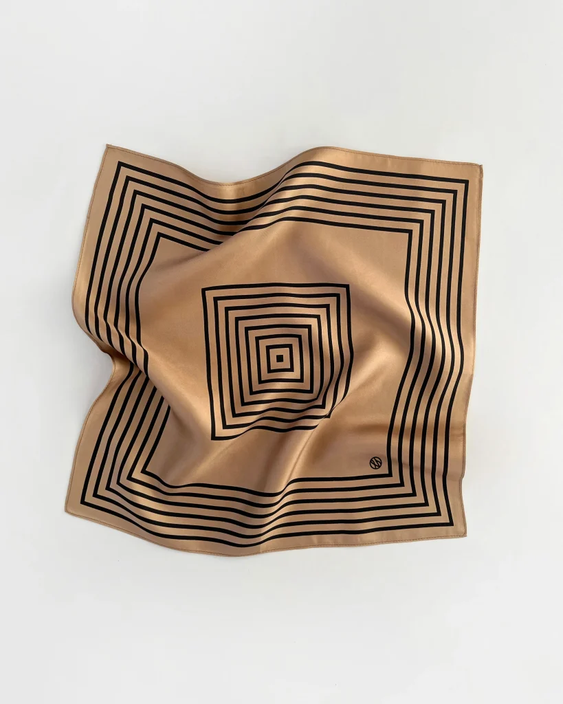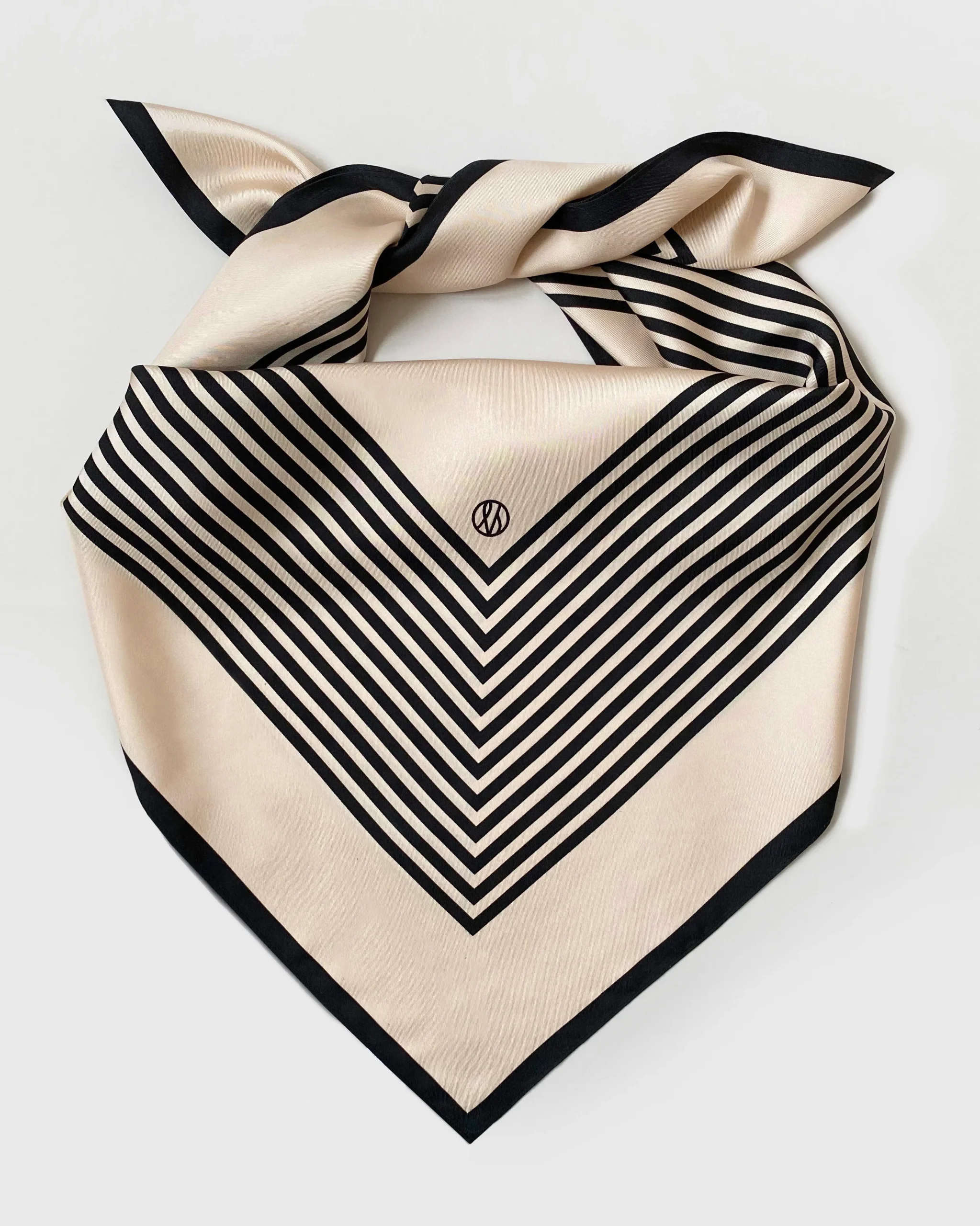 The The Le Scarf 1009 Silk Scarf 65cm x 65cm Cappuccino & White is the largest design. A grand version of the classic scarf No. 1 - with endless styling options. Drape it over your shoulders or wear it around your head. This scarf can also be styled as a bandeau top.