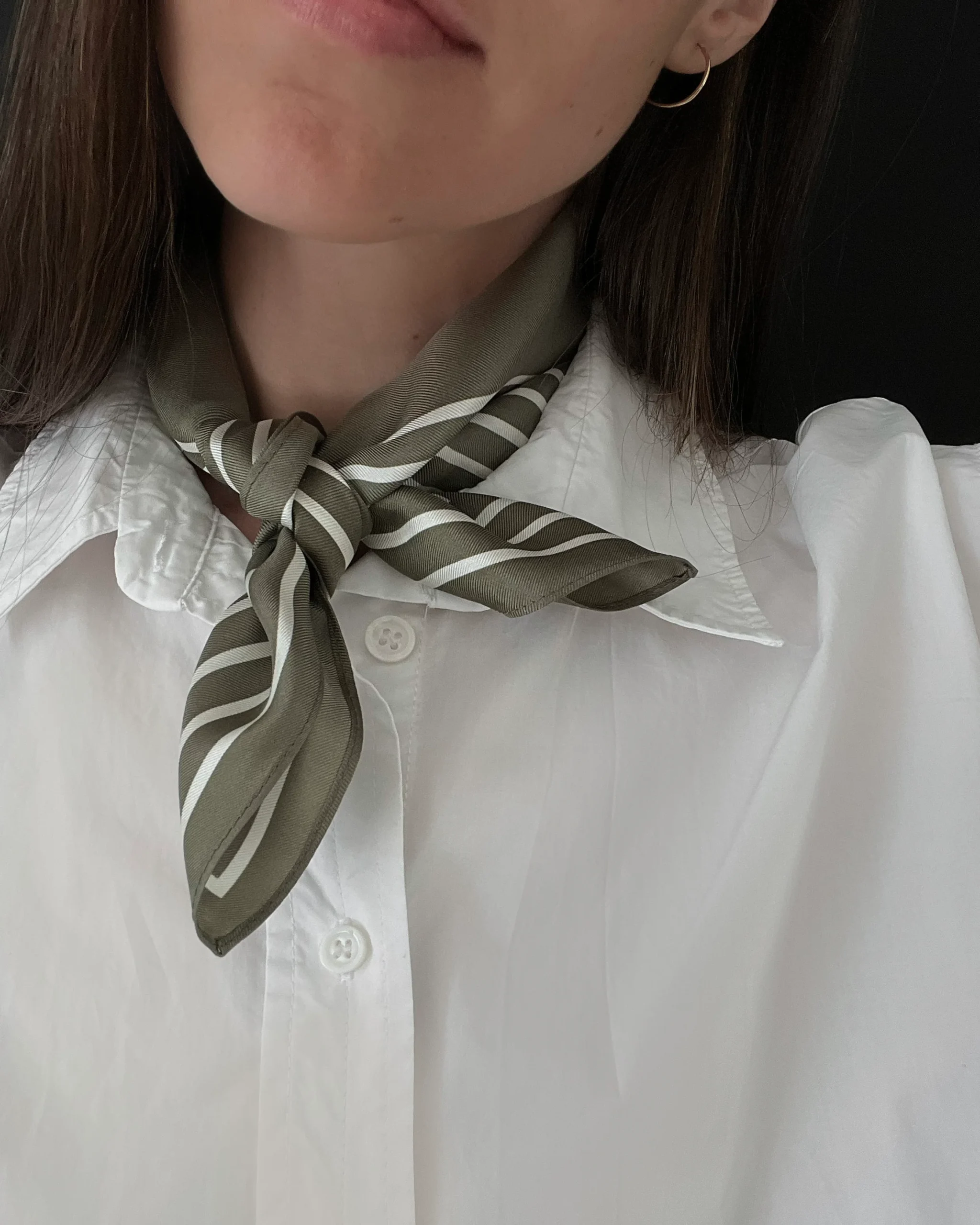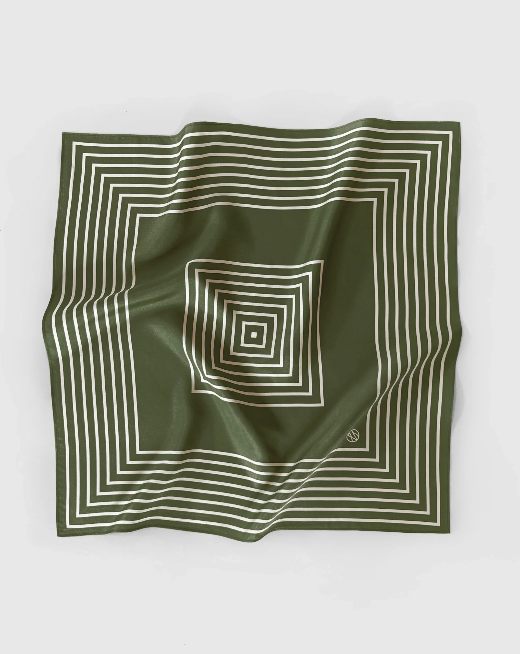 The Le Scarf Silk Scarf 50cm x 50cm Olive Green Cream is the perfect accessory. This scarf comes in a smaller size of 50x50 cm, designed to be worn in a variety of ways. Wrap it once or twice around your neck, wear it around your waist or loop it through a high ponytail.