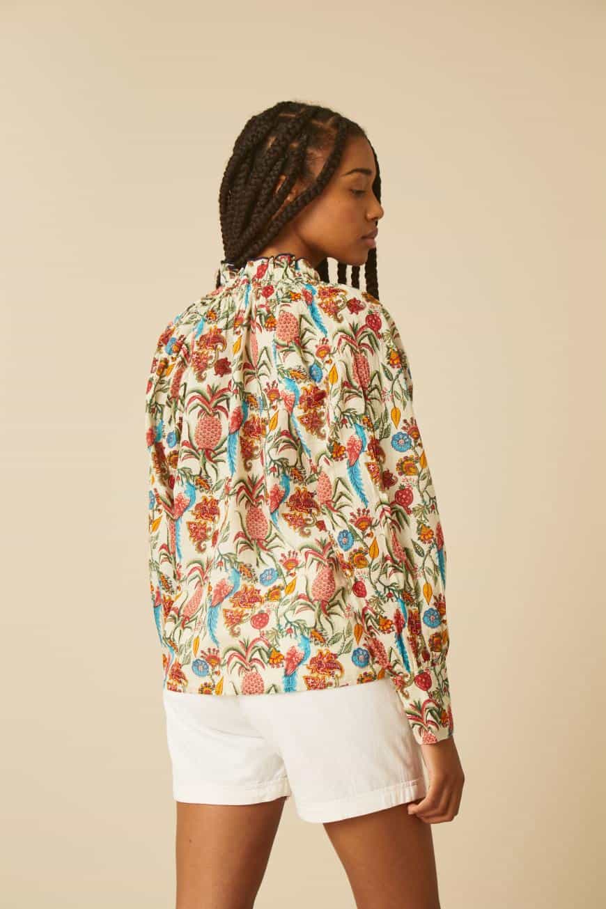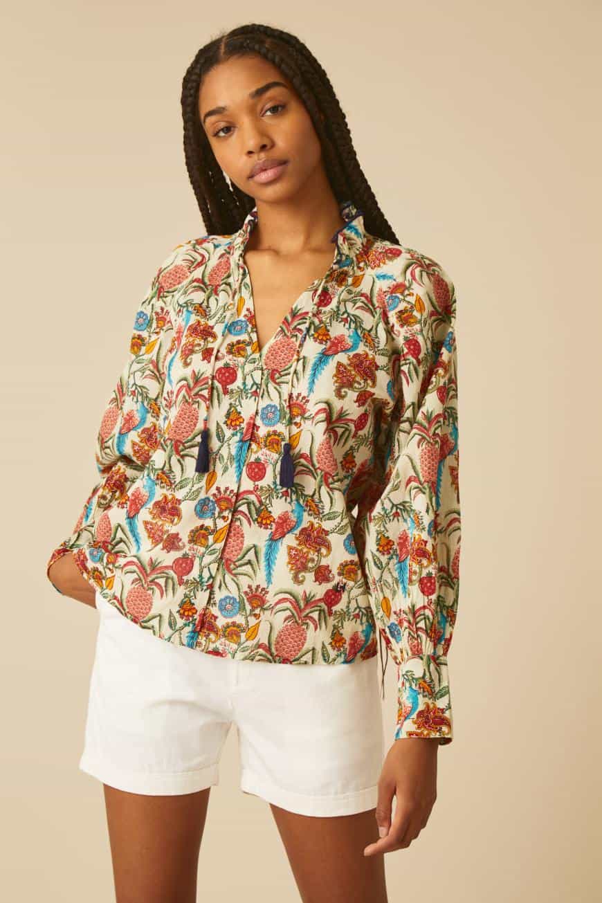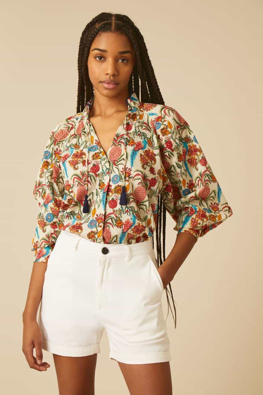 The Leon & Harper Caris Ananas blouse in off white is a gorgeous, lightweight blouse made from organic cotton. The long sleeve blouse has a round collar with a drawstring at the front and has a stunning exotic print all over. The balloon sleeves create volume and look great whether they are worn down or pushed up. Style with denim or shorts for a seriously stylish summer look.
