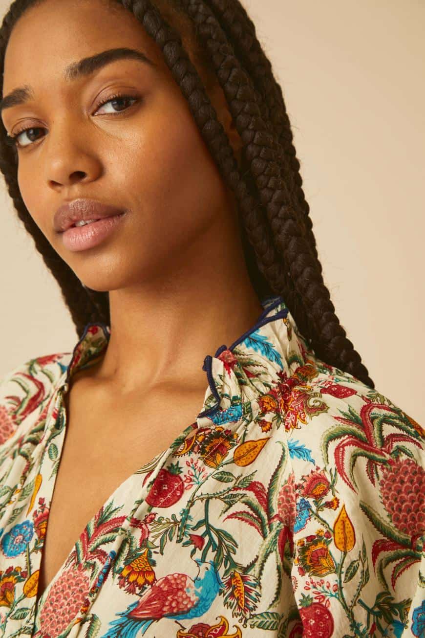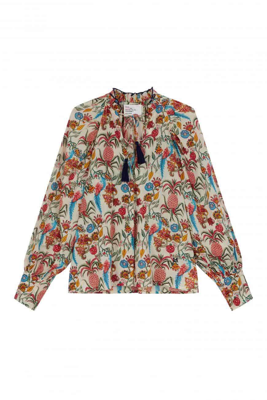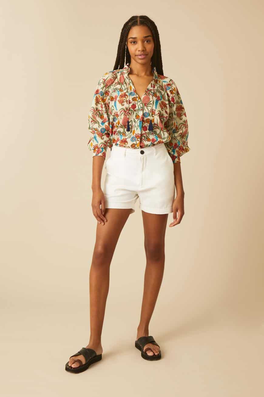 The Leon & Harper Caris Ananas blouse in off white is a gorgeous, lightweight blouse made from organic cotton. The long sleeve blouse has a round collar with a drawstring at the front and has a stunning exotic print all over. The balloon sleeves create volume and look great whether they are worn down or pushed up. Style with denim or shorts for a seriously stylish summer look.