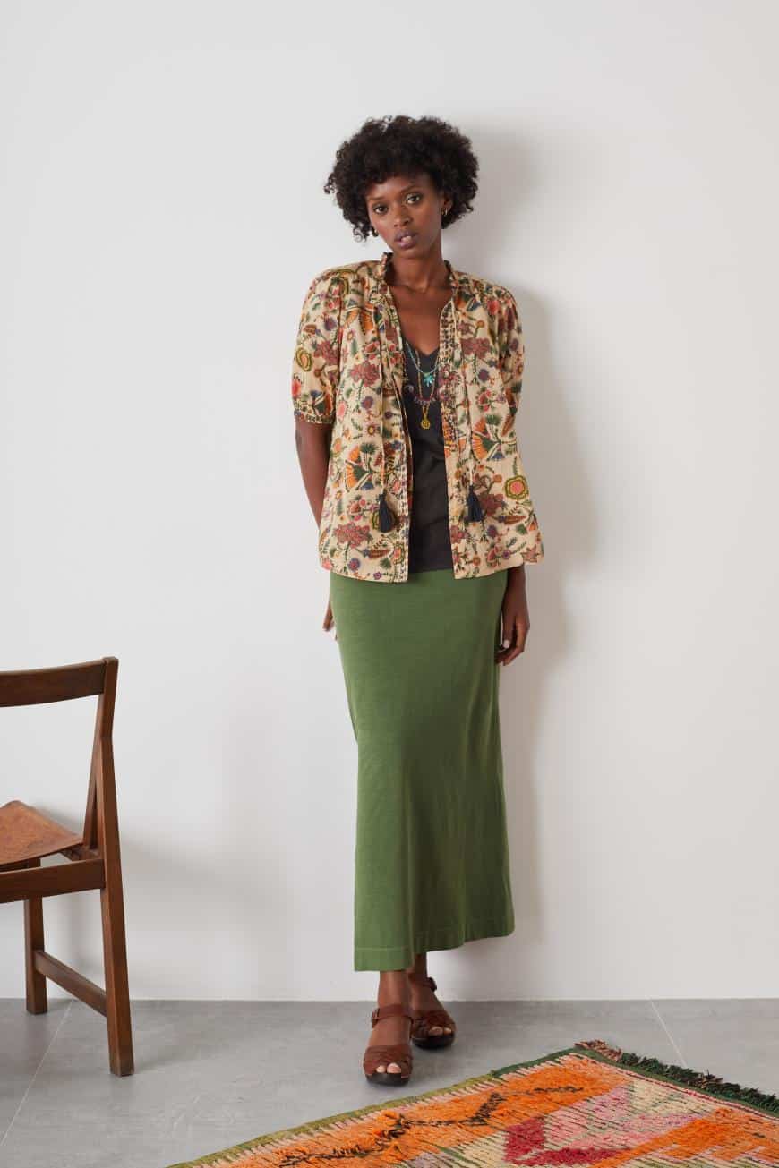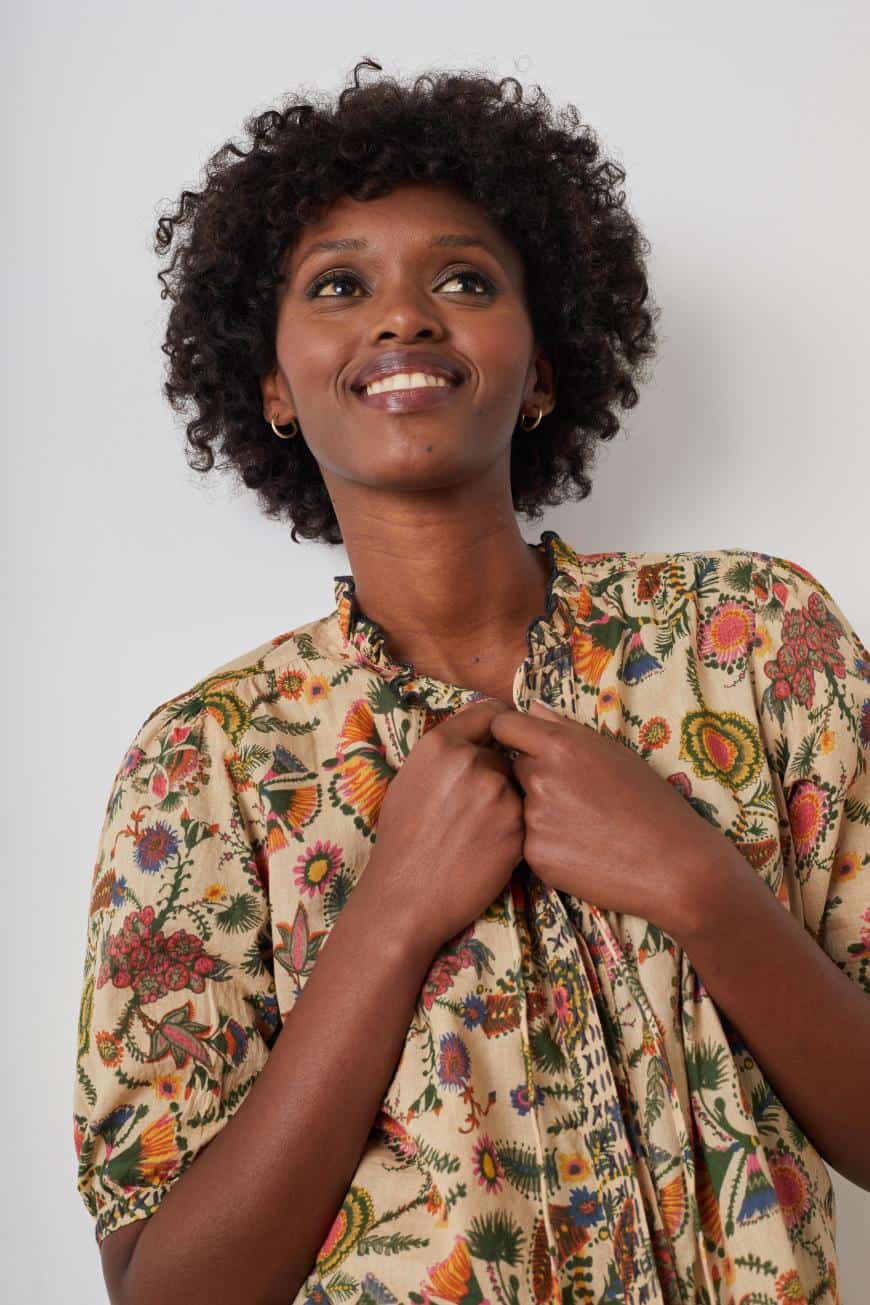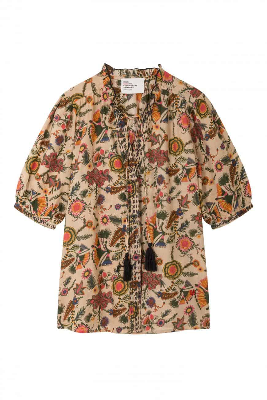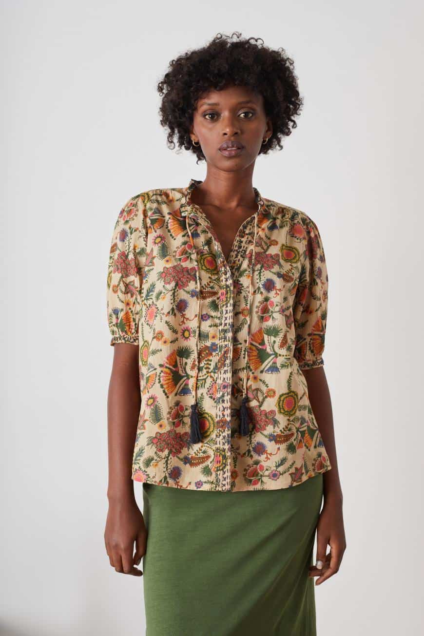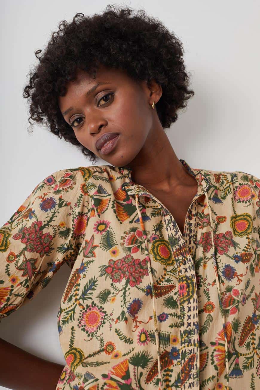 The Leon & Harper Conie Desert Shirt in sand is a short-sleeved shirt that is perfect for the summer season with its all over floral print. The shirt has a bohemian feel to it, with its tasselled ties at the neckline. Style with a pair of jeans or a maxi skirt for the perfect summer casual style.