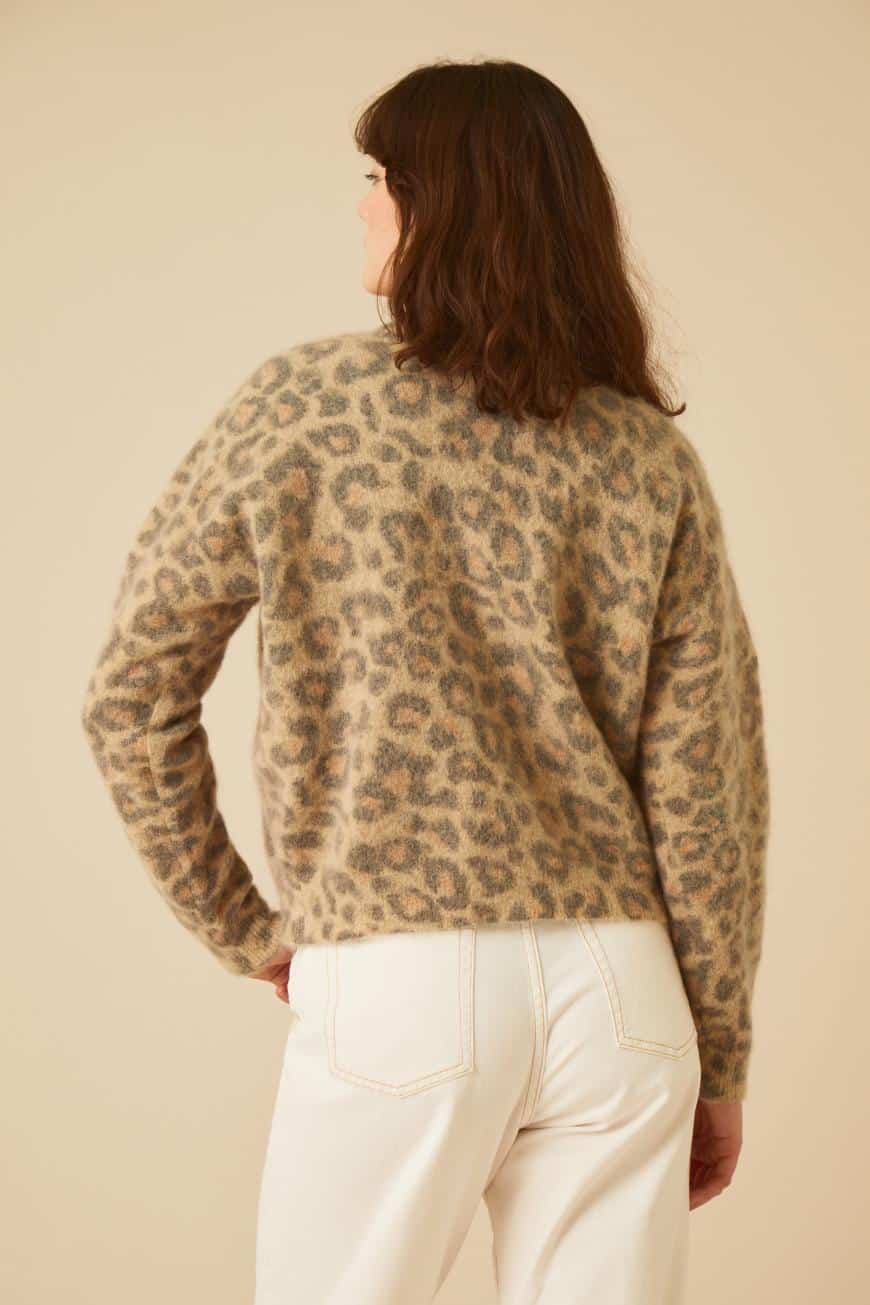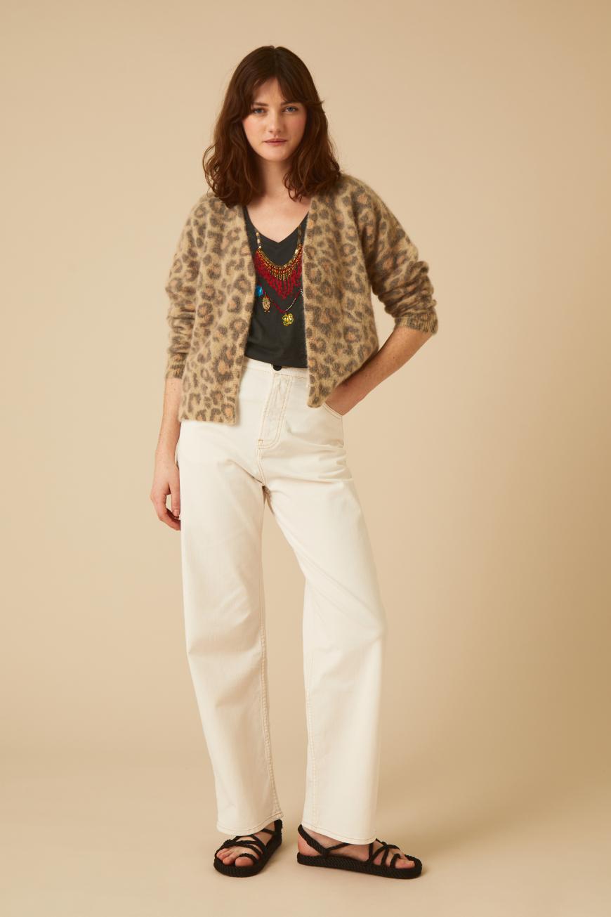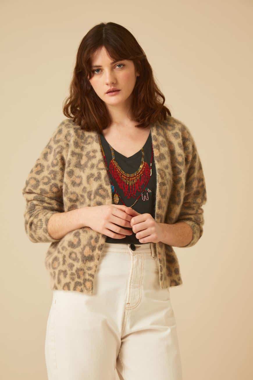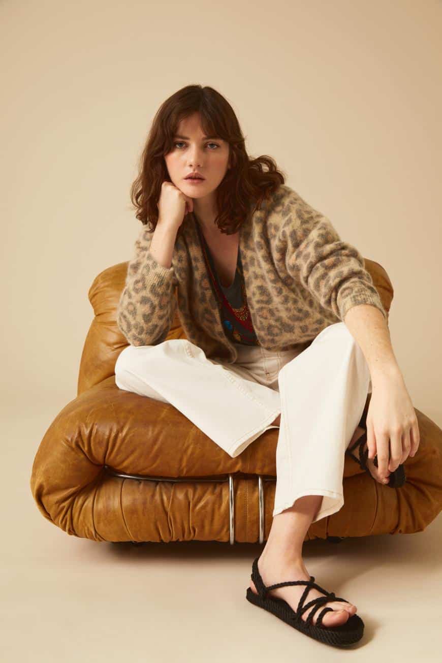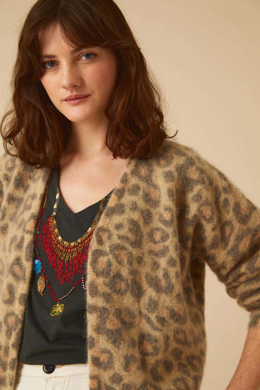 The Leon & Harper Nigna Beast cardigan in Beast Yellow leopard print is a classic in any woman's wardrobe. This season, the leopard print is softer both in its lighter shade and thanks to the composition of the mohair and alpaca cardigan. The Nigna Beast cardigan is perfect with ecru trousers or a jersey dress.