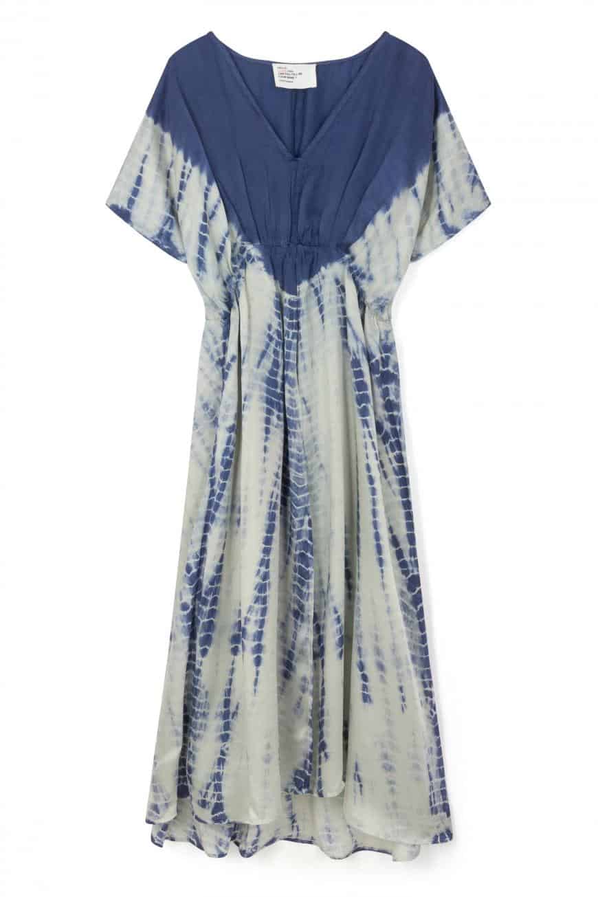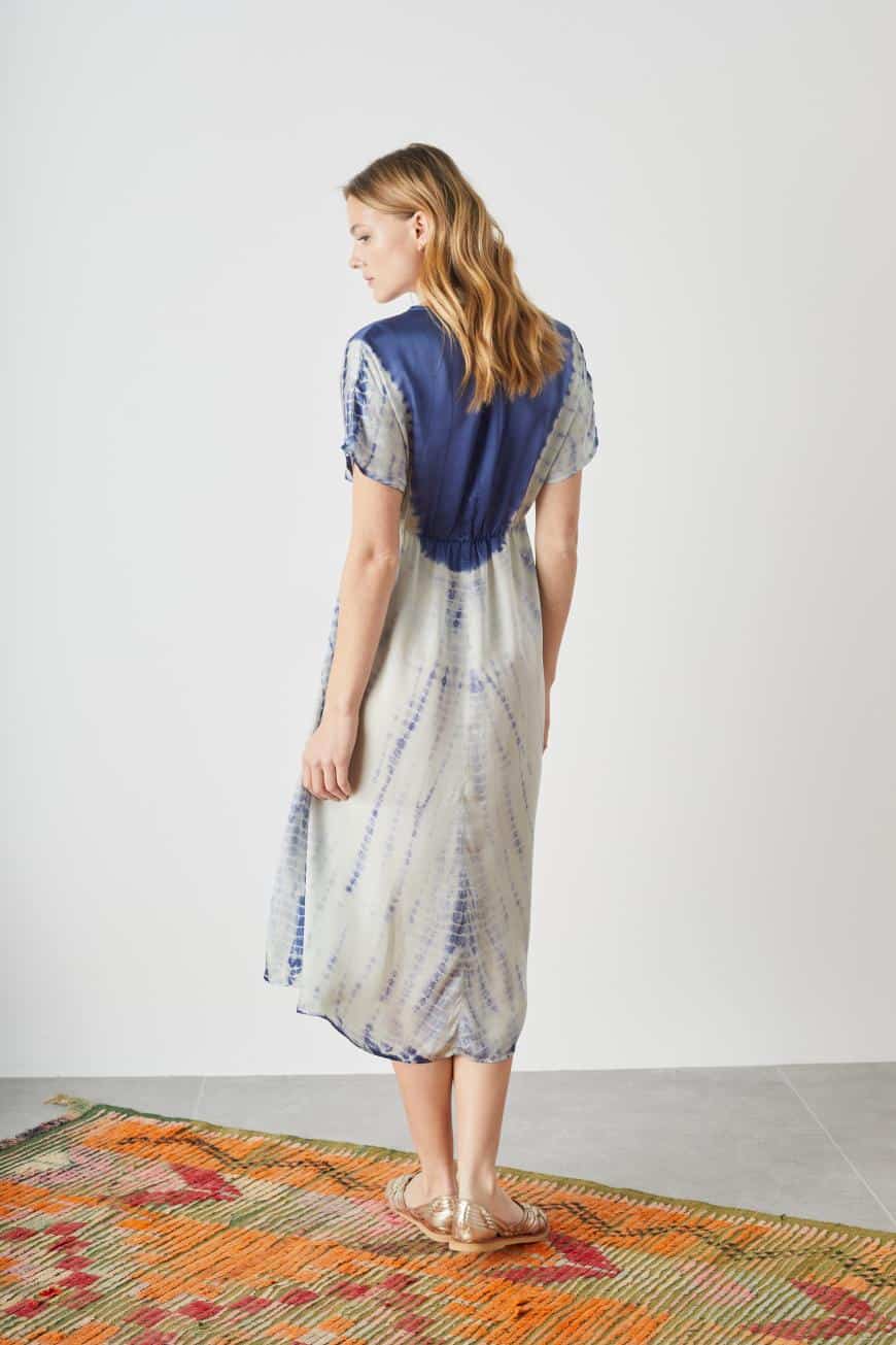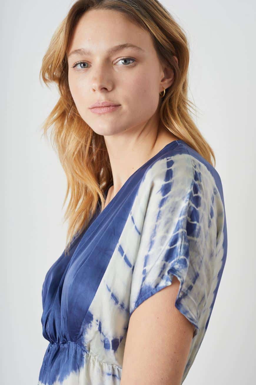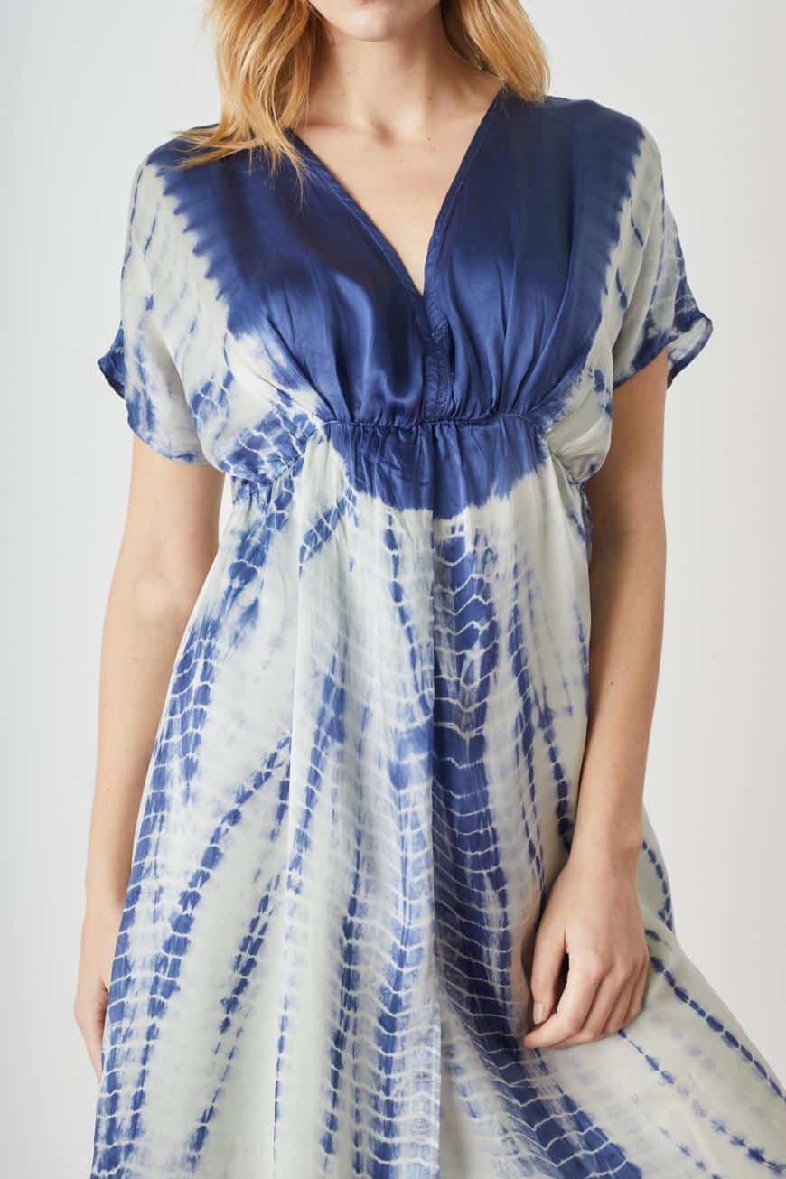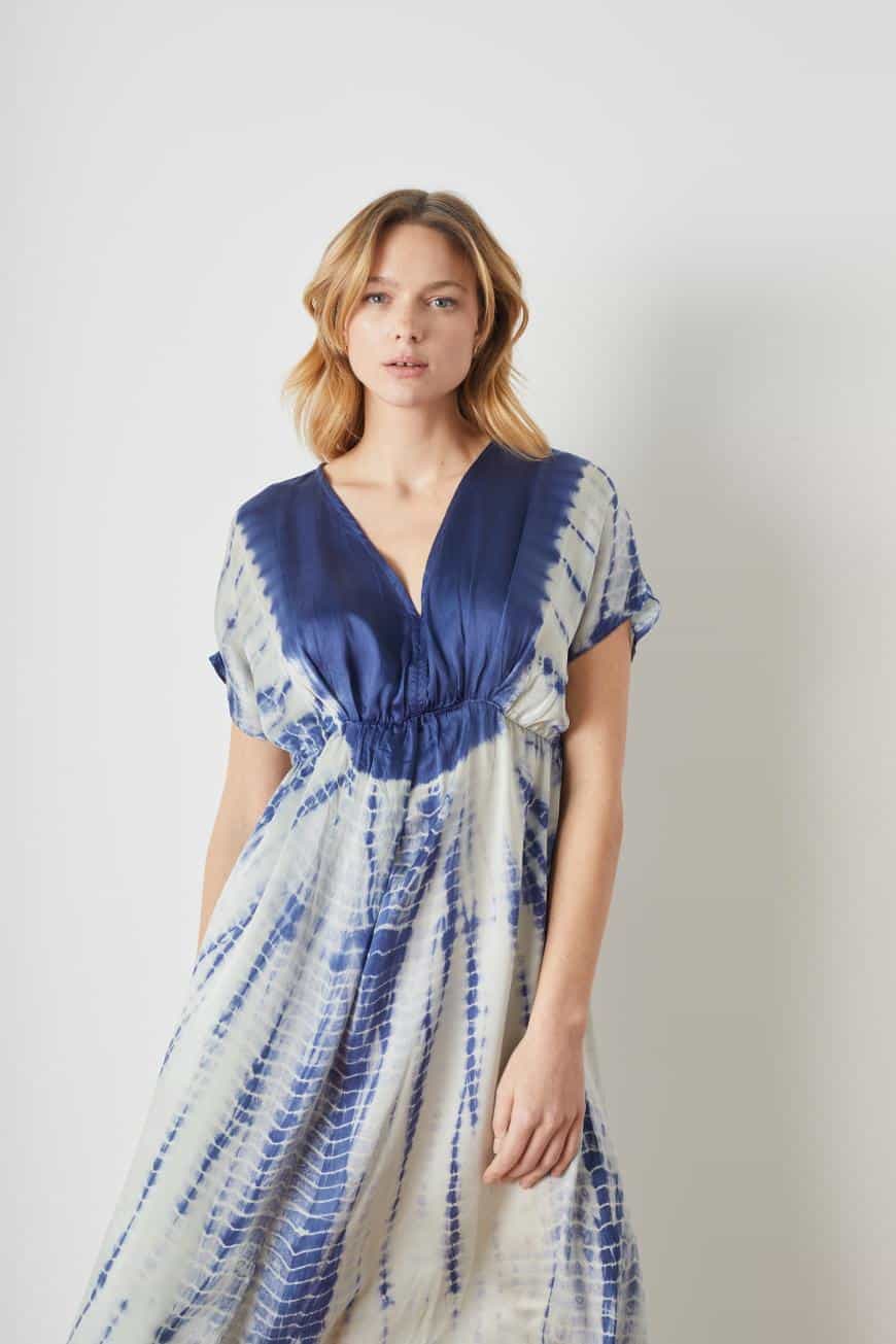 The Leon & Harper Novelty Rimbo Tie Dye dress in blue is a super flattering shape with a V-neck, short sleeves and elastic under the bust. With its contrasting blue tie dye print the Rimbo is perfect for summer day time dressing or for wearing on holiday.