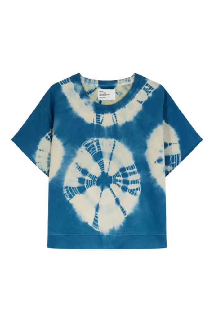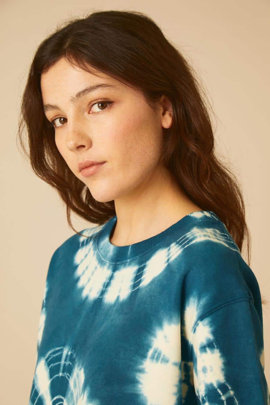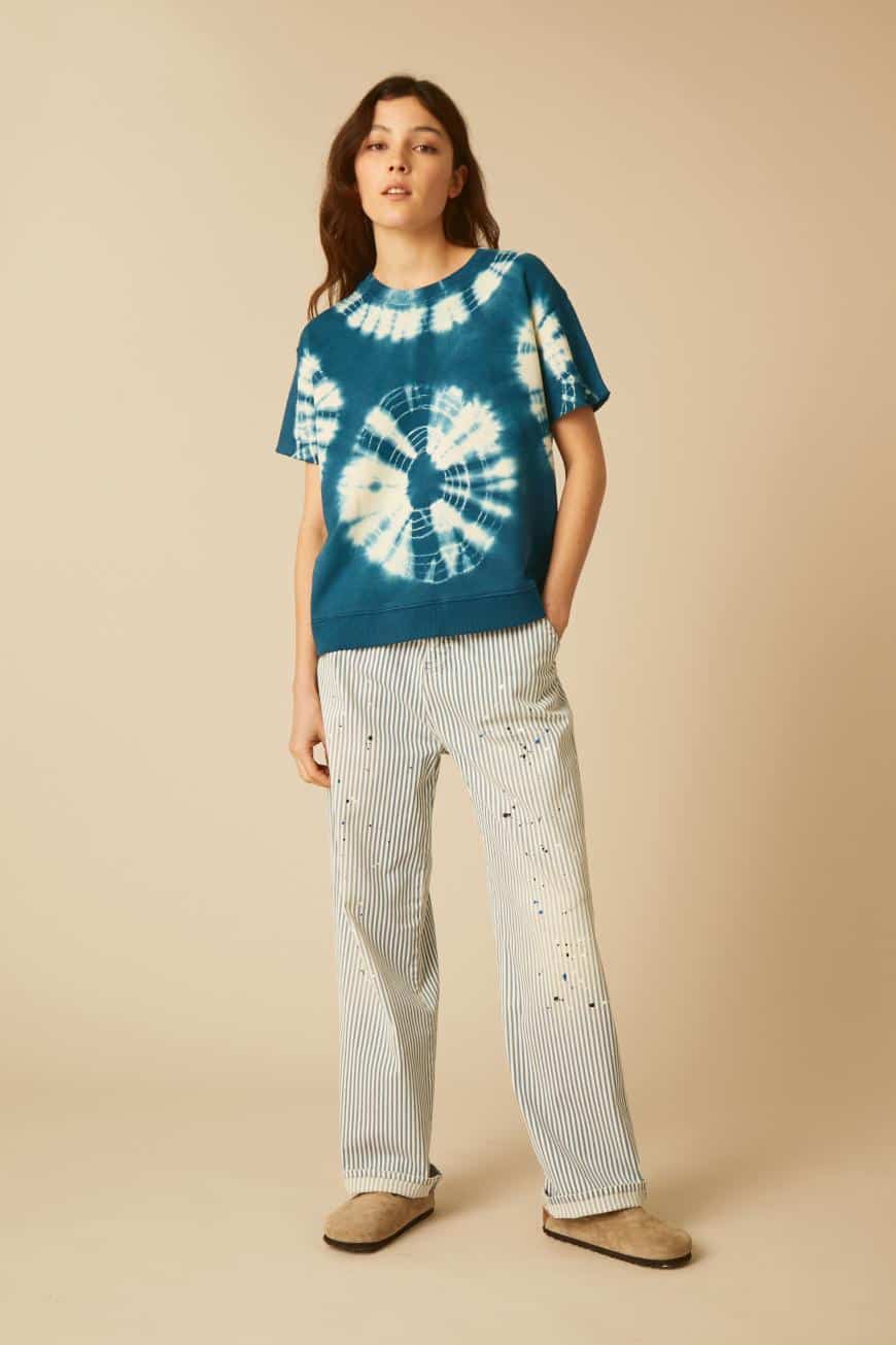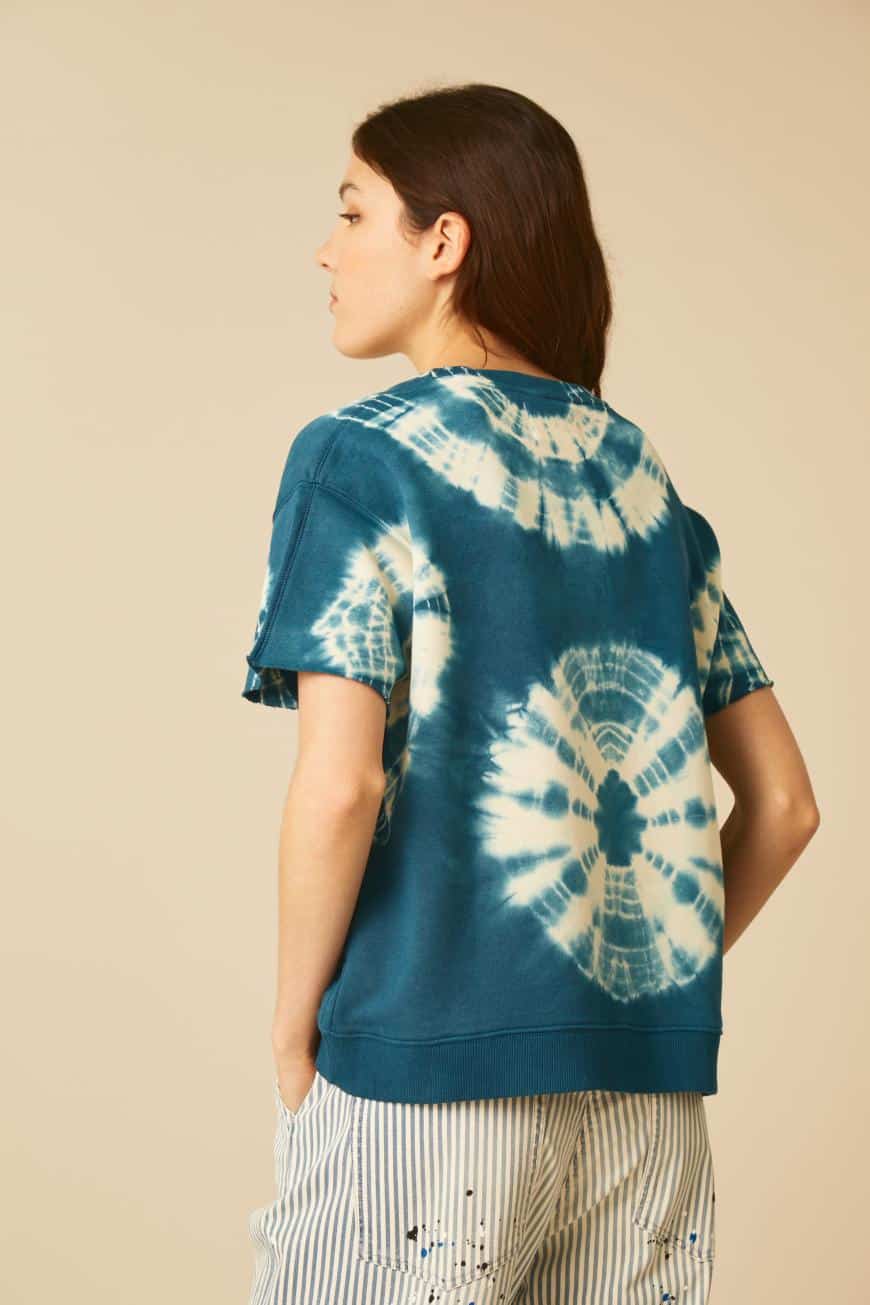 This Leon & Harper Soli tie dye sweat in blue is an organic cotton and modal mix top with a gorgeous tie dye print all over it. The short sleeve sweat has ribbed detailing on the neck, cuffs and hem and screams summer and holidays. Wear with jeans as an alternative to a t-shirt or for a more co-ordinated summer look style it with the matching Quarol shorts.
