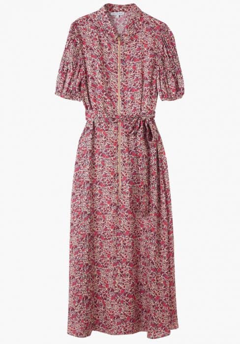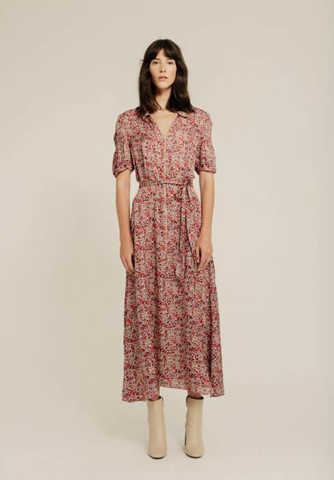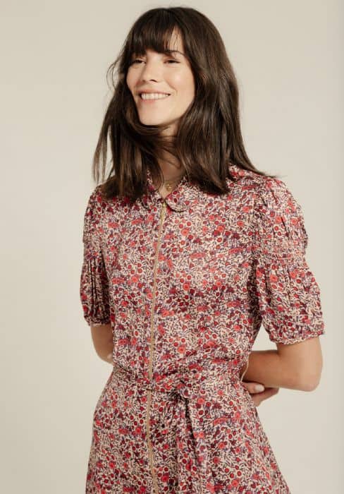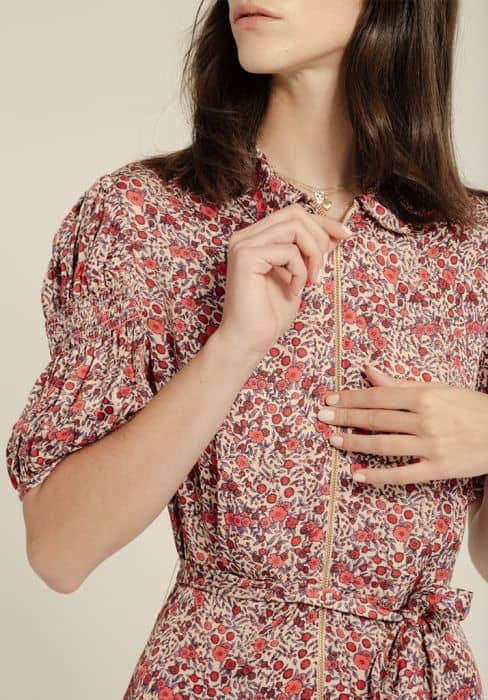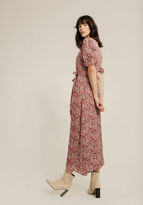 The Lily & Lionel Amelia Dress in Wild Rose is a new shape for AW20 and is inspired by a 1930's house dress. It's all in the details with the peterpan collar, shirred details on the sleeve and a self tie belt at the waist. The dress is cut from organic lotus satin woven from the thrown away hems of India's national flower. It features an all over print of a wild rose print reminiscent of the English countryside.