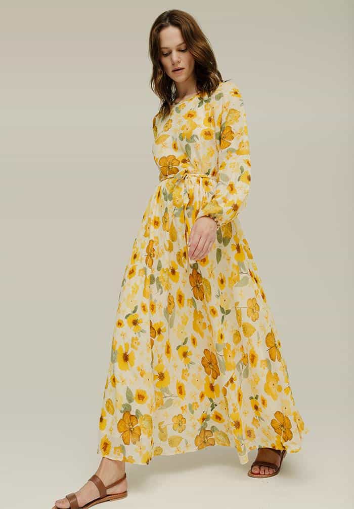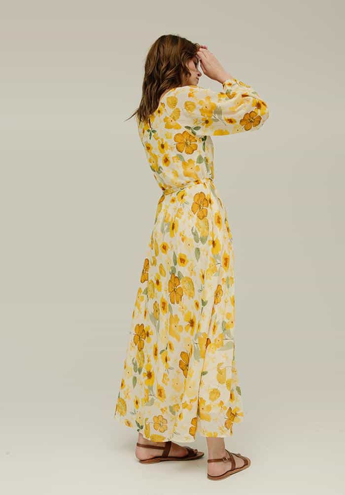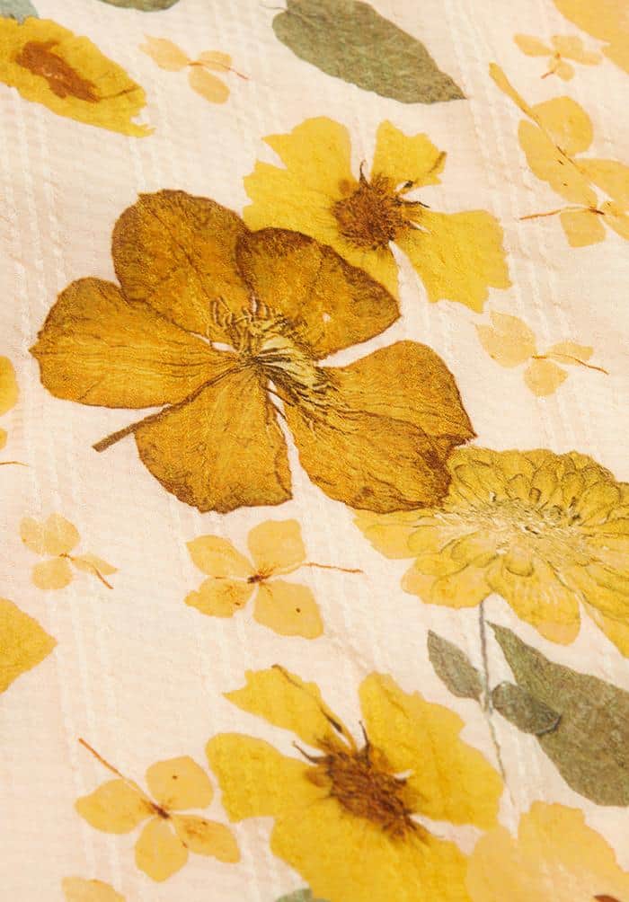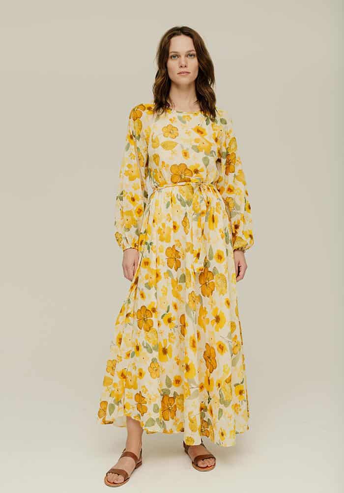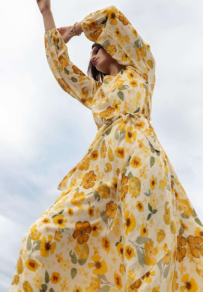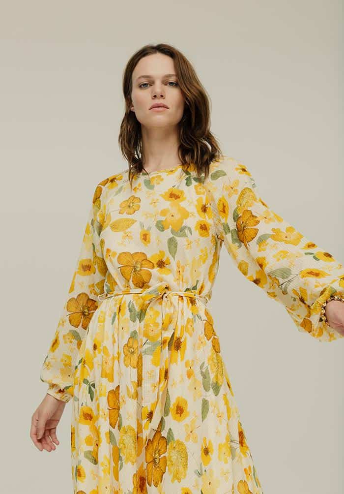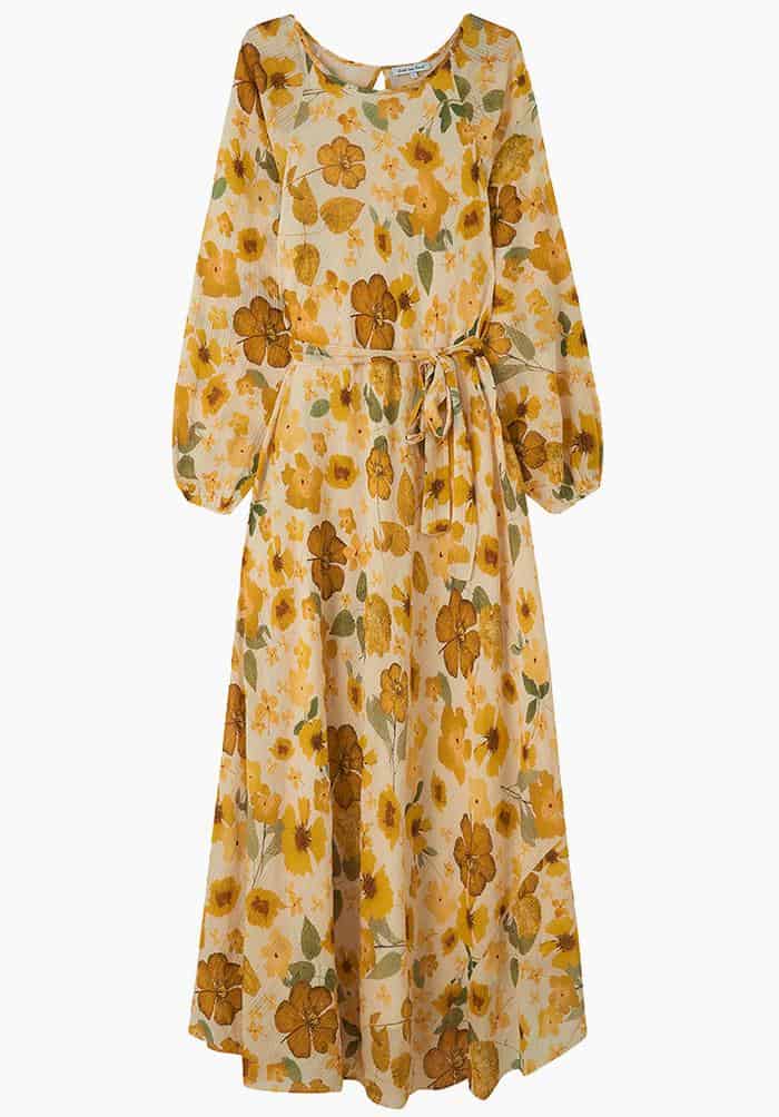 The Lily & Lionel Indian Sunset Dress in secret garden is a beautiful dress that is inspired by the brands' best-selling Pressed Floral Ivory print. The dress is a semi-sheer check fabric made from banana fibre which gives texture to the dress, whilst the bright sunshine yellow all over flower print ensures that this is dress to get you noticed.