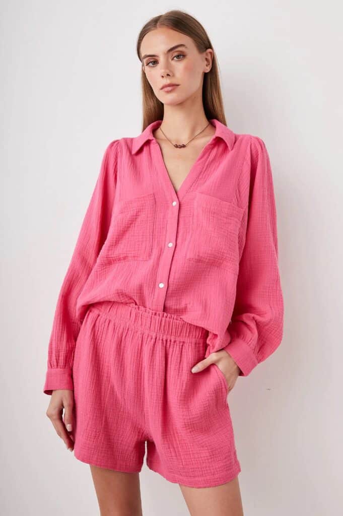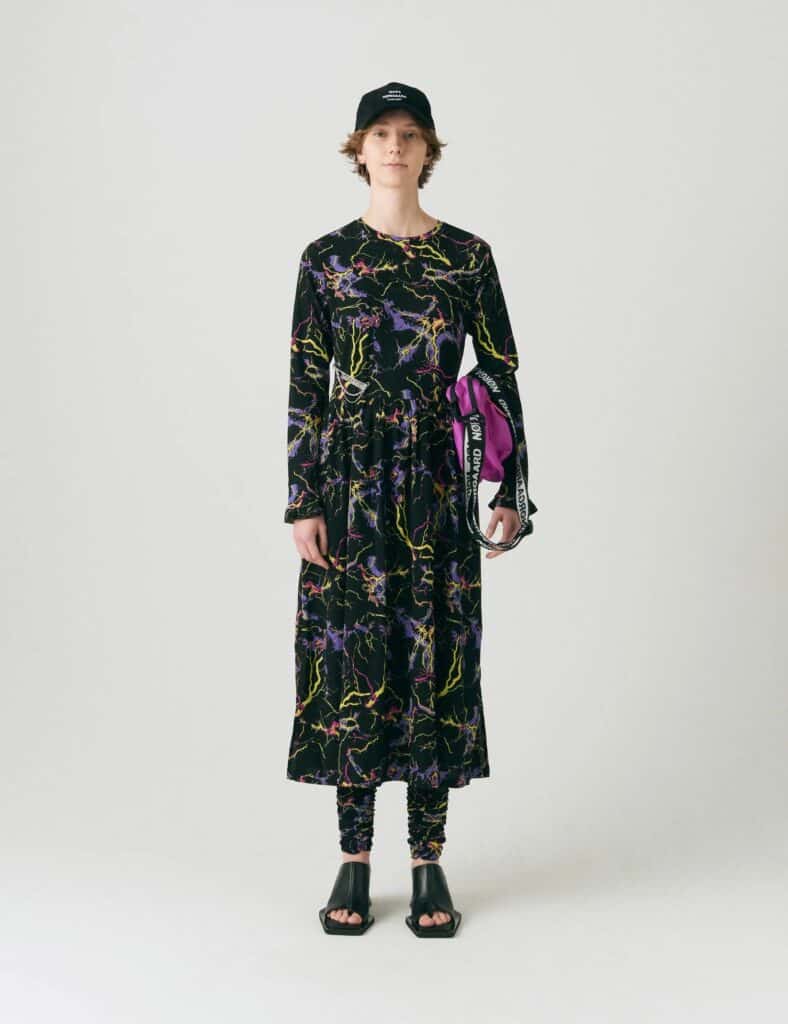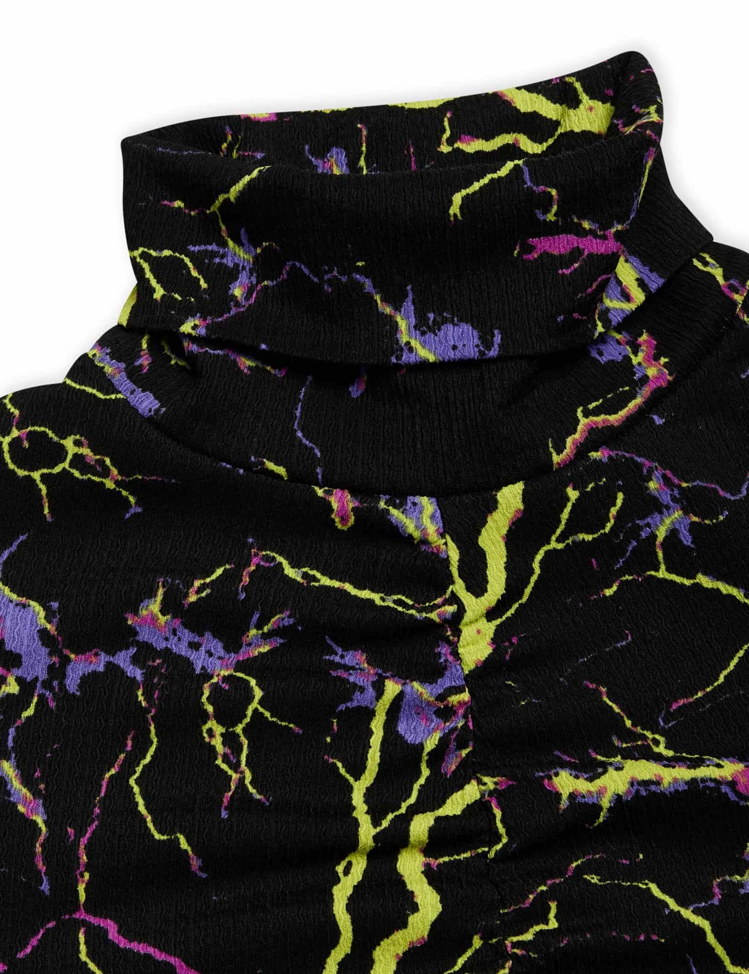 The Mads Norgaard Adenau blouse in sky aop black is a tight fitting top with a ruched drape down the centre front and long sleeves. The top has a crepe feel to it and a lightning pattern all over it in purple, pink and neon yellow. This top looks great worn under knitwear so that only the turtleneck is showing or in the evening tucked into straight jeans.