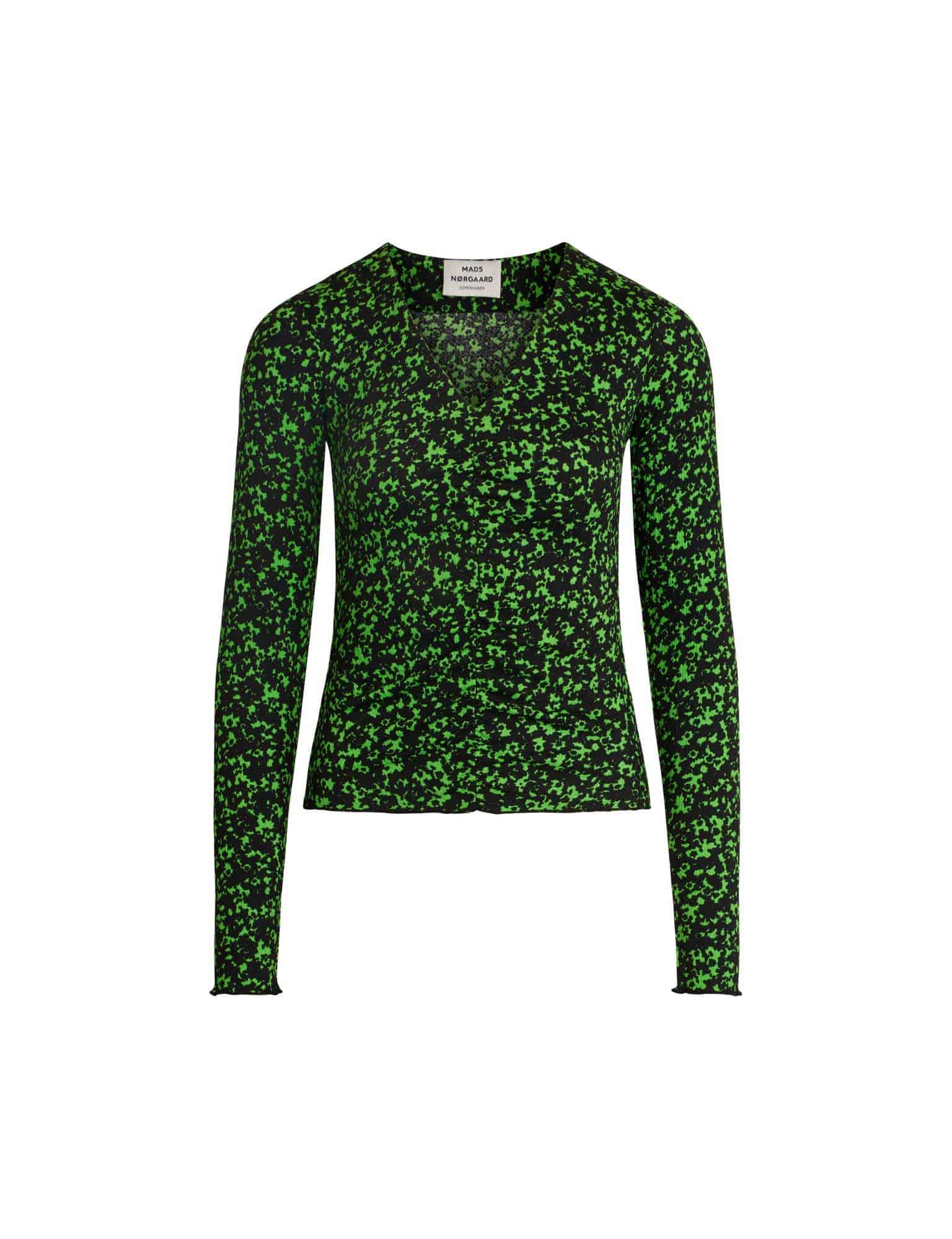 The Mads Norgaard Pollux Sheer top in classic green/black is a striking fitted top with gathering that goes down the front and back vertically. This gathering creates horizontal wrinkles which are super flattering and the green floral print on the black base makes it an eye catching top. Wear this top during the day with denim and trainers and then tuck into straight jeans or leather trousers for the perfect evening look.