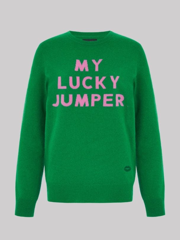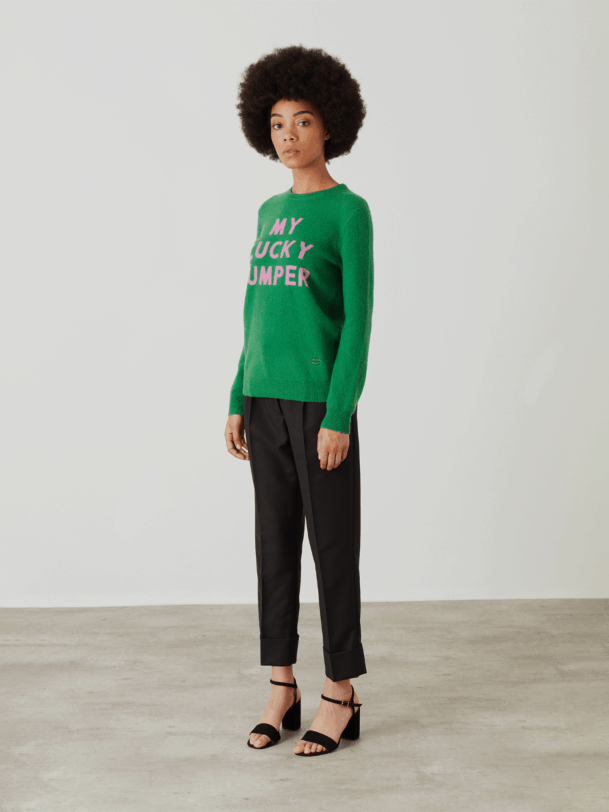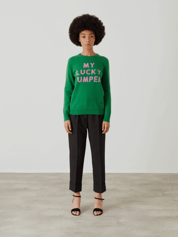 The Markus Lupfer Mia Intarsia My Lucky Jumper in the most striking green colour is guaranteed to become a wardrobe favourite. Made from super soft fine merino wool, it is topped with a flattering round neck and cut in a slim fit. Across the front of the chest it has the tonal Intarisa 'My lucky jumper' graphic. This is the perfect colourful and playful knit which looks amazing when styled with straight-leg jeans.