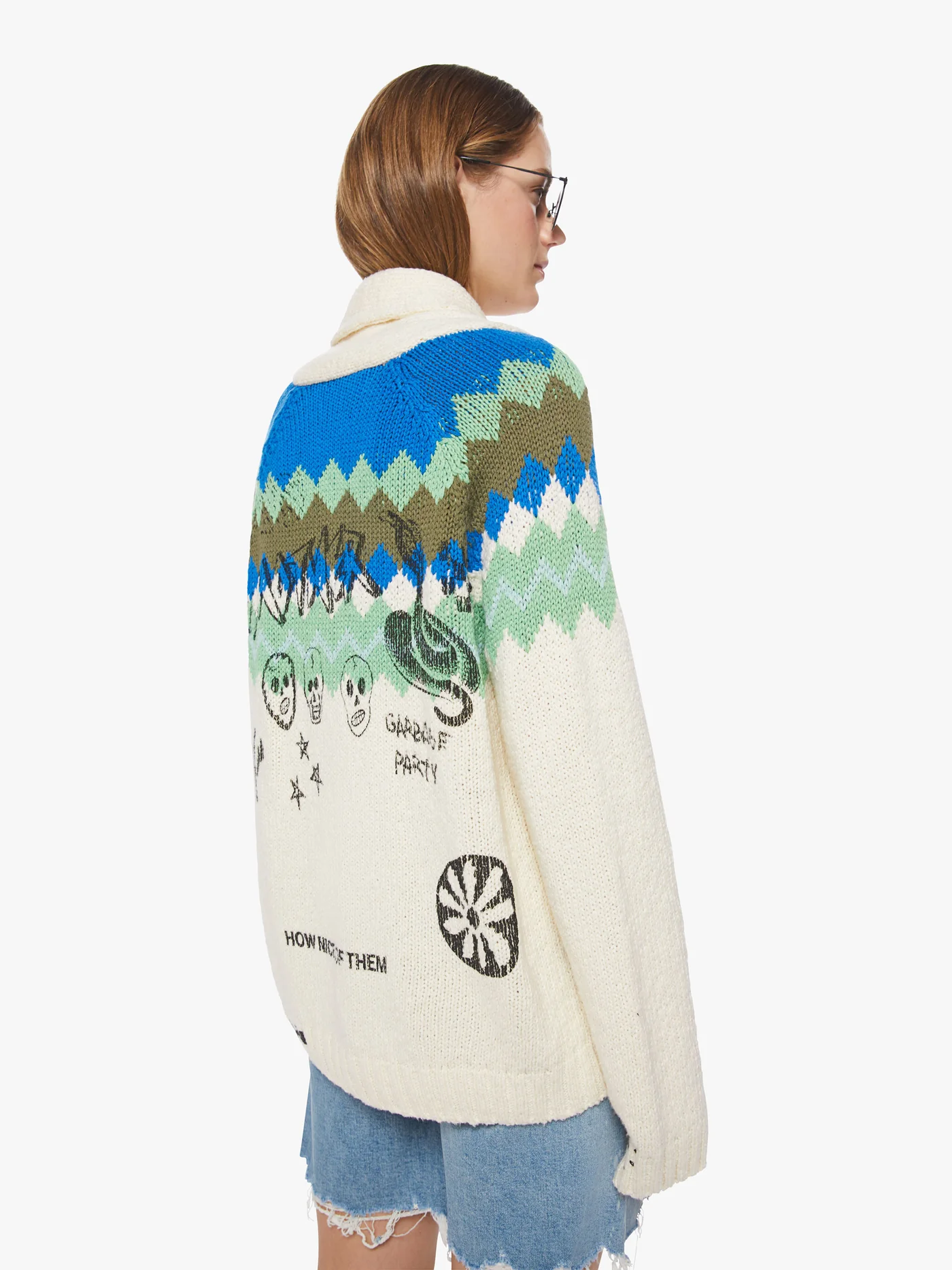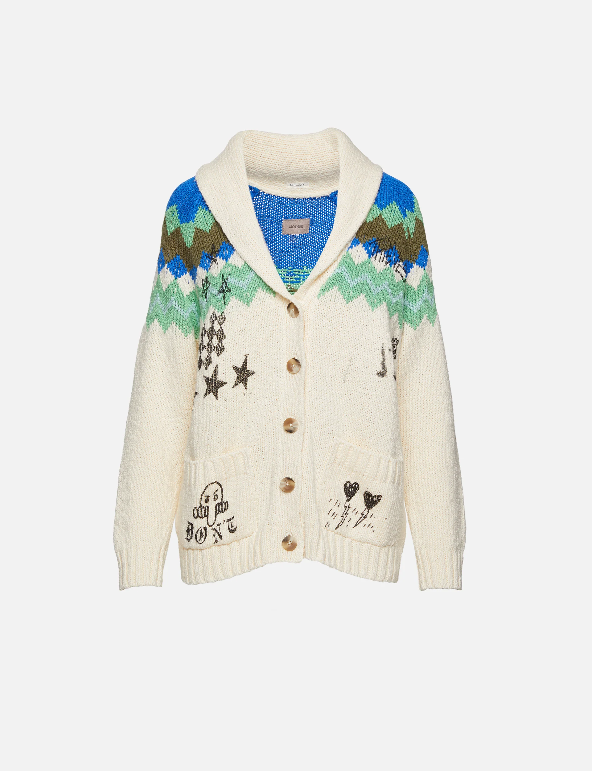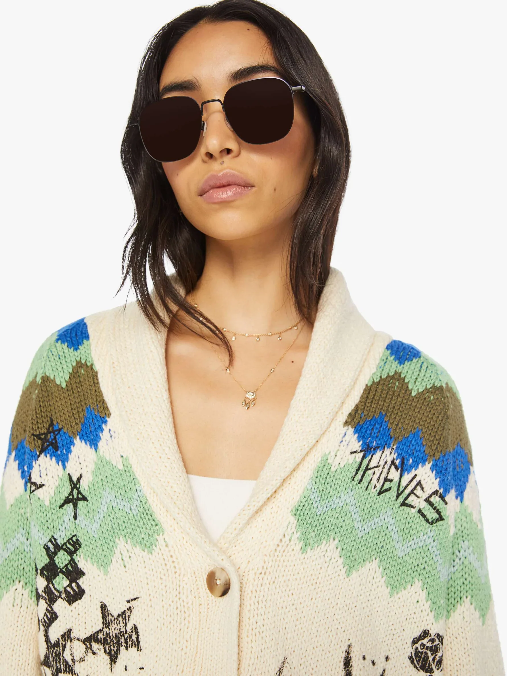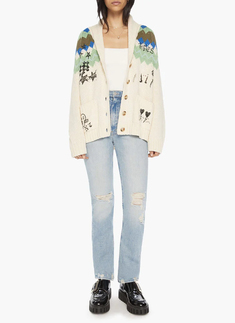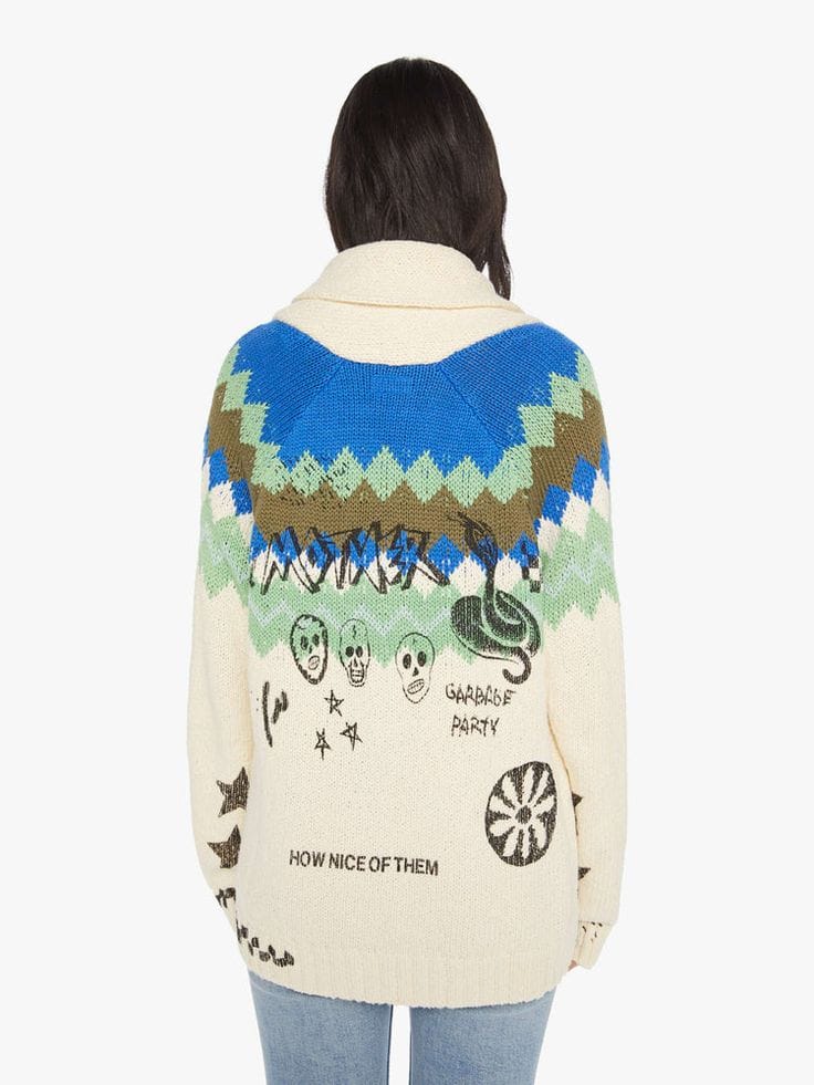 The Mother Shawl Collar Cardigan Graffiti Country flaunts a playful Wild West-inspired print that will instantly elevate your style. Knit from a cotton-viscose blend, this open-front cardigan features an oversized silhouette with knit graffiti detailing and features a shawl lapel, drop sleeves, and an adjustable waist belt. Style yours with bootcut denim.