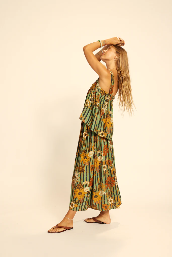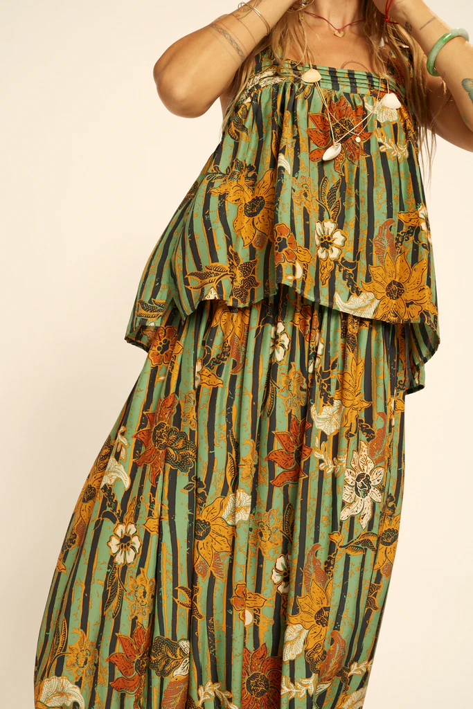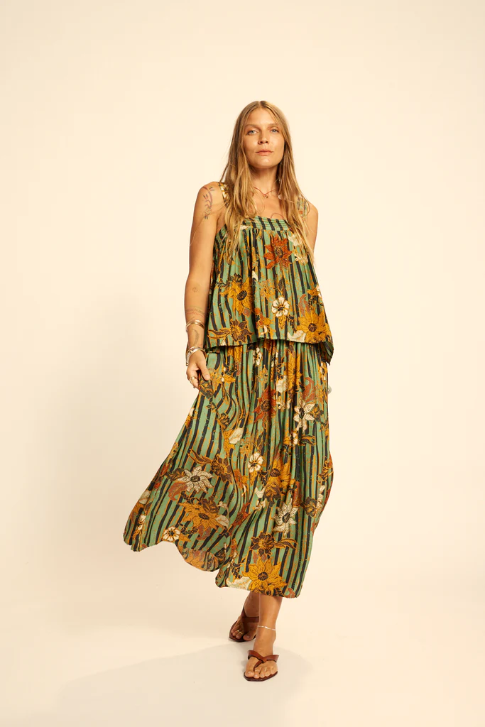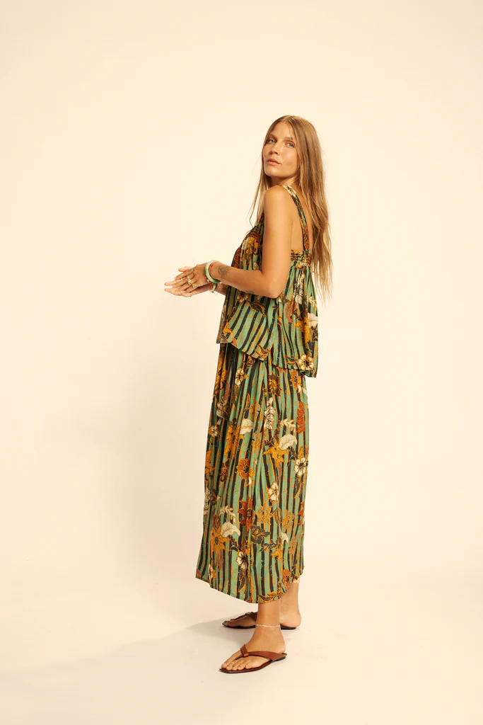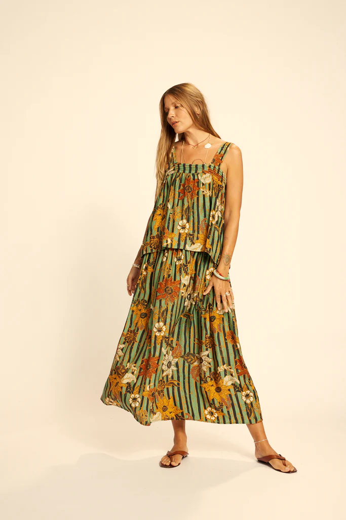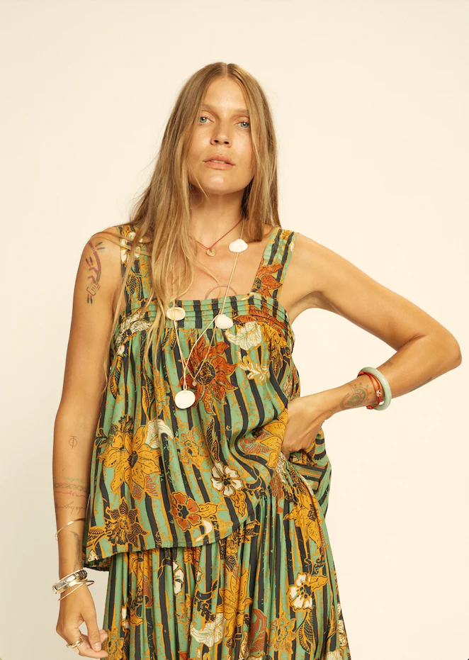 The Natalie Martin Jasmine Top Moss Green Sunflower stripe moss green is a sleeveless, flowy top with thick straps. The top features a button closure at the back and will quickly become your most unique statement top.