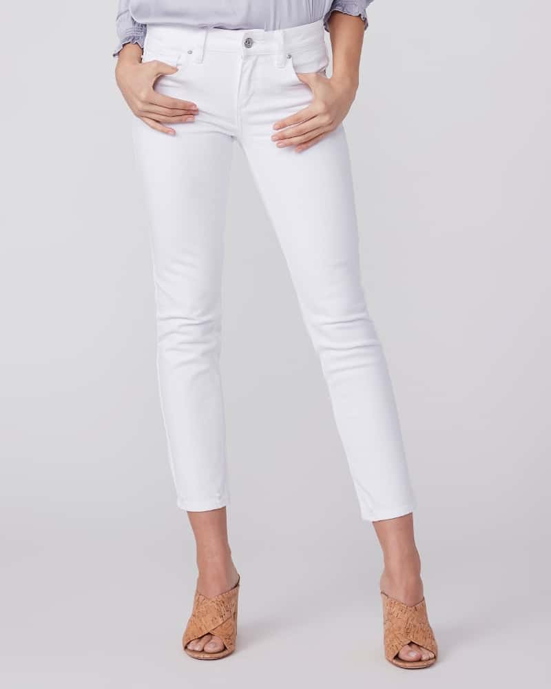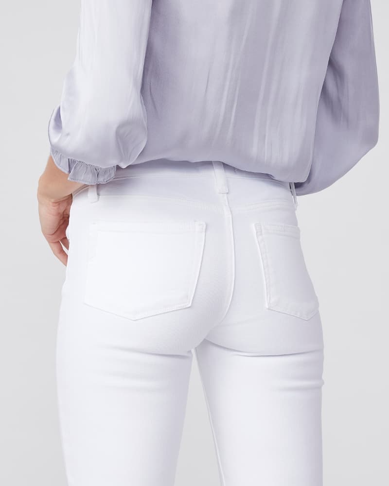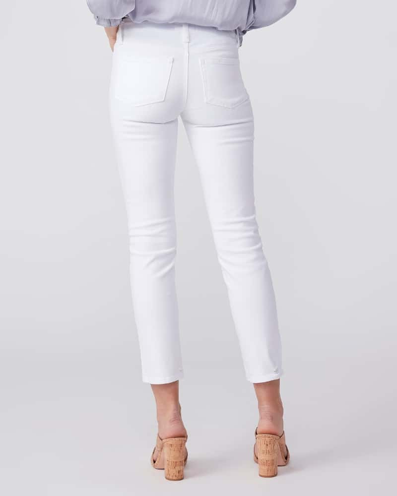 The Paige Amber straight leg jeans in crisp white are a mid rise jean made from the brand's comfort stretch fabric. The ankle length style is perfect for summer and the straight leg helps to create a flattering silhouette. These jeans are definitely a wardrobe must have that will look great dressed up or with trainers during the day.