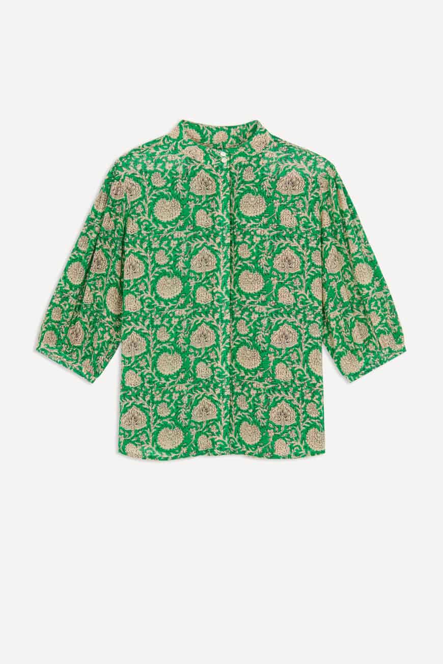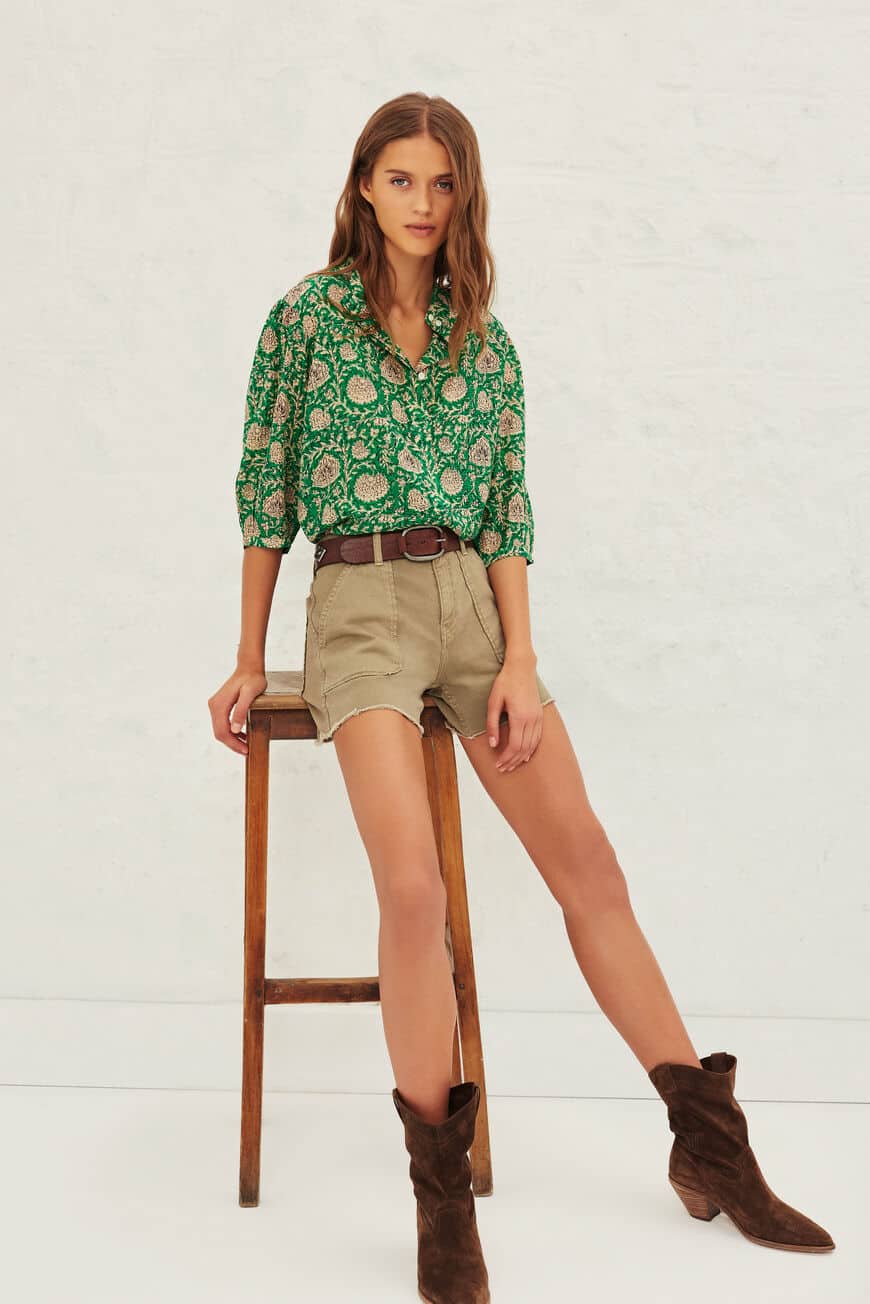 The BA&SH Panama print blouse in vert is a stunning silk and viscose mix blouse with a crew neck and button fastening down the centre front and at the cuffs. The beautiful vibrant green hue is the perfect way to add colour to your summer wardrobe.