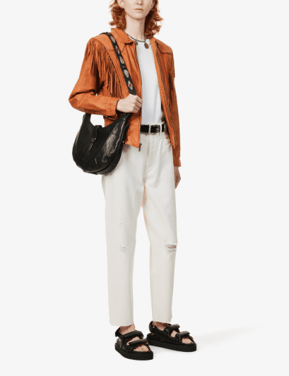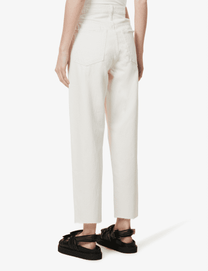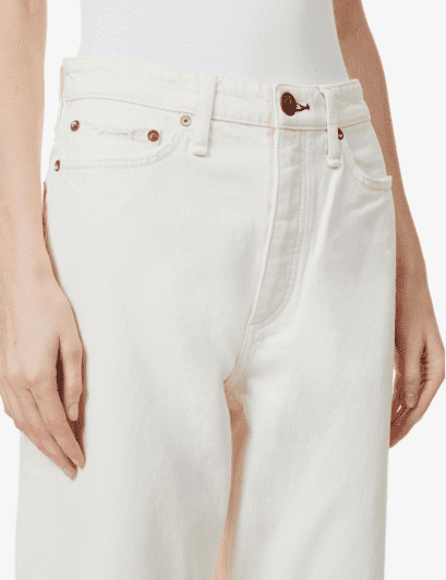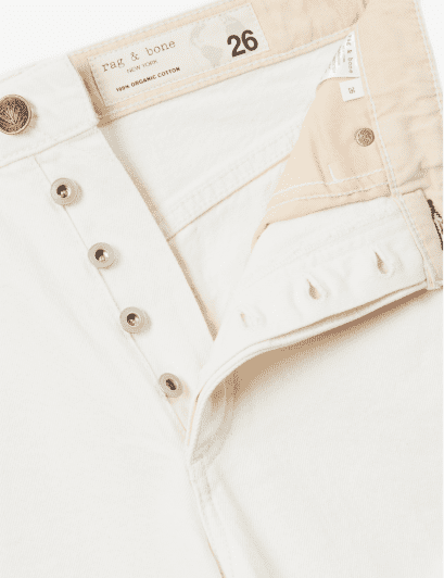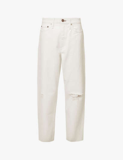 The Rag & Bone Alissa High Rise Barrel Leg Jeans Ecru with Holes are a classic light jean. Featuring a regular-fit, high-rise, tapered leg, belt loops, branded hardware, five pockets. These jeans boast distressed panels at front, all-over twill texture, brand patch at back, V-shaped yoke at back, partially lined, raw hems.