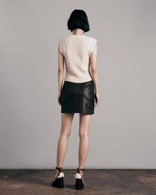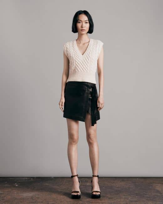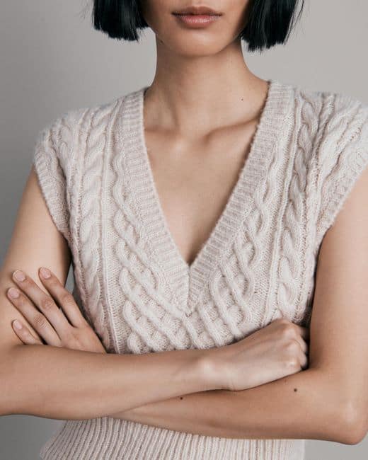 The Rag & Bone Elizabeth Cable Vest Ivory is a slim, cable-knit vest. This wool and alpaca blend jumper vest has all of the weight and none of the bulk making it your cold-weather go-to. Wear alone, layered over a button-down or long sleeve shirt.