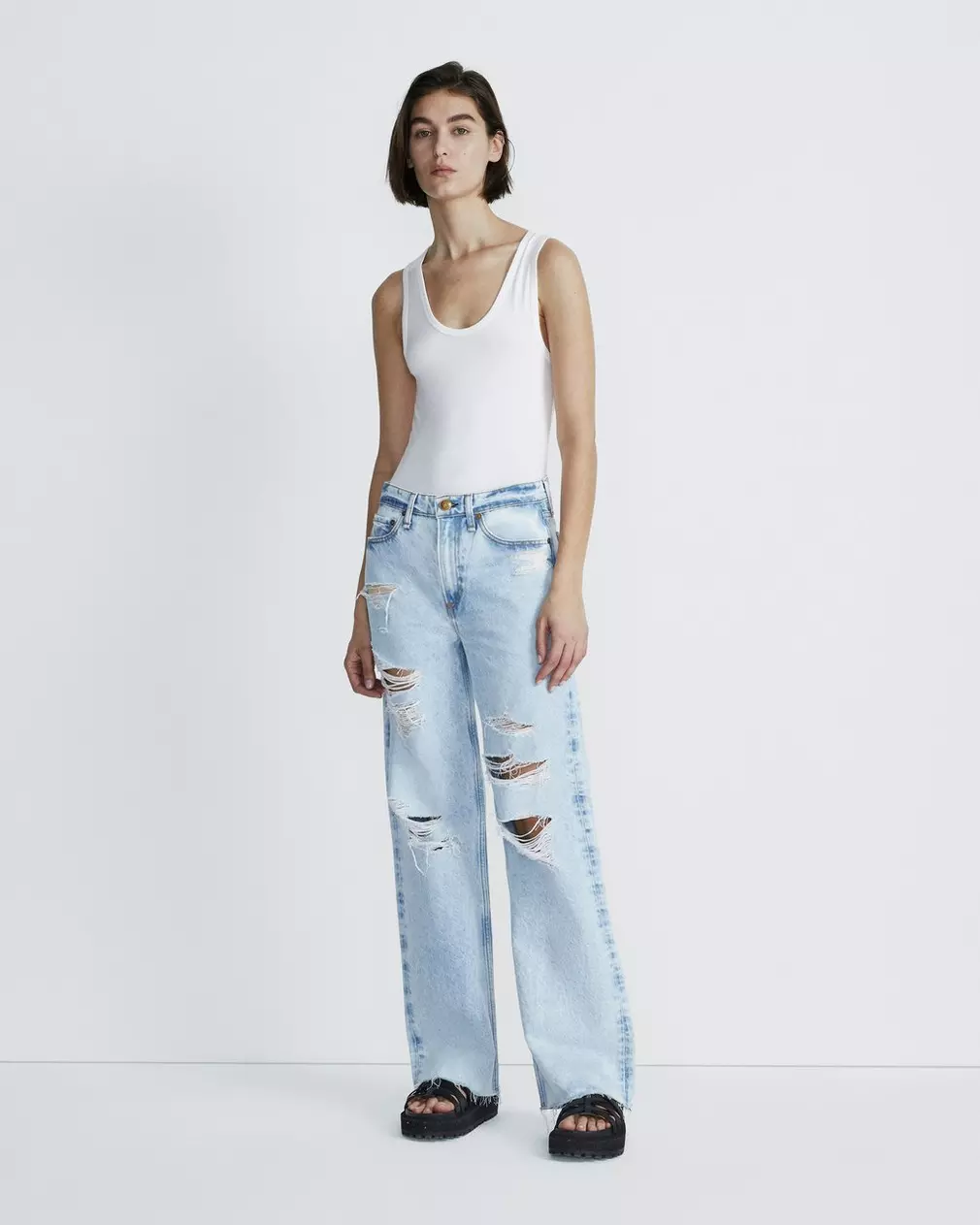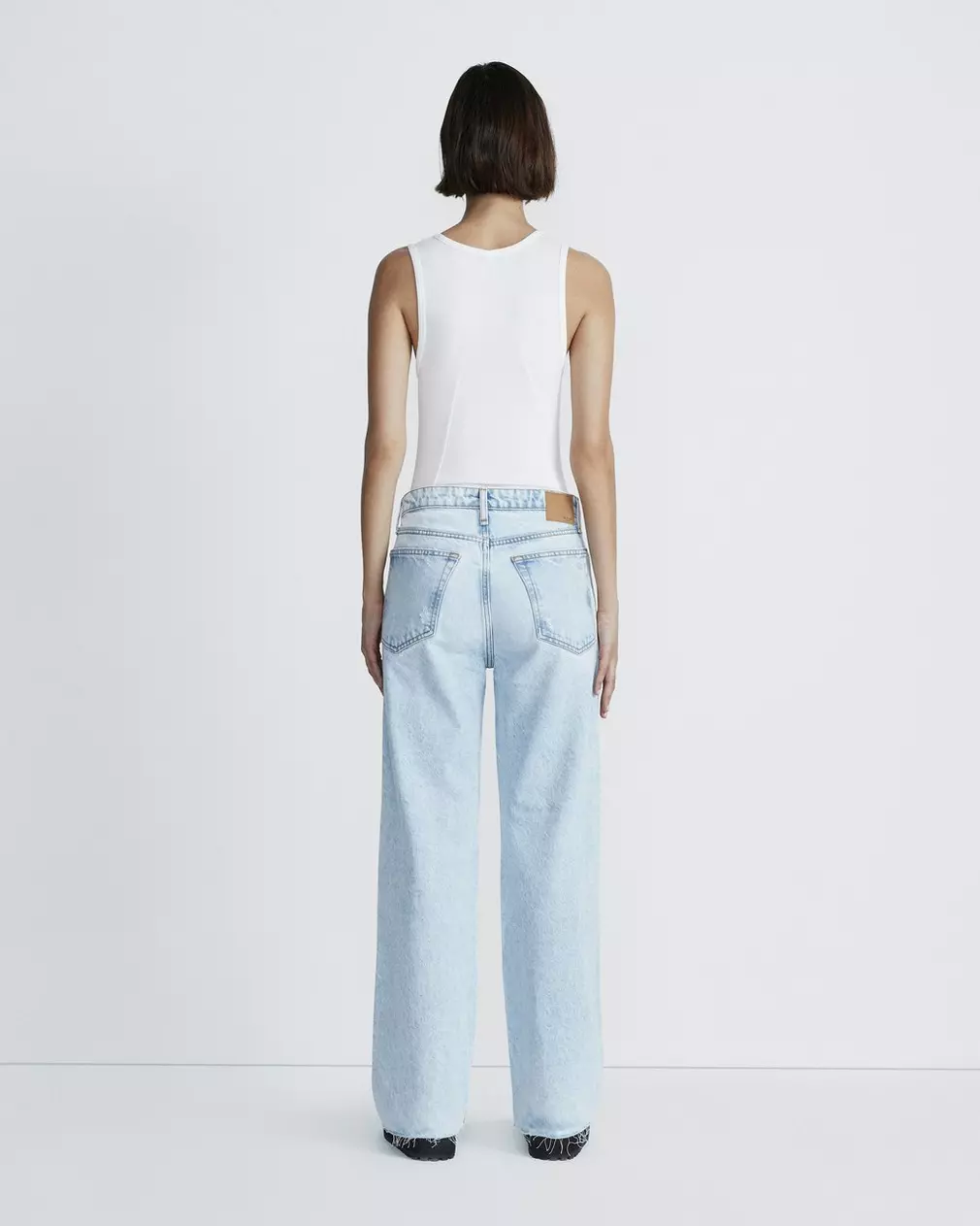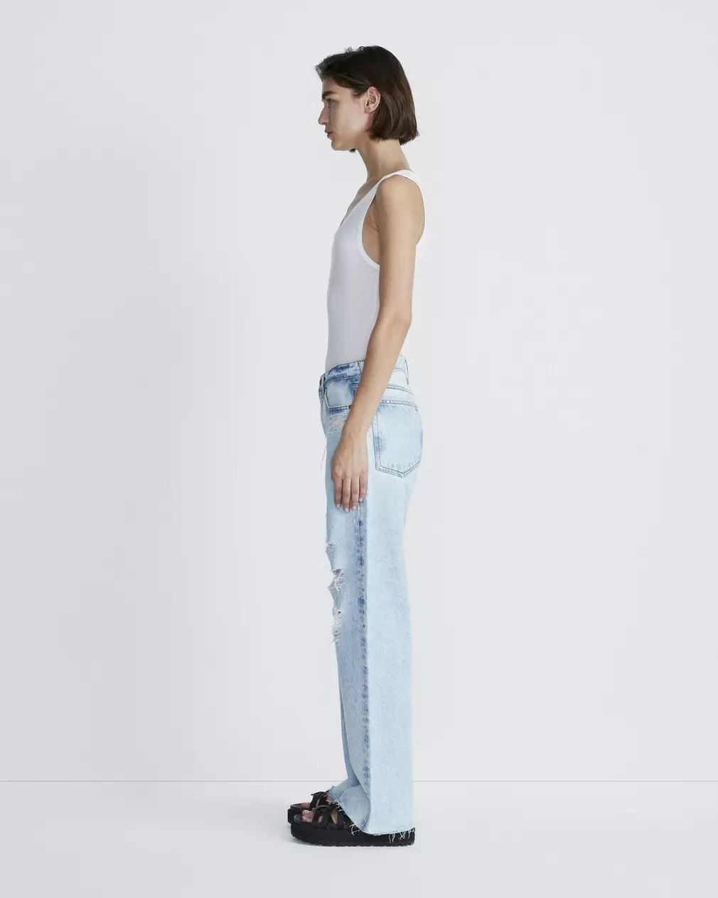 The Rag & Bone Logan coral Mid Rise Wide Leg Coral are roomy through the hip and thigh. Hint from the r&b offices: take your natural size and wear low on your waist for a relaxed look or size down for a higher rise. Crafted in our rigid denim. In Coral, a distressed, light indigo.