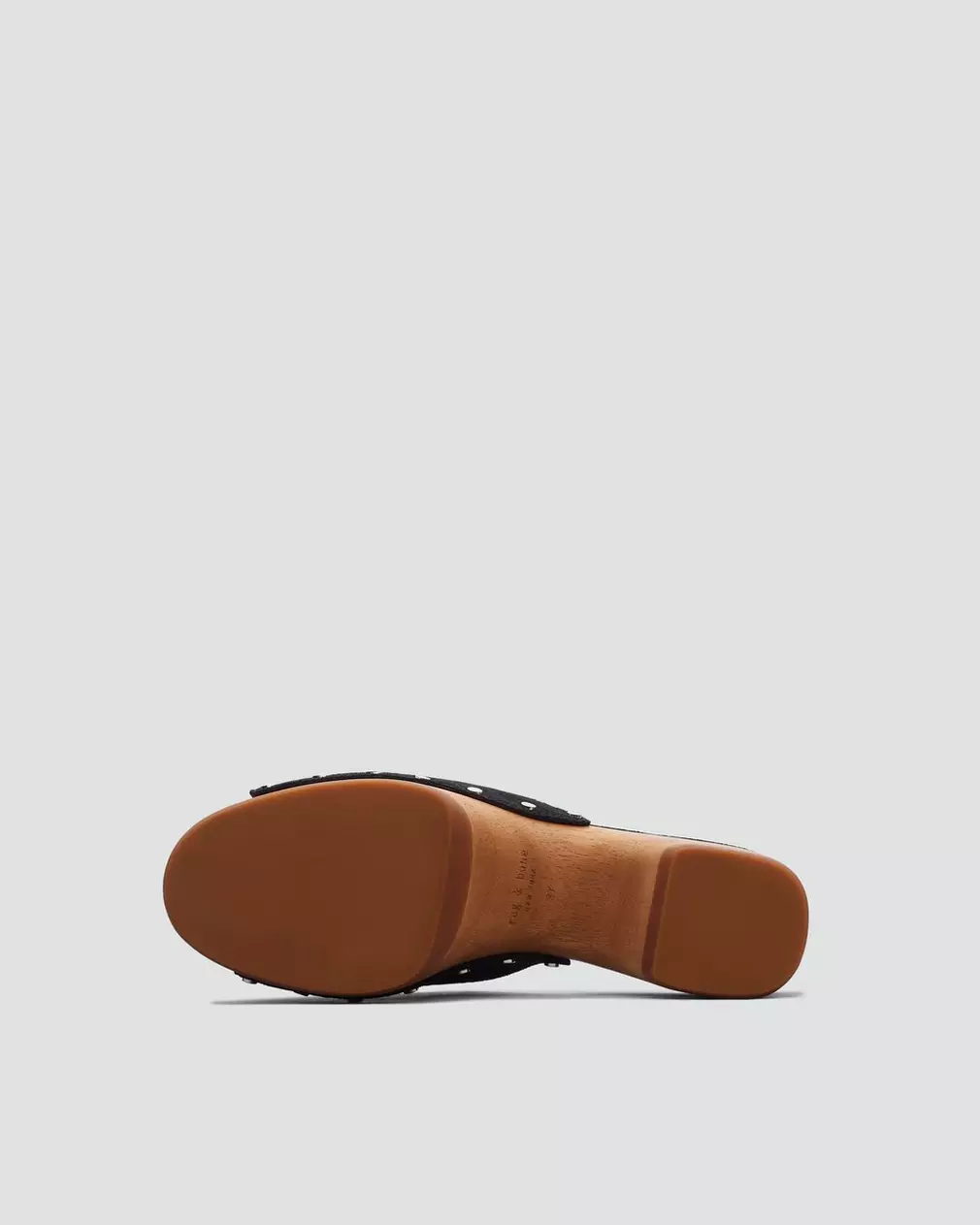 The Rag & Bone Mara Clog Slide Black Suede is a wooden clog sandal with 2" heel for comfortable wear. Crafted from suede and punctuated with studs these are the perfect shoe to wear with your denim for an effortlessly stylish look.