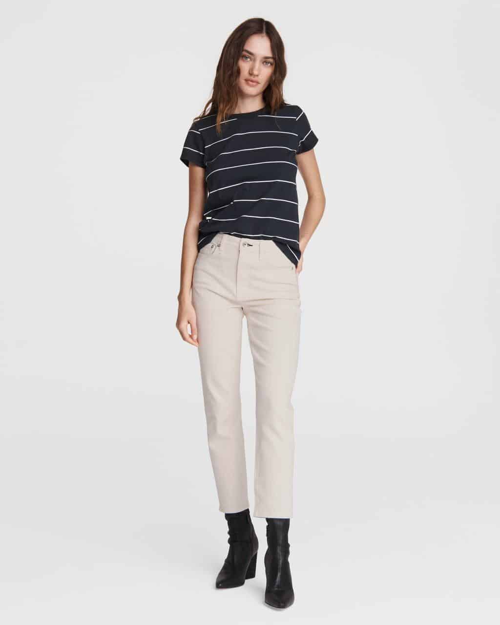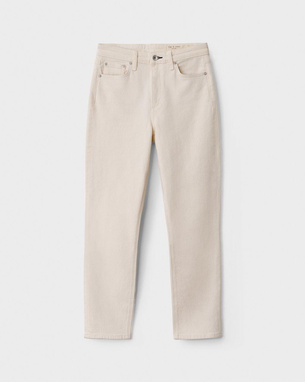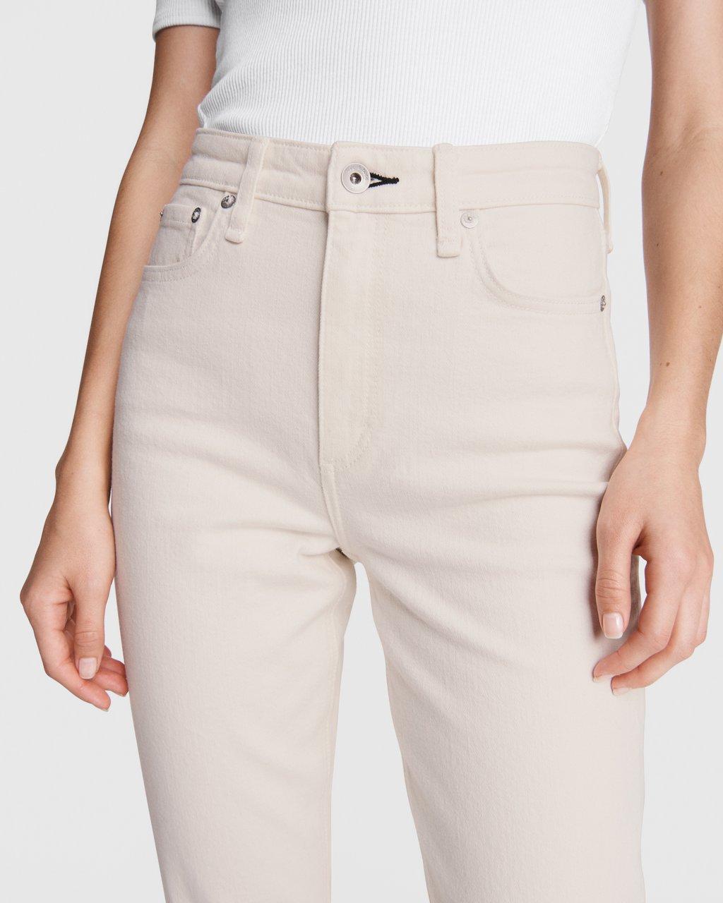 The Rag & Bone Nina high rise ankle cigarette in ecru are a gorgeous high rise, cropped ankle jean with a finished hem and flattering cigarette fit. The ecru colour is a great way of lightening your denim for summer and a stylish alternative to blue denim. Team with a shirt for the perfect pulled together look or wear with a t-shirt and sandals for an easy summer style.
