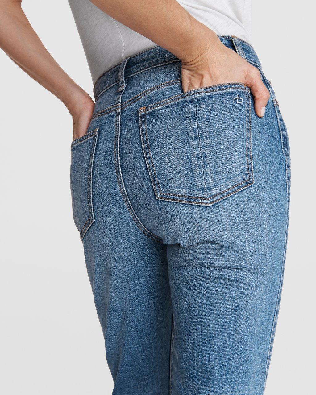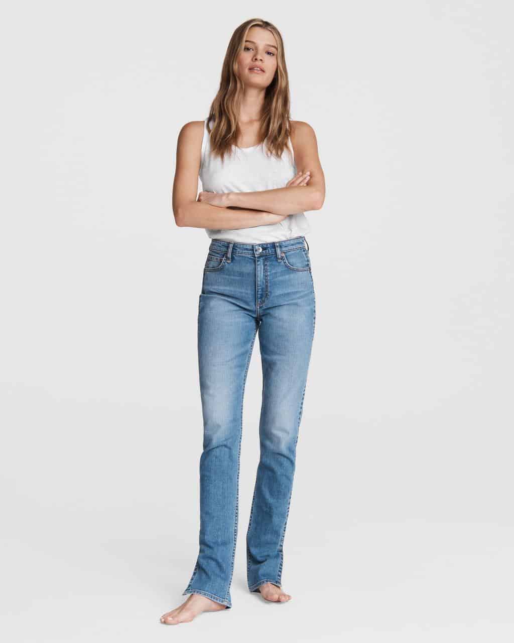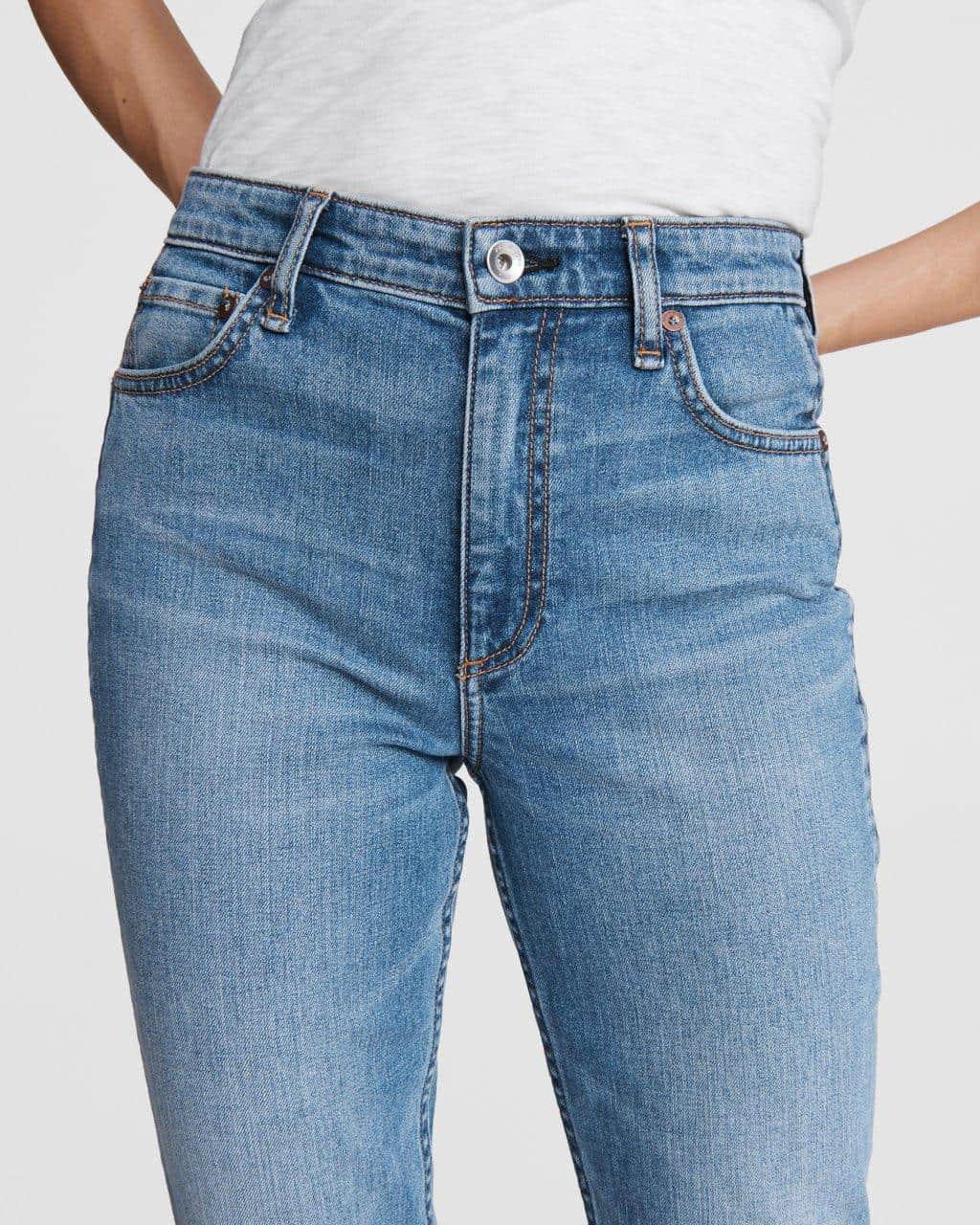 The Rag & Bone Nina high rise cigarette is a straight leg jean that is crafted from high-quality Italian stretch denim. With a clean hem, zip fly and a slim fitting leg with a slit at the bottom of the hem, these jeans create an elongated silhouette. Wear them with sandals and a t-shirt during the day and then with heels and a blouse in the evening.