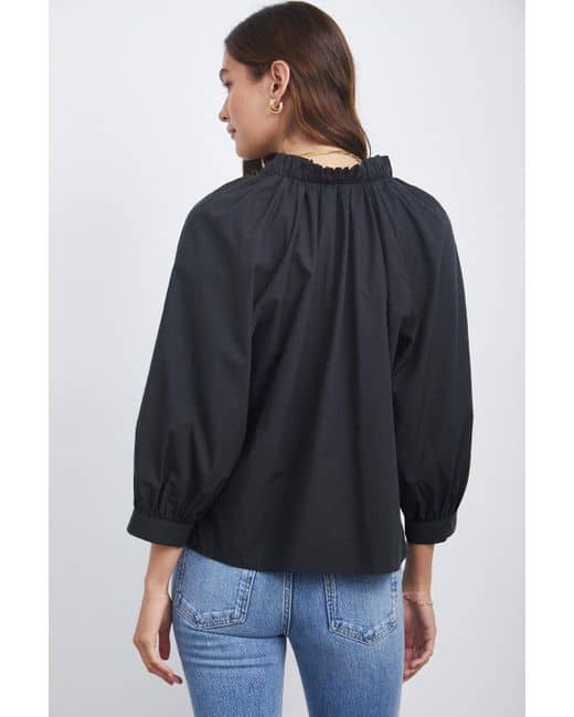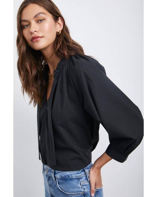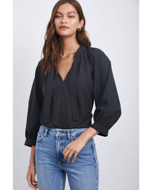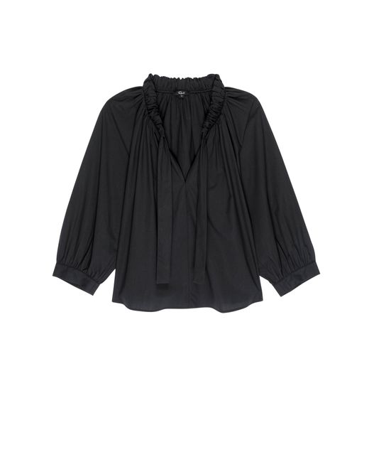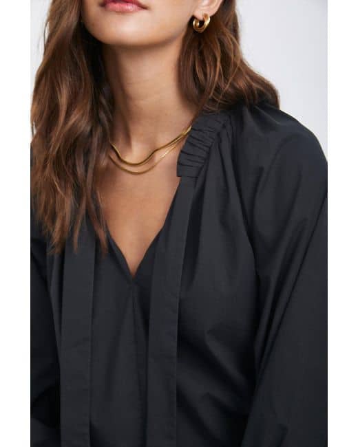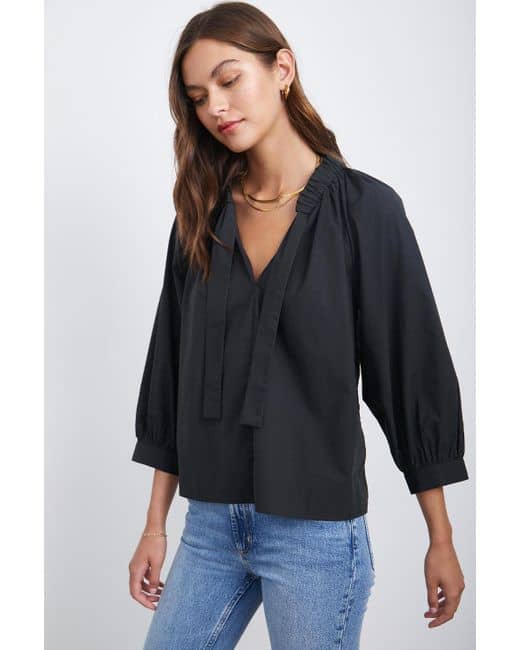 The Rails Amal Blouse Black is a pretty pullover top. Made in an easy to wear black and crafted from crisp cotton poplin, this top features a wide encased neck tie, raglan sleeves and a flattering v neck. A perfect option to throw on with your favourite denim when in a rush but still want to look effortless!