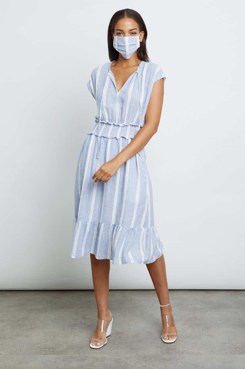 The Ashlyn Dress in Levanzo Stripe is a cap sleeve, midi-length, lightweight linen dress with blue and white stripes, silver metallic Lurex threading detail, self-tie keyhole neckline, smocked waistline, and flowy tiered skirt. Pullover style allows for easy wearability while still keeping feminine appeal.