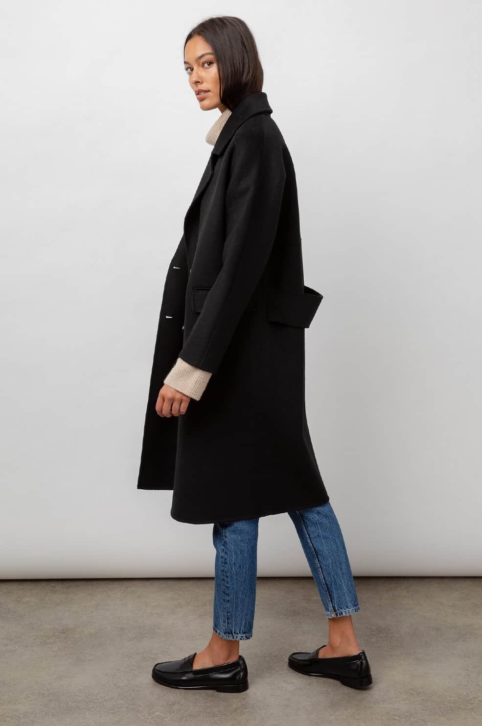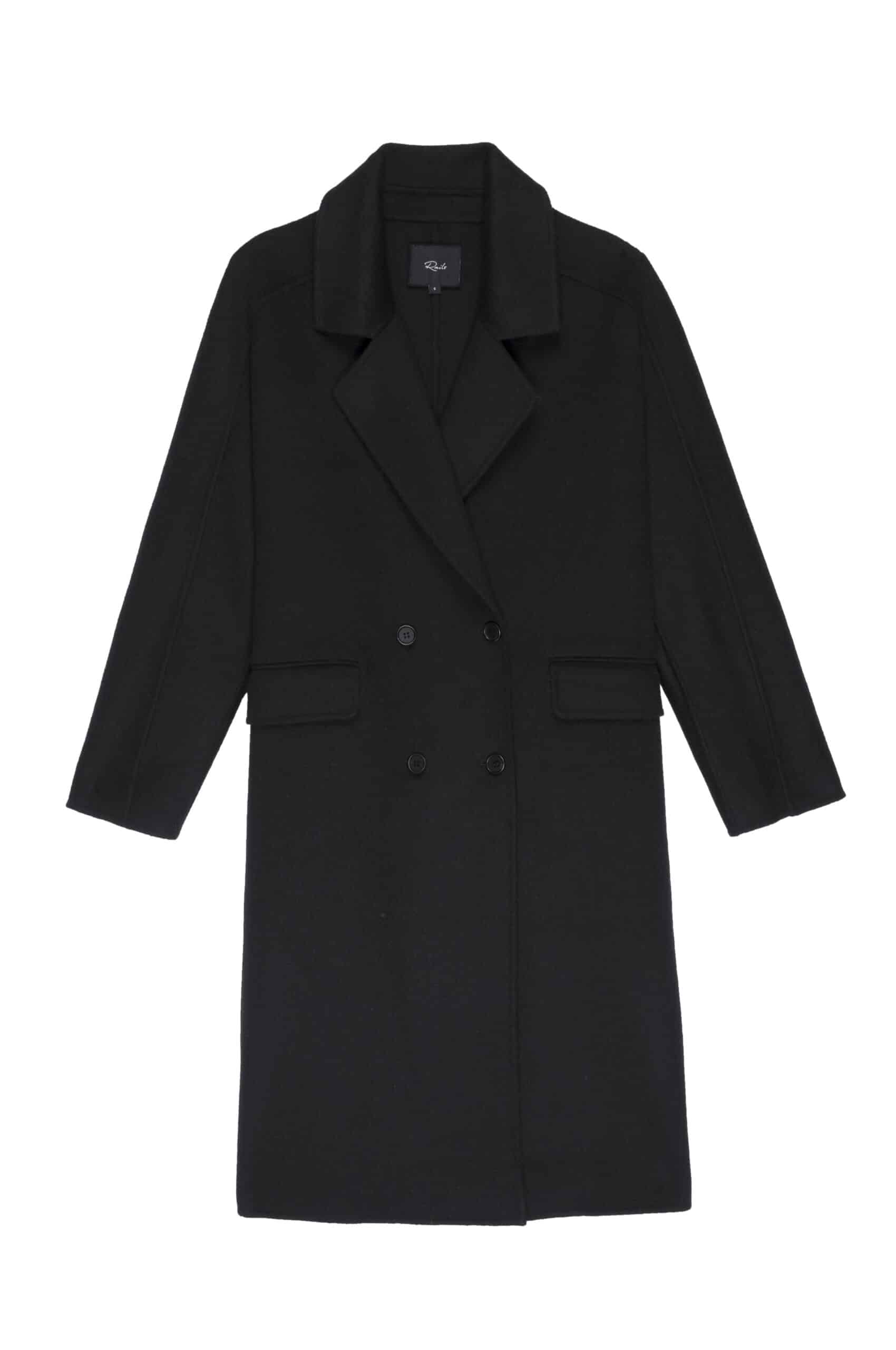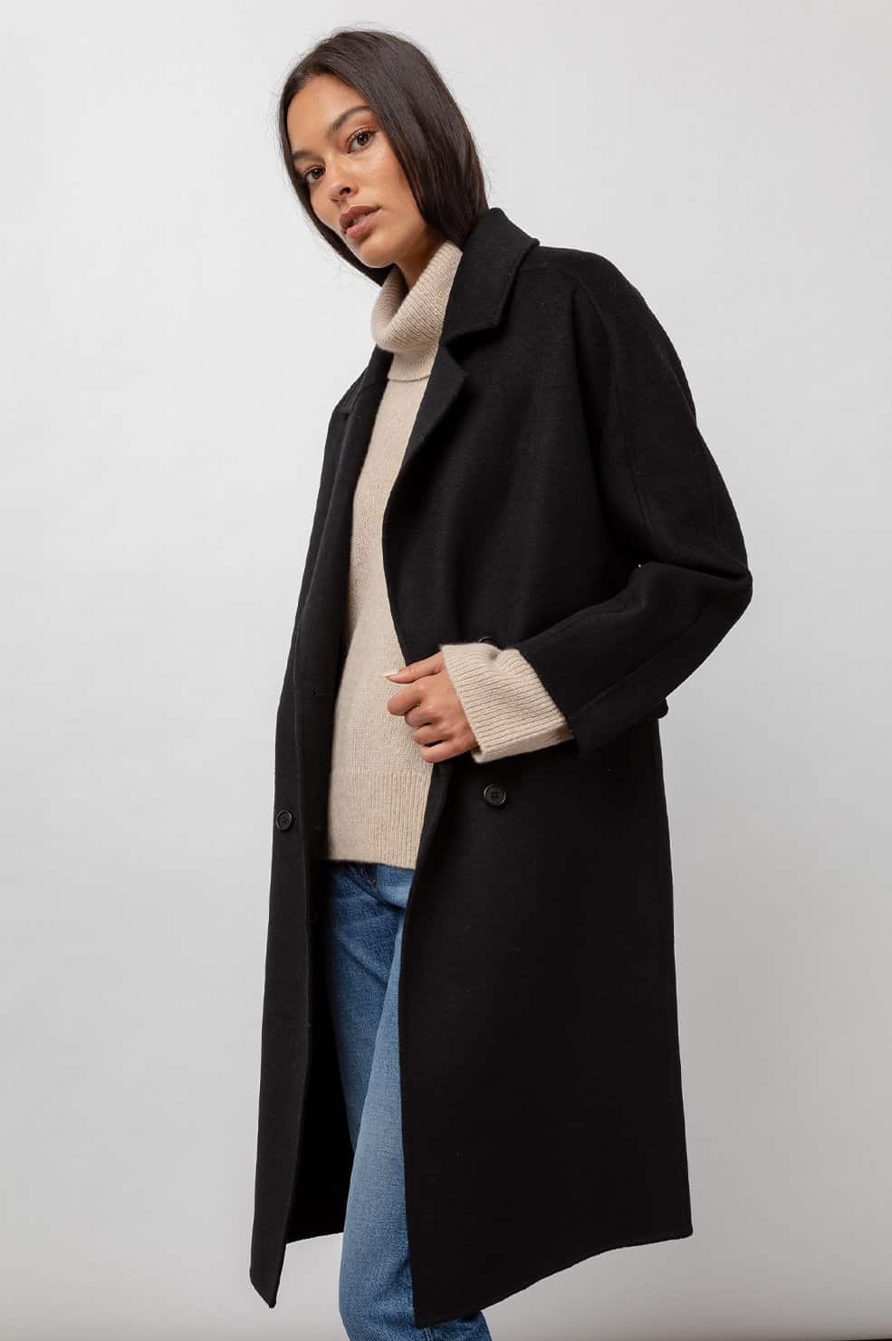 The Rails Bristol Coat in black is an absolutely stunning, wool blend, unlined, double breasted coat in a classic black. The coat has a tailored fit and four-button front closure with horn buttons and a belted back. This luxurious menswear inspired coat is the perfect addition to any wardrobe and is guaranteed to elevate your outfit. Style over sweatpants and a sweater to add a bit of luxury to your casual outfit.