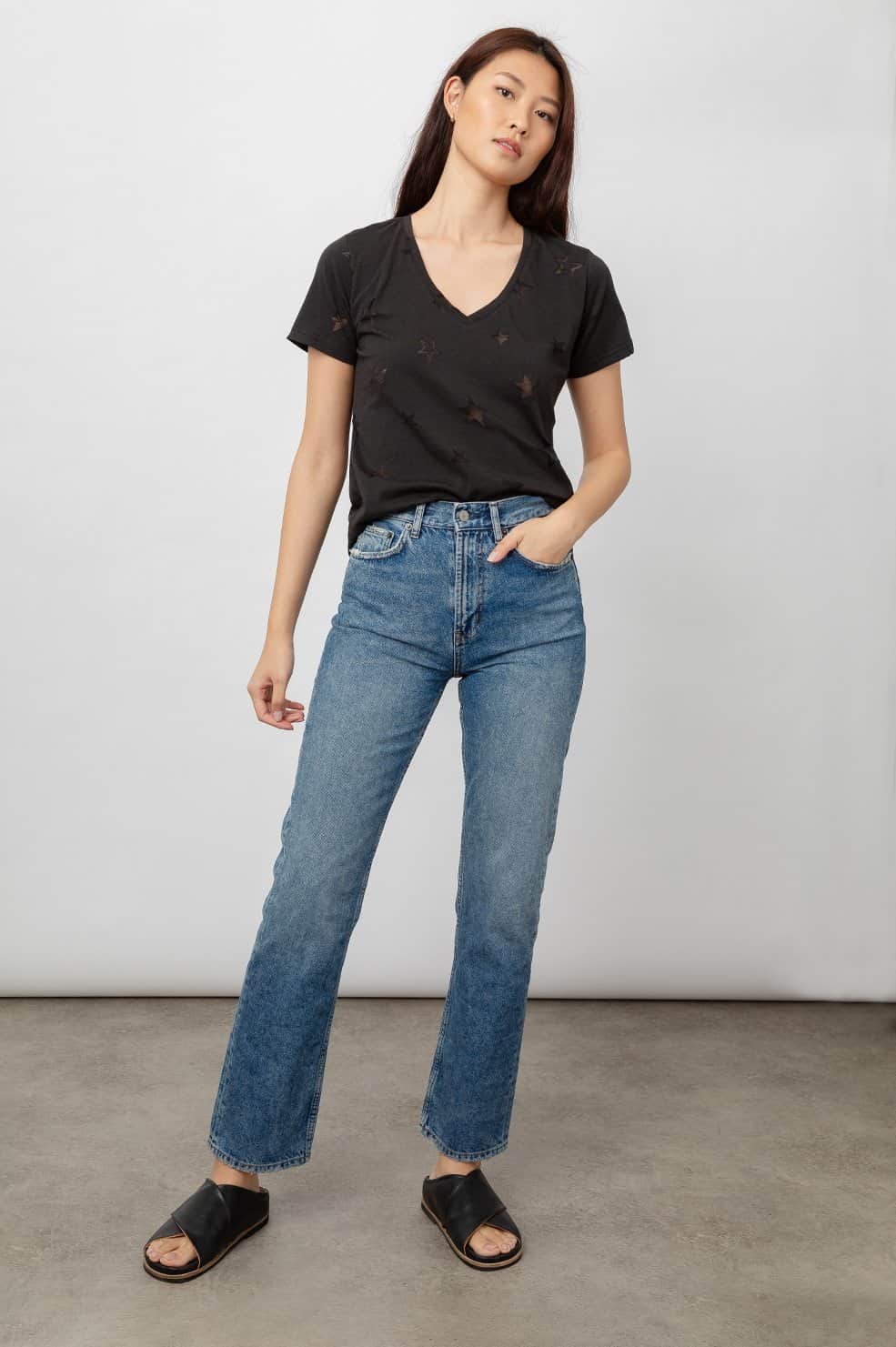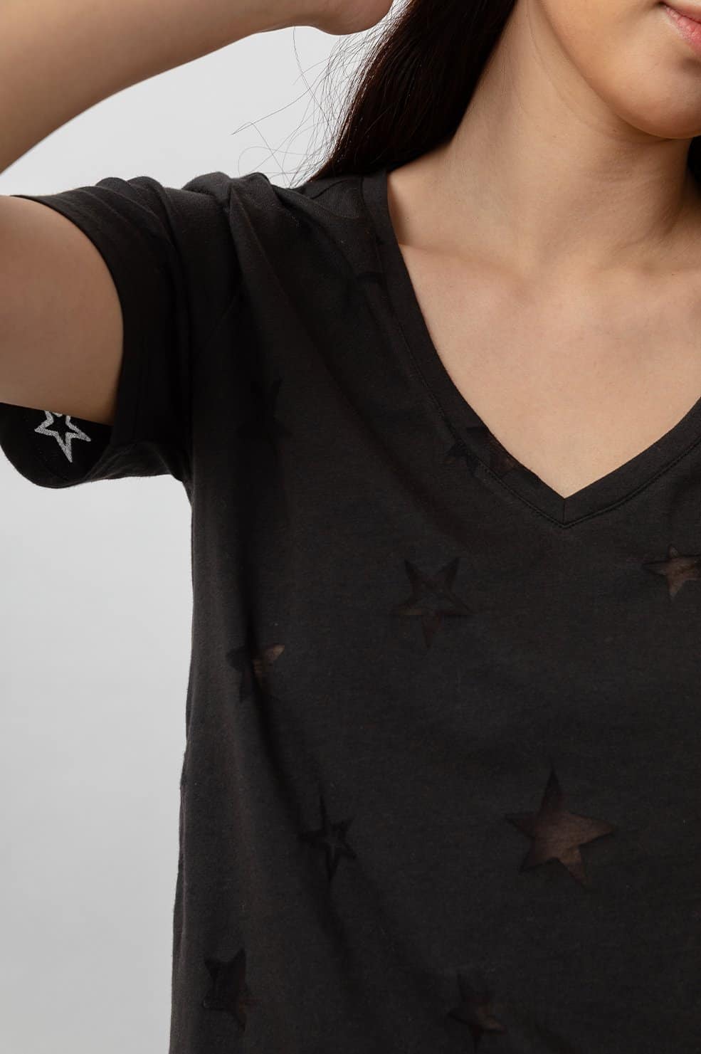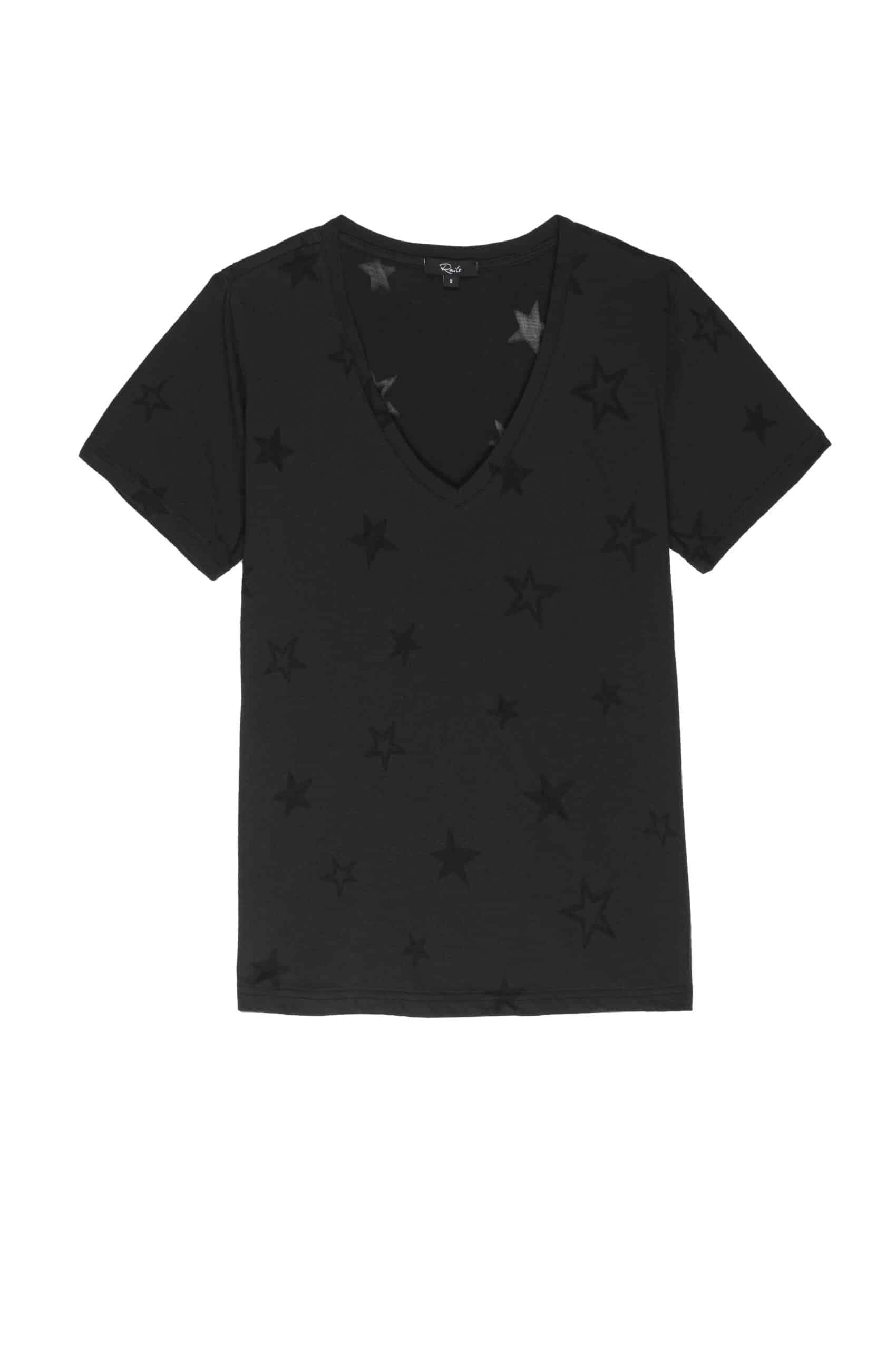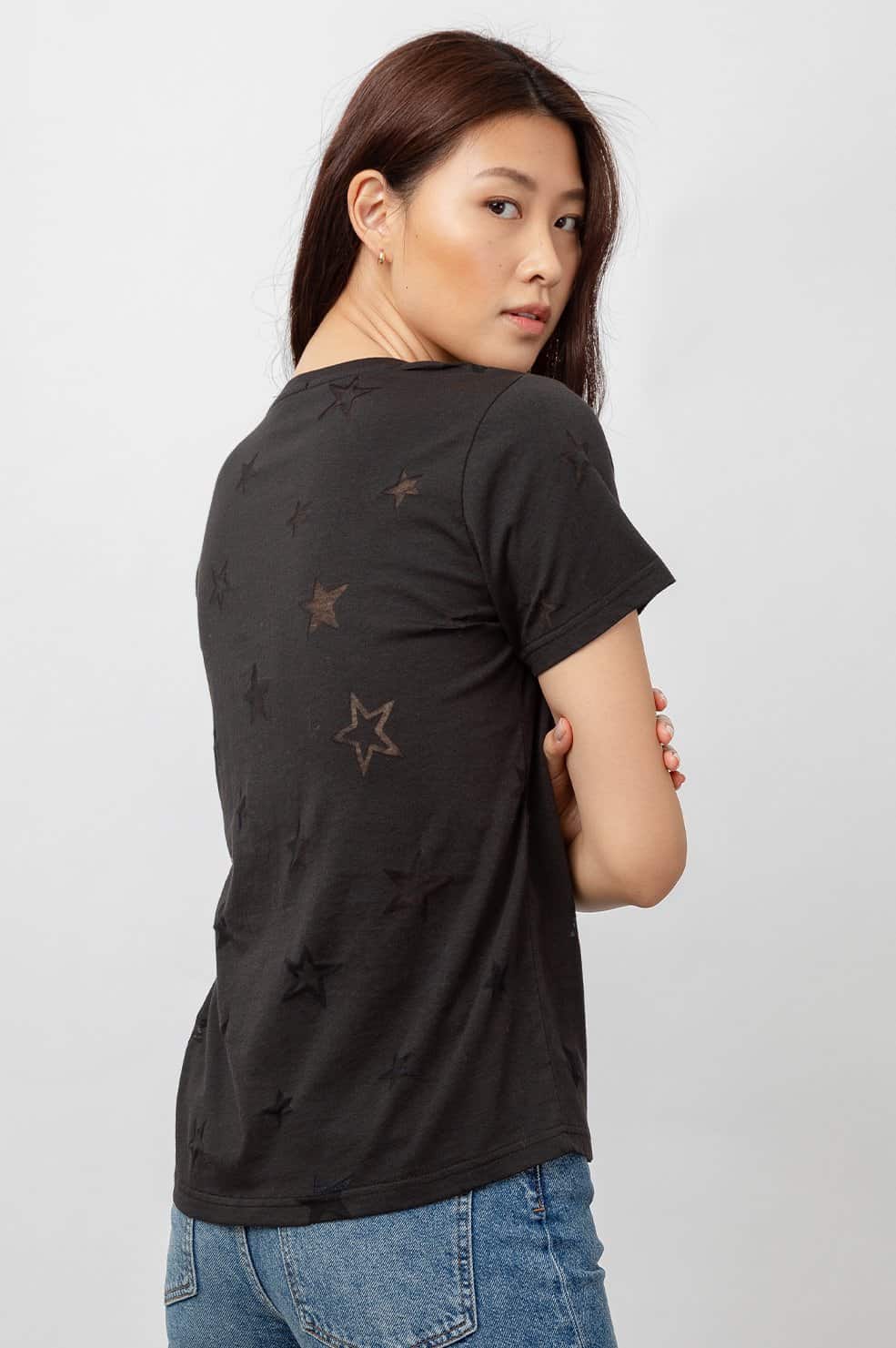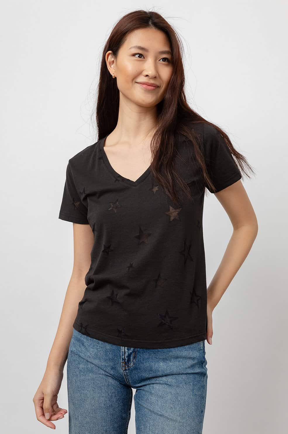 This Cara V T-Shirt in black star burnout is a lightweight, short sleeve, v-neck printed t-shirt. An easy tee for everyday wear featuring a burnout star design throughout. Great for layering or wearing on its own with a pair of 3x1 jeans for a stylish casual look.