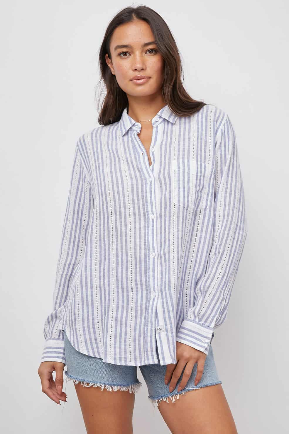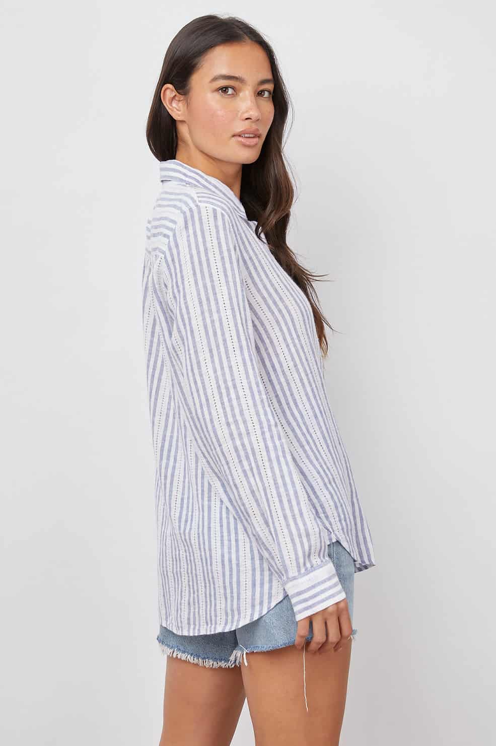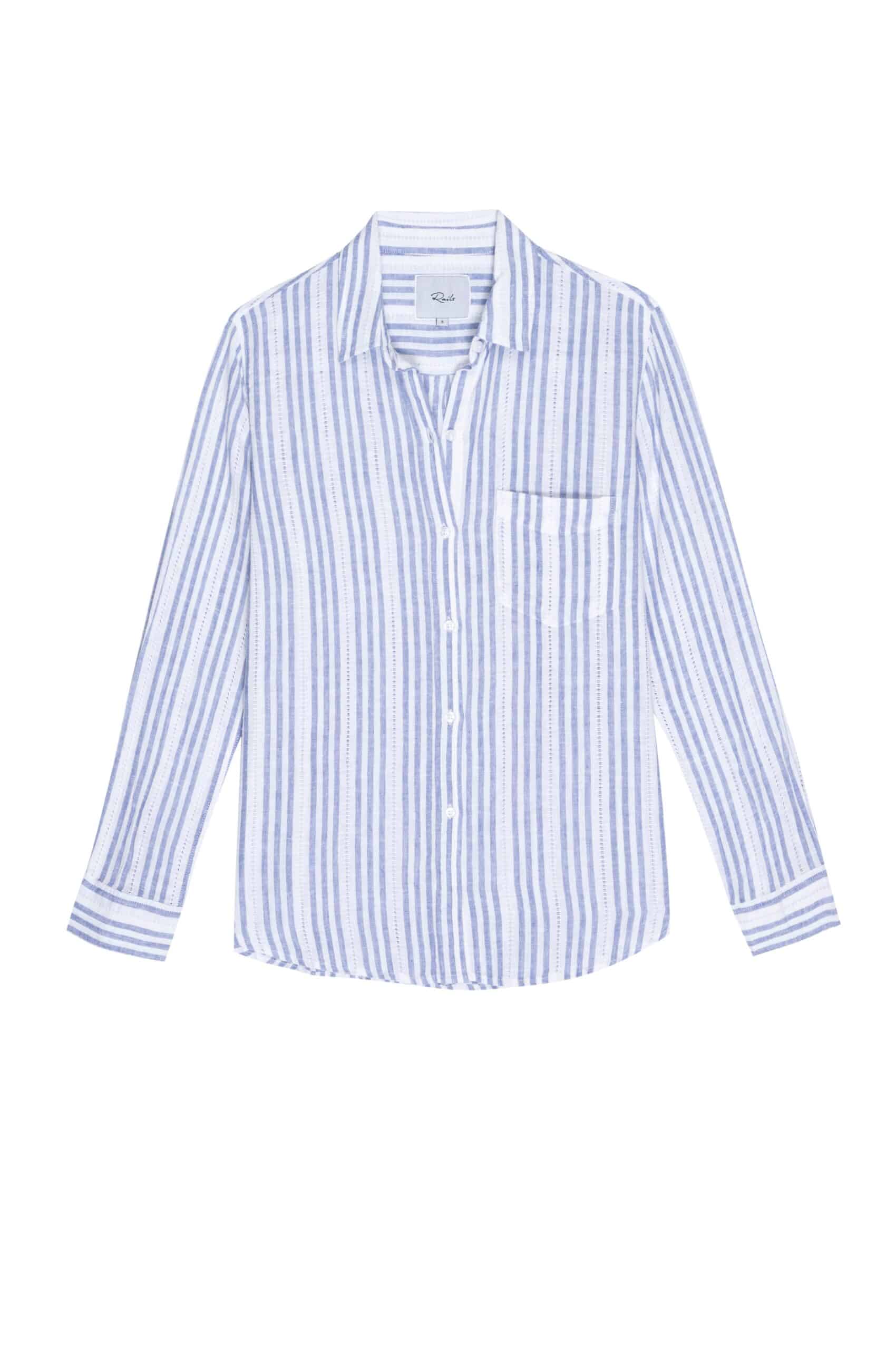 The Rails Charli Shirt in Blue Catalina Stripe is the ideal Southern California-inspired button-down thanks to its light, airy linen fabric and flexible body shape. This clean, white button-down shirt has a relaxed shape, a single patch pocket at the chest, and traditional blue stripes with lace inserts.