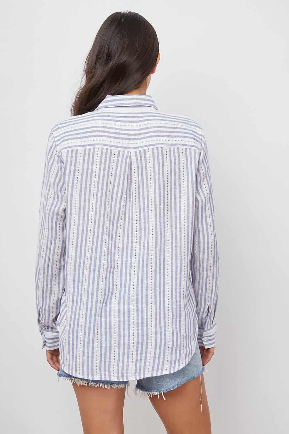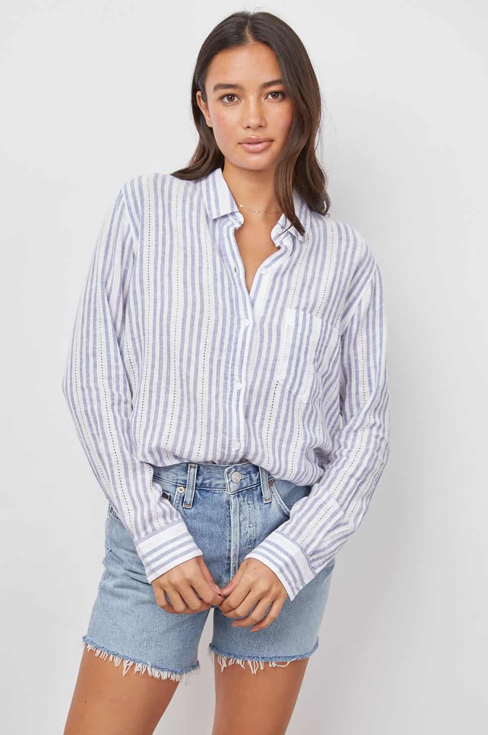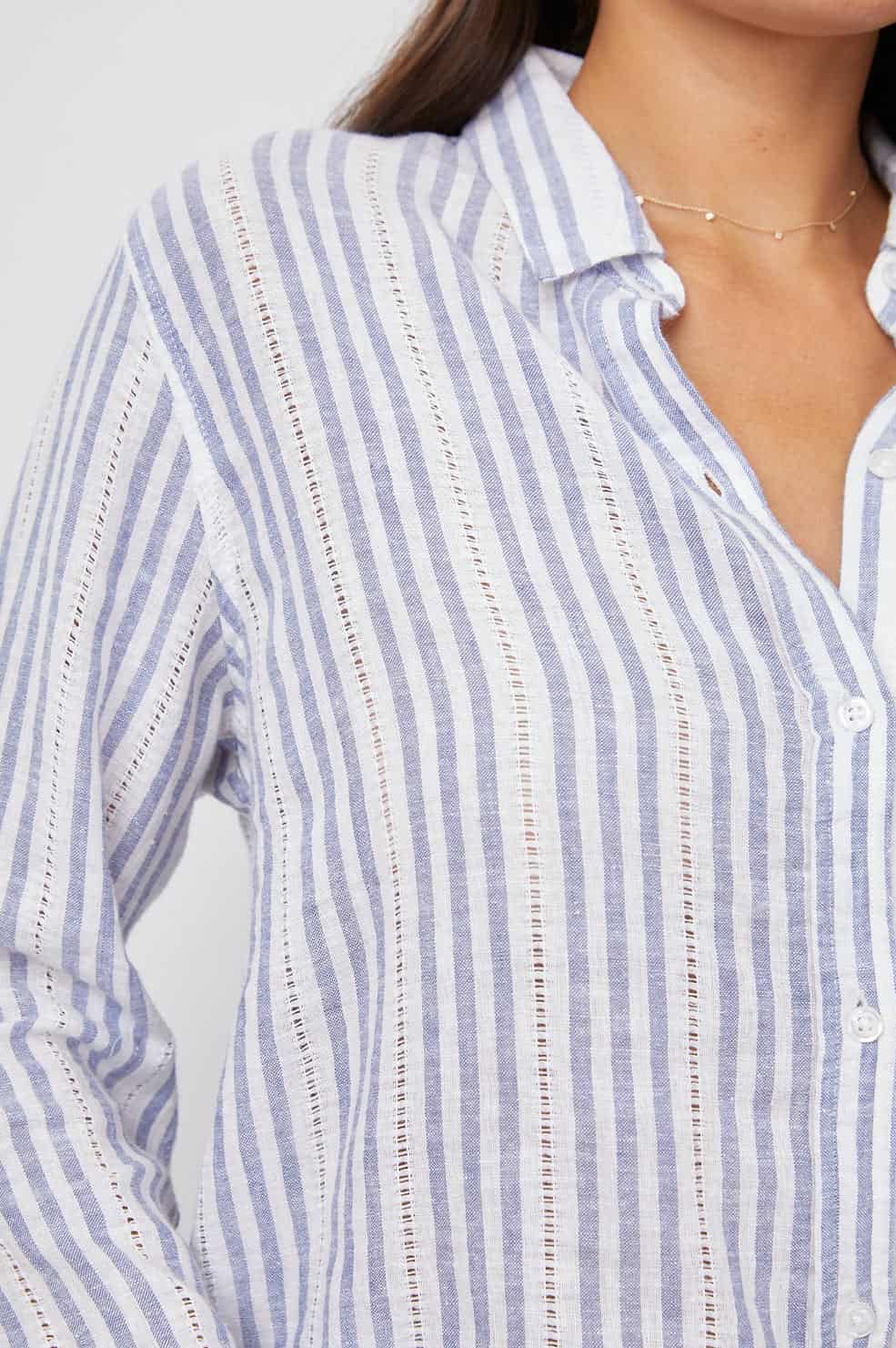The Rails Charli Shirt in Blue Catalina Stripe is the ideal Southern California-inspired button-down thanks to its light, airy linen fabric and flexible body shape. This clean, white button-down shirt has a relaxed shape, a single patch pocket at the chest, and traditional blue stripes with lace inserts.