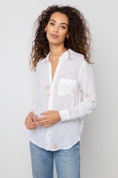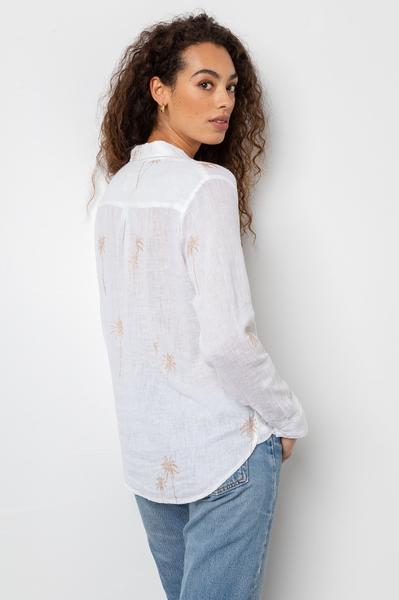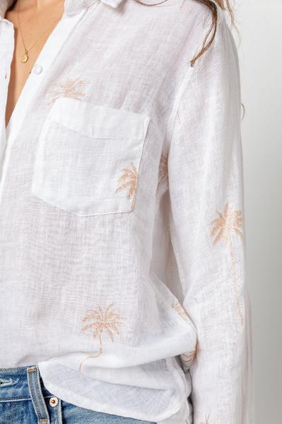 This Rails Charli Shirt in Gold Palm Trees is a long sleeve shirt and features rose gold glitter Palm trees. Long sleeve with a single button cuff.