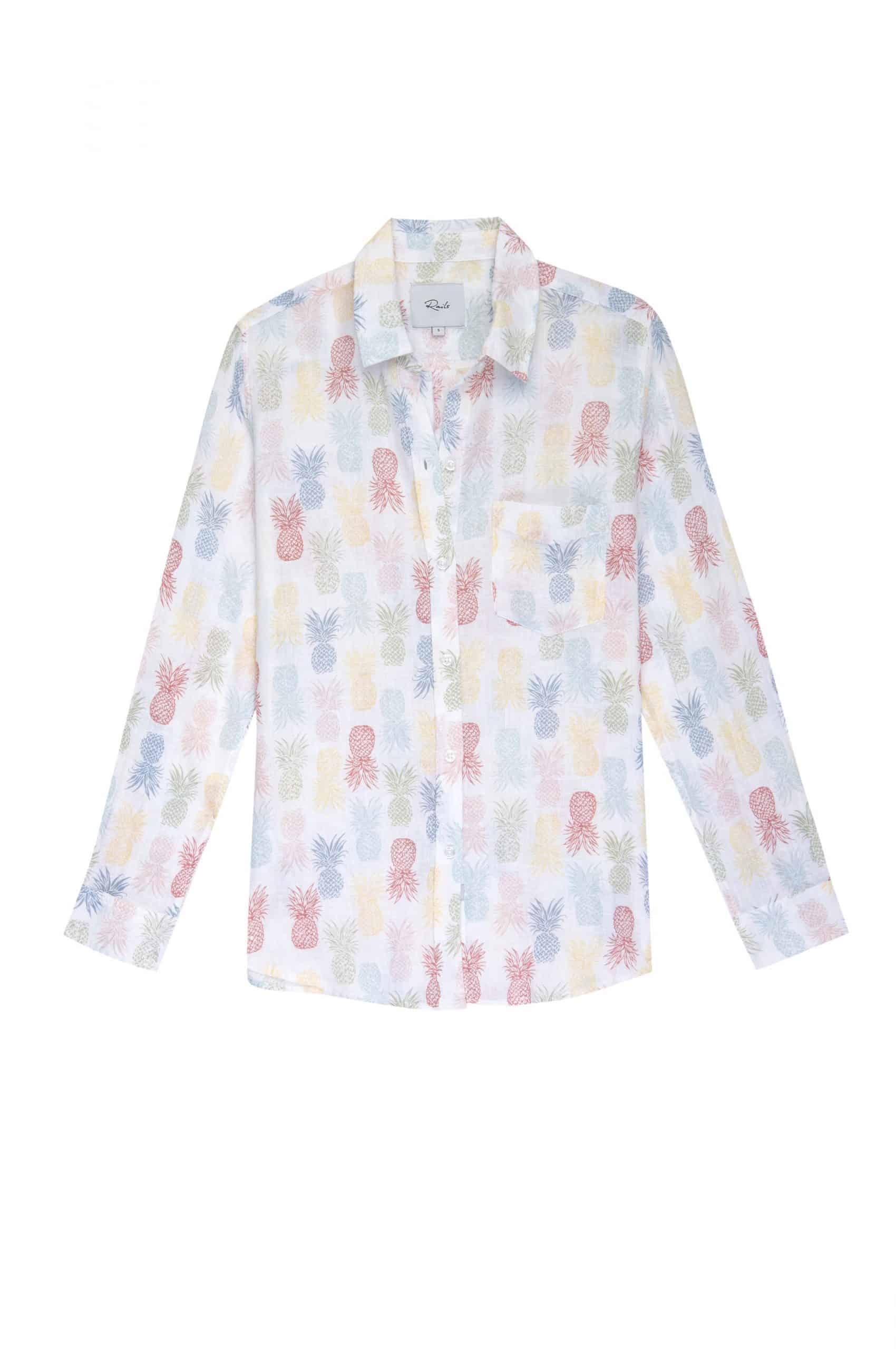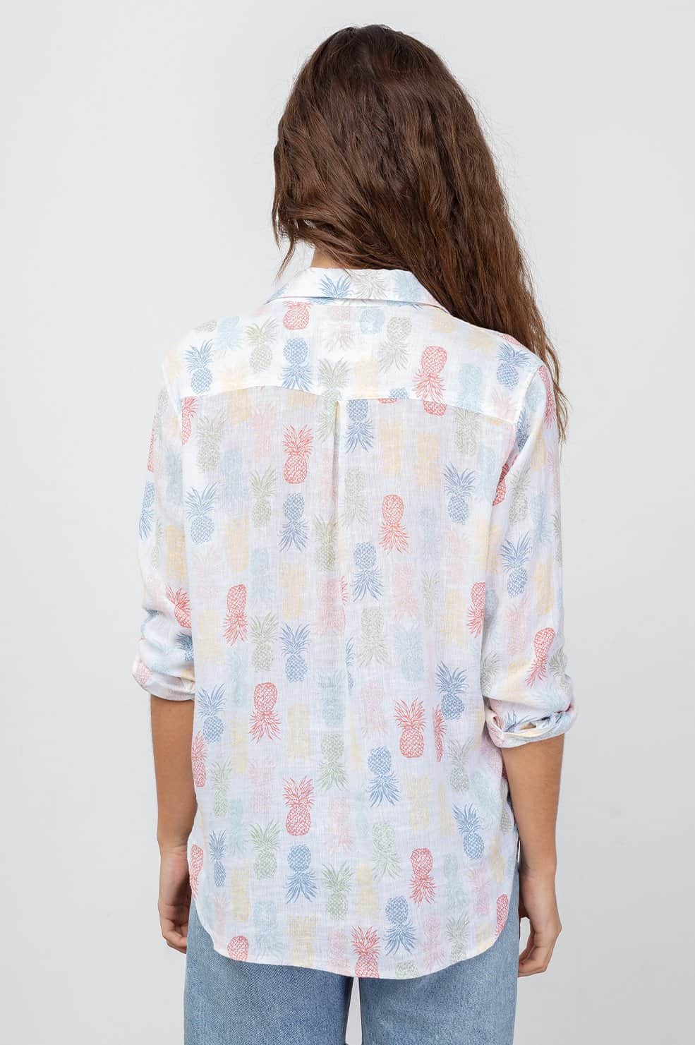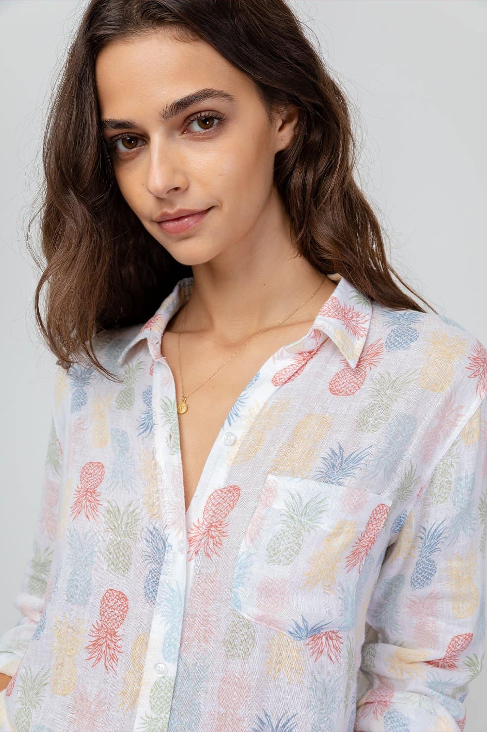 The Charli Shirt in Rainbow Pinas is a long sleeve, button-down top featuring rainbow pineapple print, high-low shirttail hem, and single chest pocket. Lightweight, breezy linen fabric mixed with a relaxed body shape makes the Charli the perfect Southern California inspired button-down.