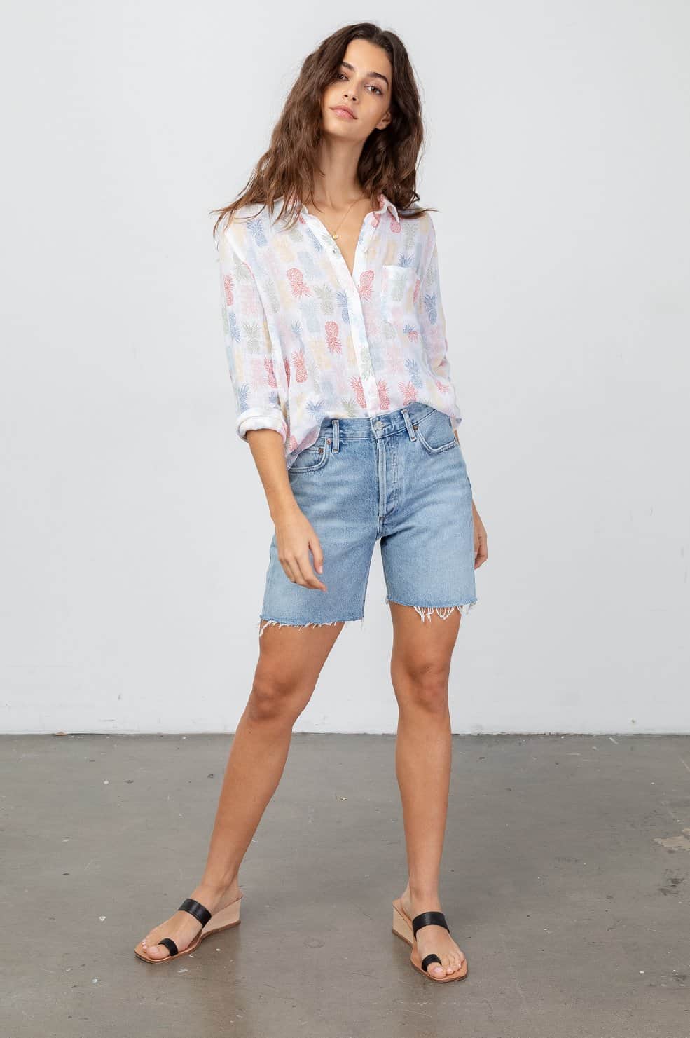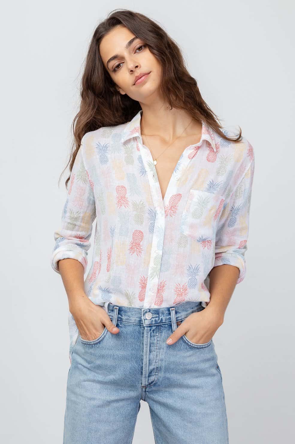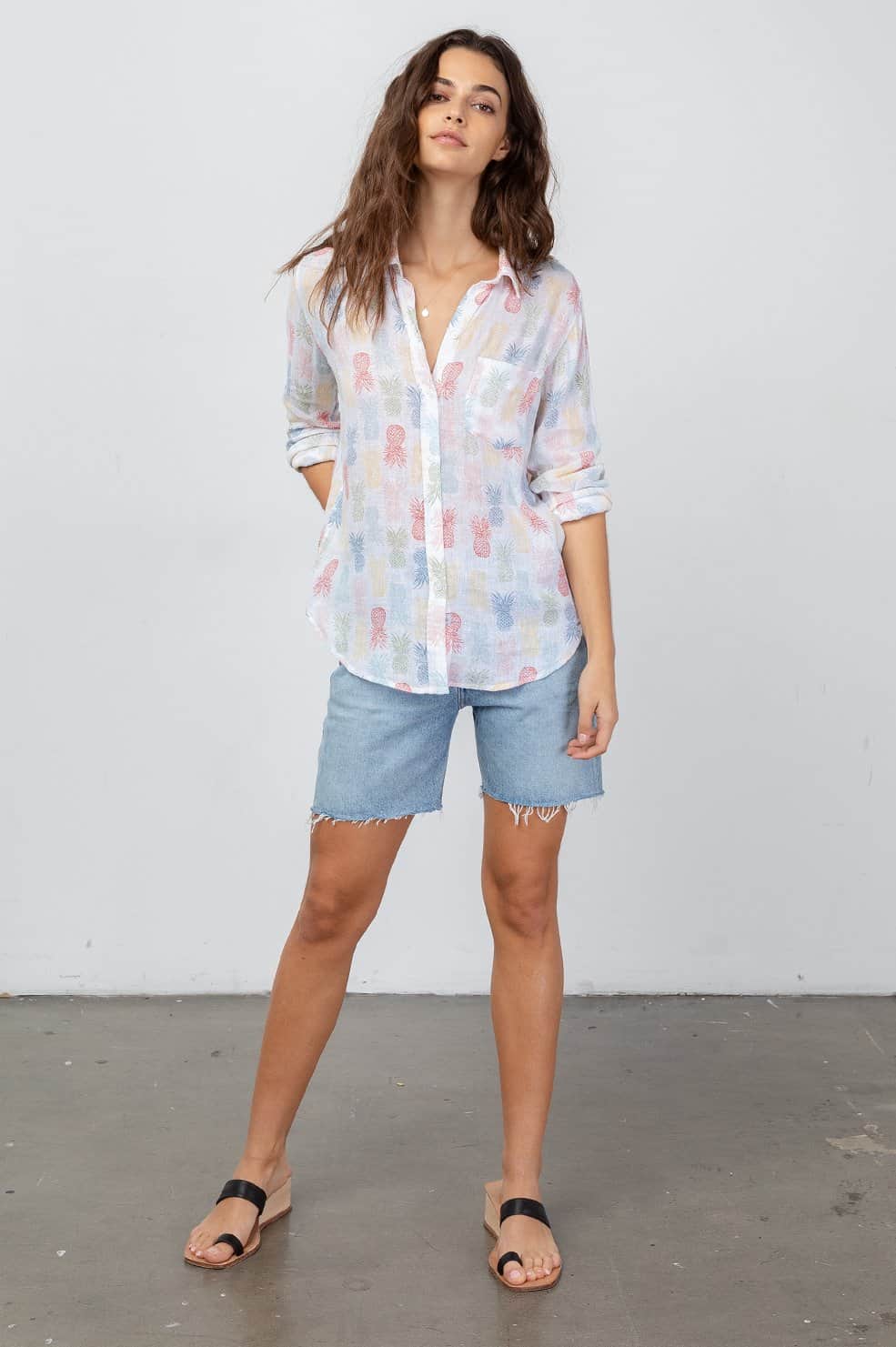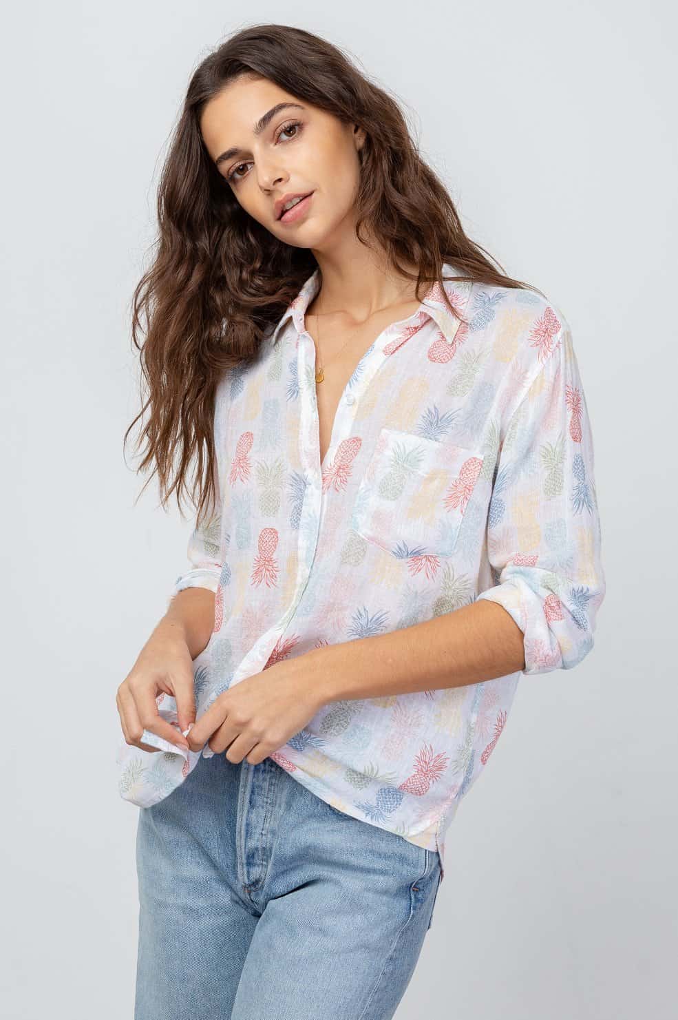 The Charli Shirt in Rainbow Pinas is a long sleeve, button-down top featuring rainbow pineapple print, high-low shirttail hem, and single chest pocket. Lightweight, breezy linen fabric mixed with a relaxed body shape makes the Charli the perfect Southern California inspired button-down.