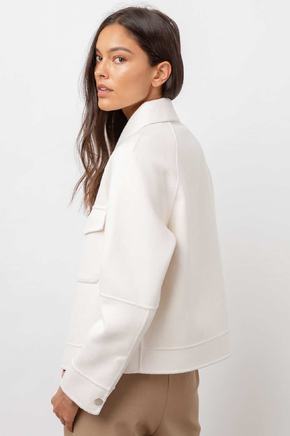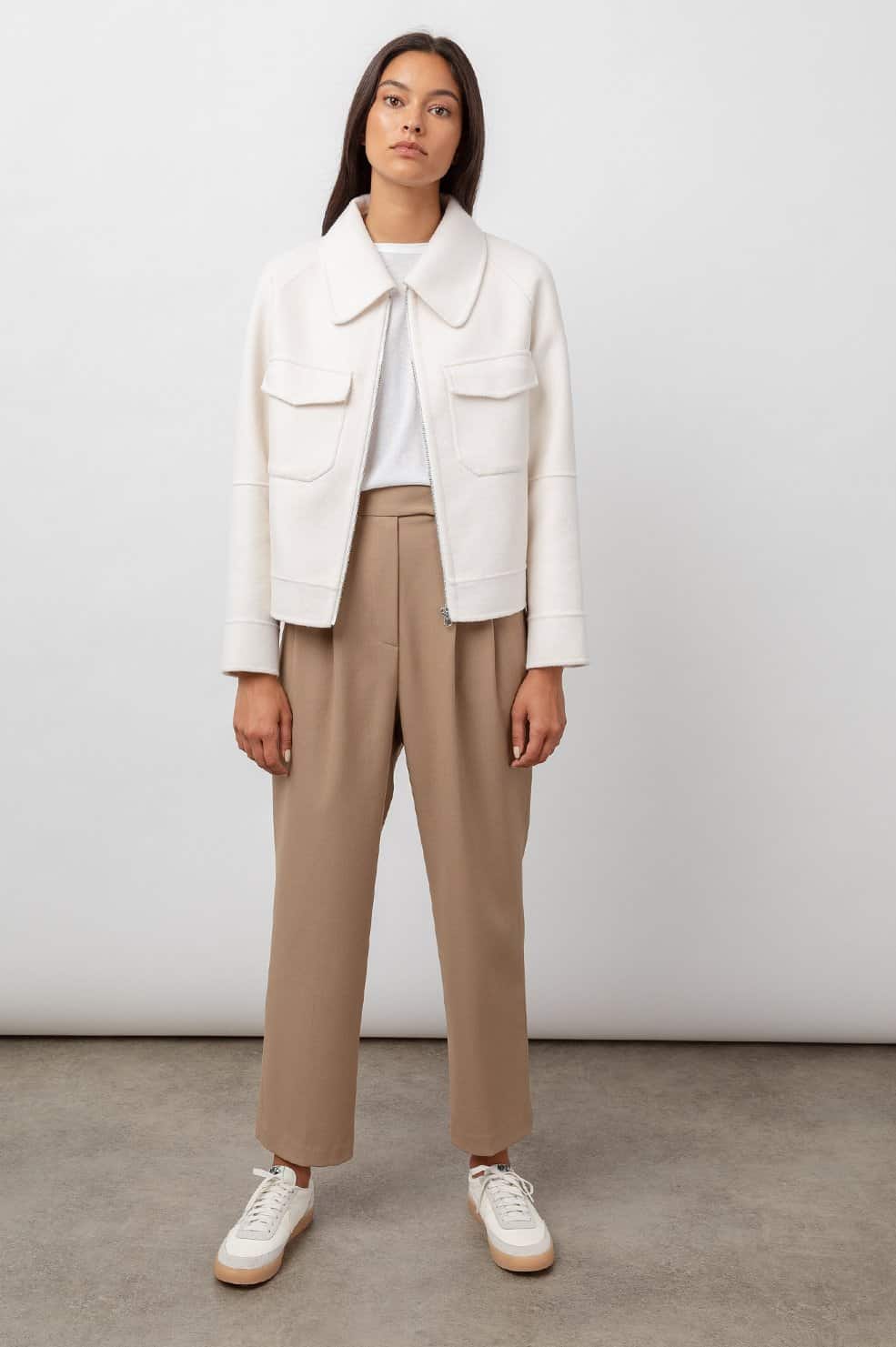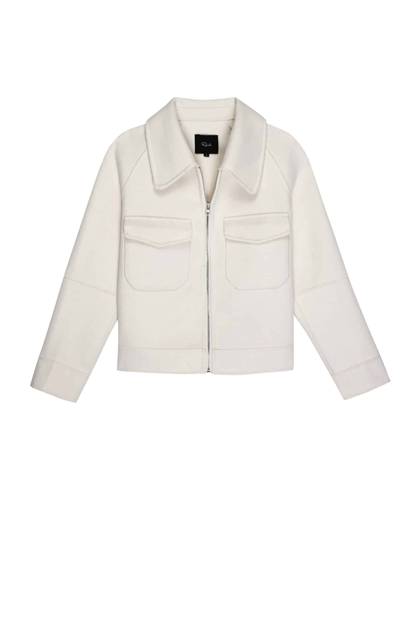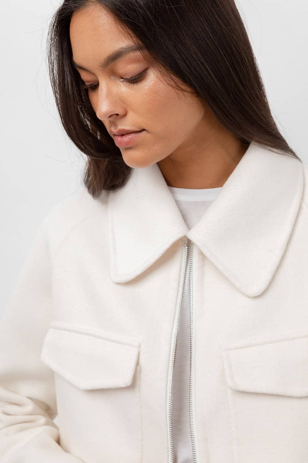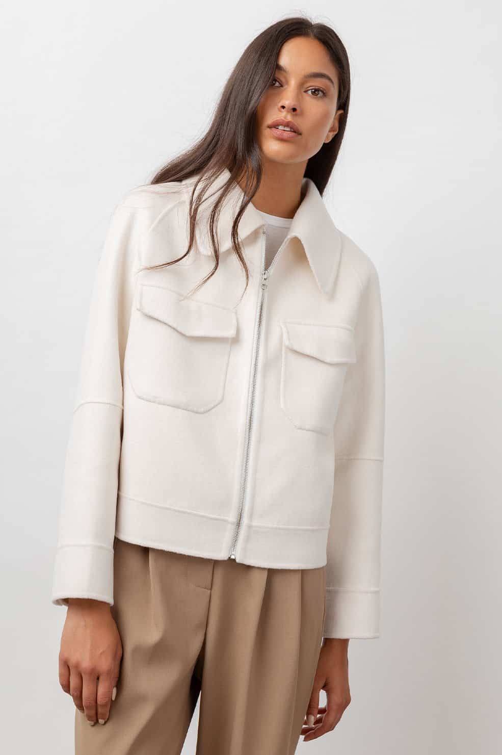 The Rails Cheyenne jacket in white is a simply stunning wool blend, ivory zip up jacket. The long sleeved jacket is unlined and features silver hardware, an oversized collar and oversized flap pockets at the chest. This stylish jacket will take you from day to night easily ensuring that you remain stylish whatever the occasion.