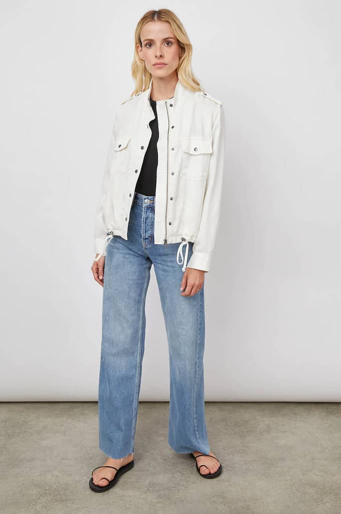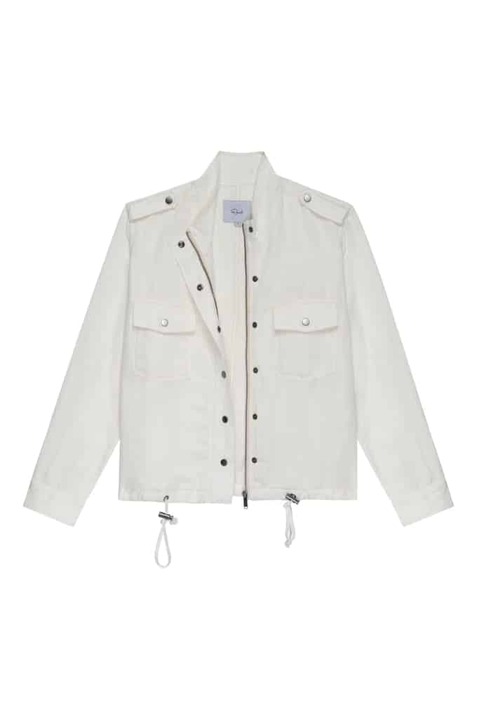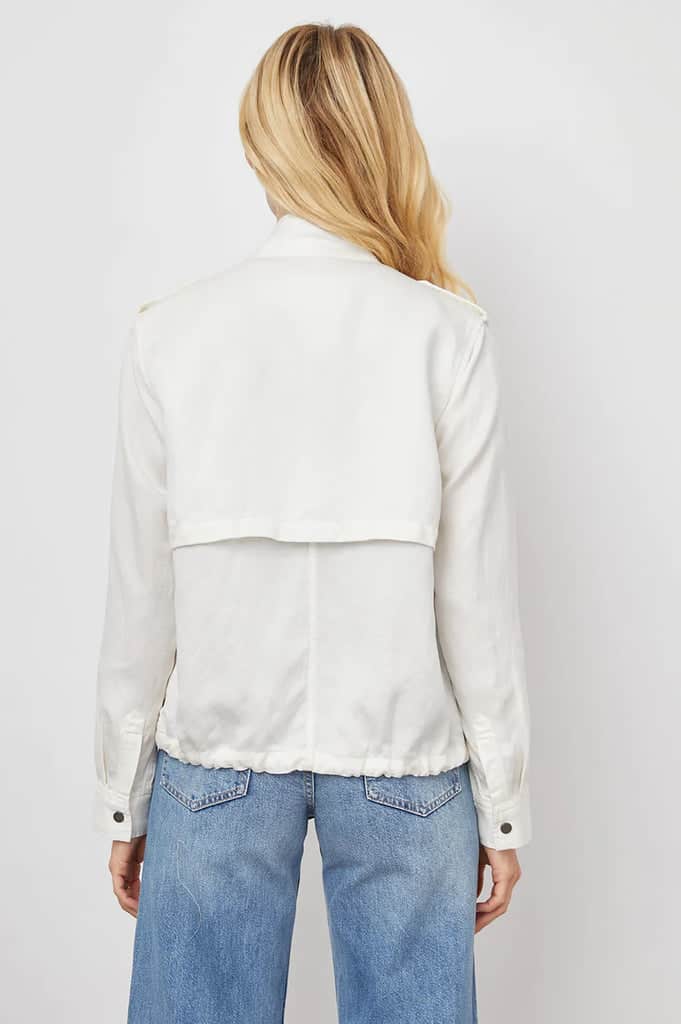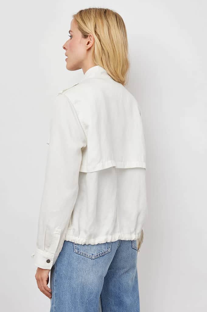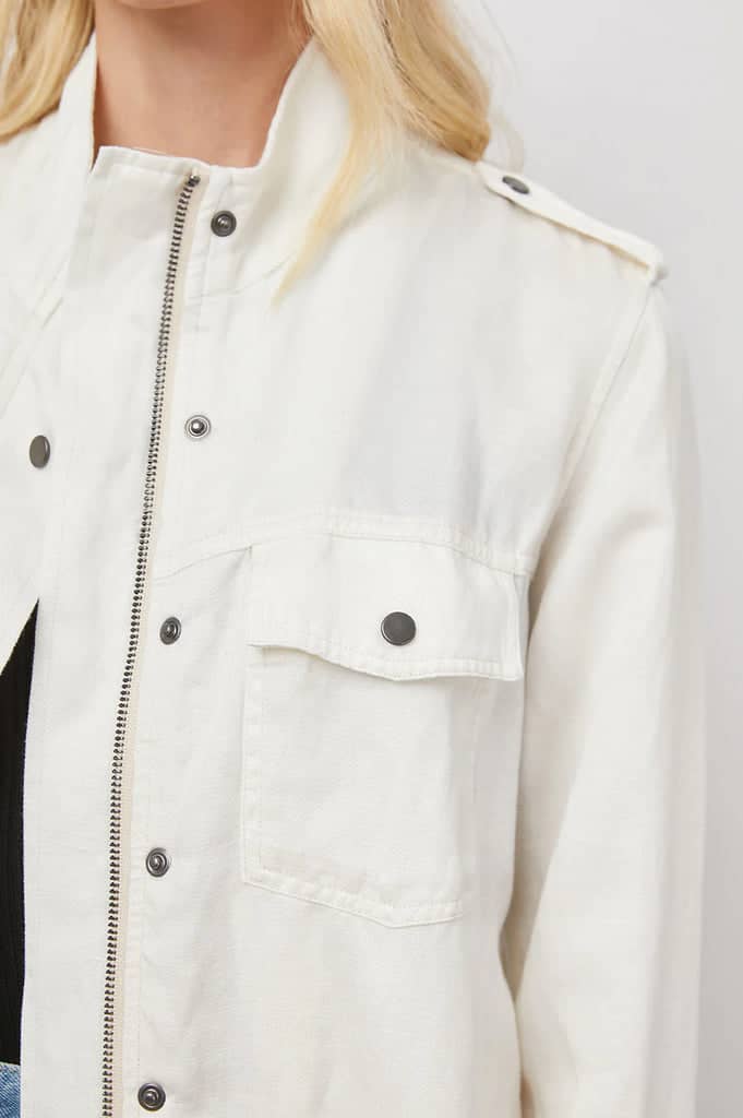 Rails Collins Jacket White is a classic military-inspired jacket made from vintage twill featuring a zip-up silhouette with snap closures, adjustable fit with toggle-drawstring hem, and breathable back flap.