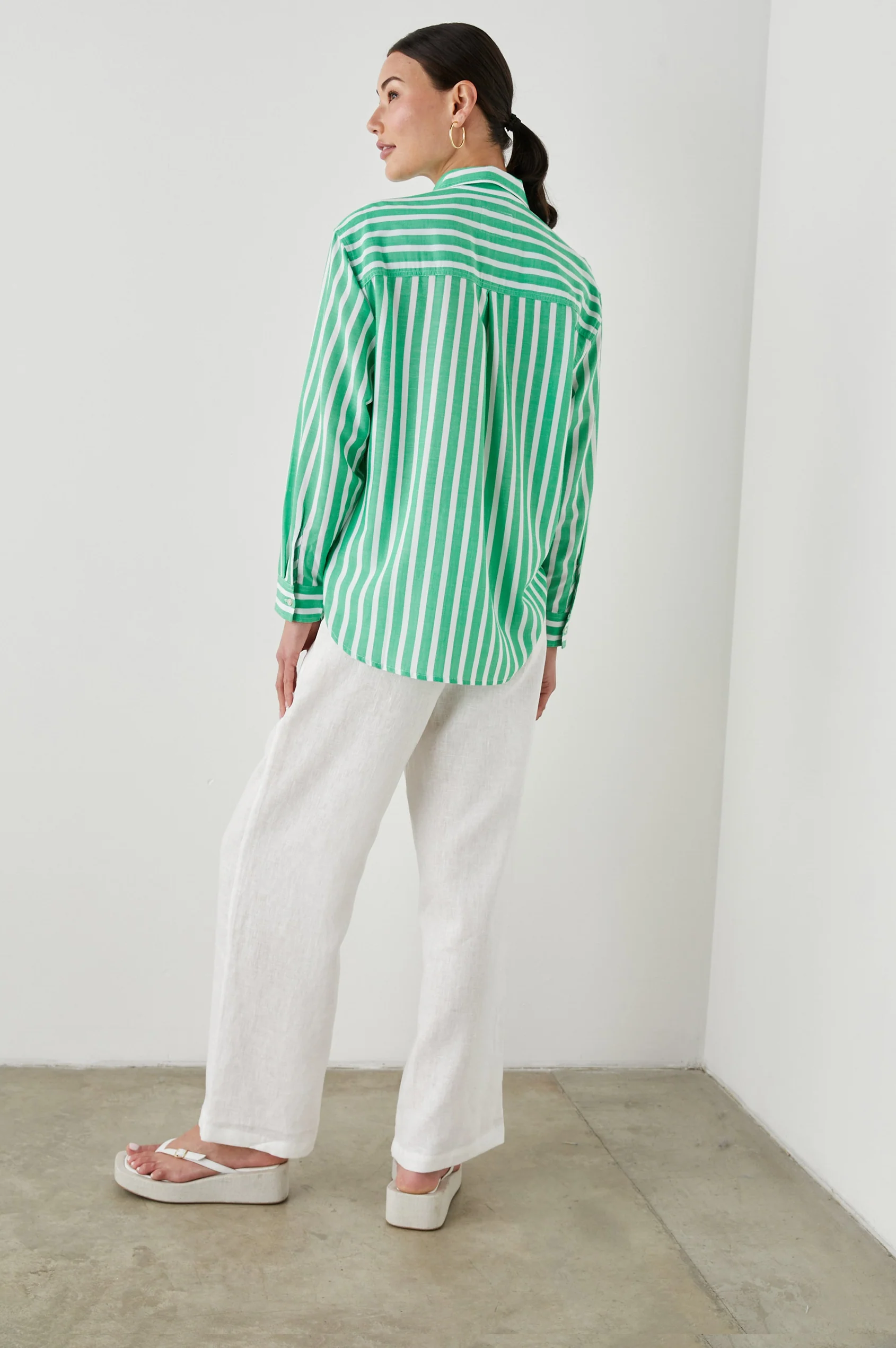 The Rails Elle Stripe Shirt Clover Stripe is everything your wardrobe has been missing. With functional buttons traveling halfway down the front and a summer-ready flowy fit, this versatile top is perfect for any occasion. Dress it up for a night out or wear it to the office– the styling options are truly endless.