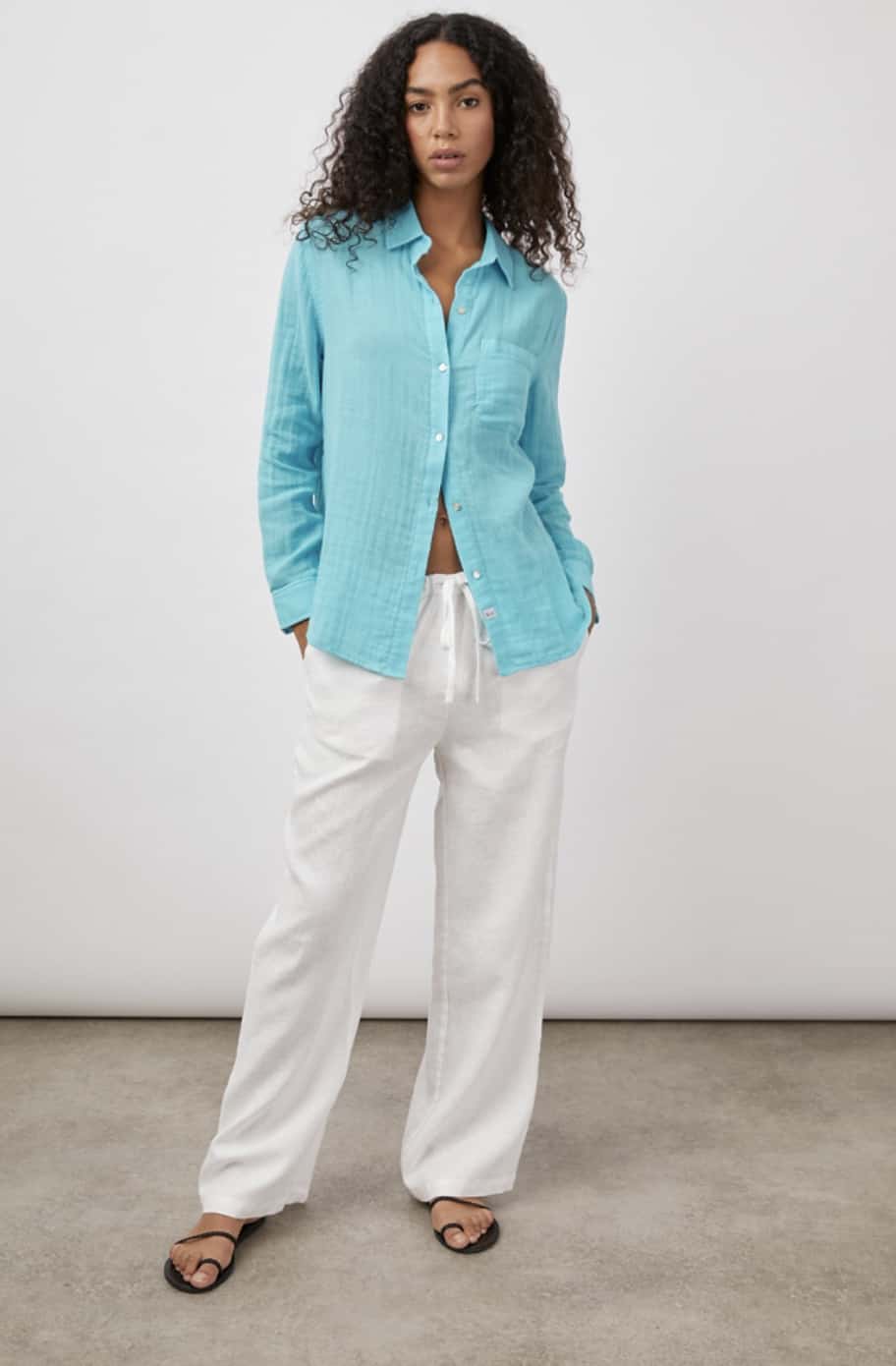The Rails Ellis shirt in aqua is a lightweight, organic cotton shirt in a bright aqua hue. This shirt will literally go with anything whether you wear it with your favourite pair of jeans, tucked in or hanging loose or team it with a skirt and tie the front bottom hem for an effortlessly stylish look. It can also be worn open over a bikini on holiday. This will quickly become your 'go to' shirt and the classic fit and lightweight fabric makes this a must for any wardrobe.