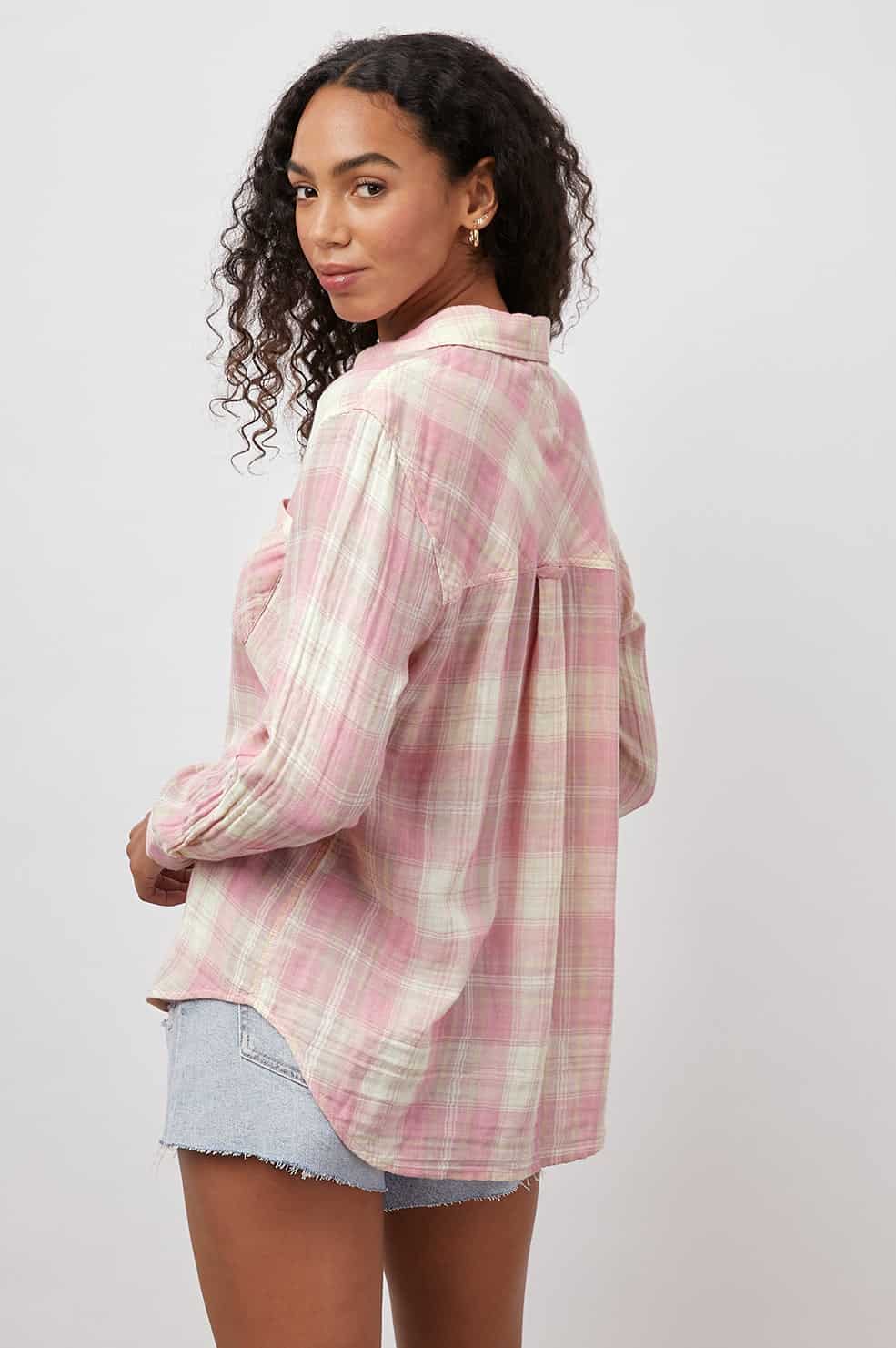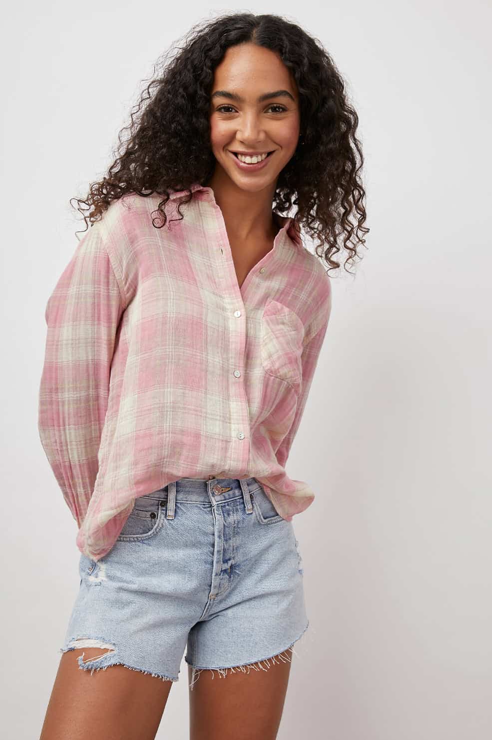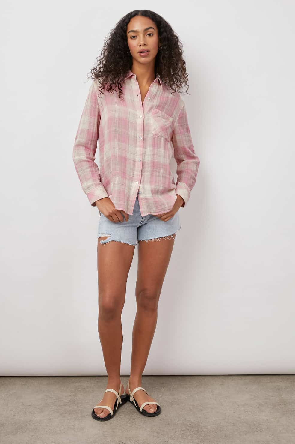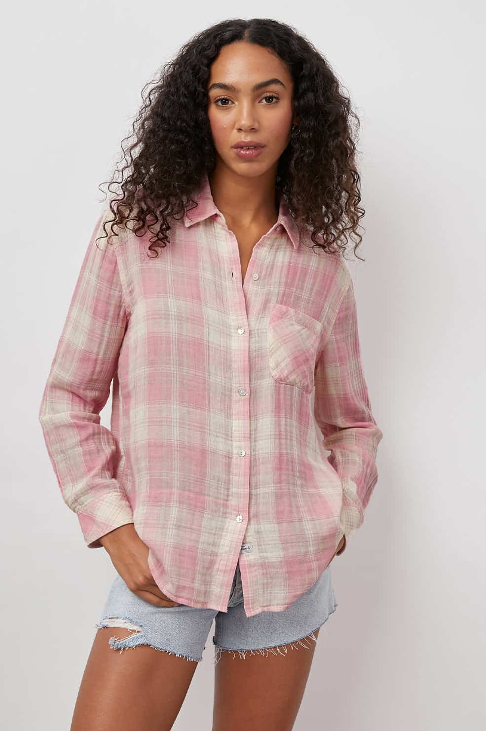 The Rails Ellis rose shirt in sand ivory is a stylish classic must-have for everyday improved comfort made from light, airy, and breathable fabric. This button-down shirt has a single patch pocket at the chest, natural shell buttons, and a classic fit, made of organic cotton gauze.