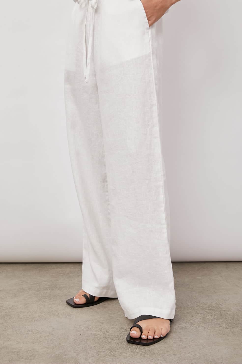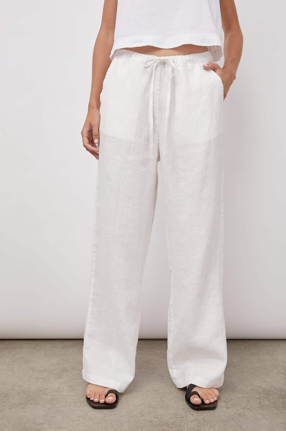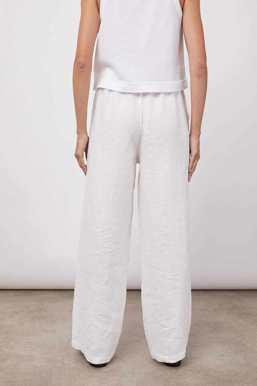 The Rails Emmie Linen Trousers White are an absolute summer must have. The simple pull on style have an elasticated waist with a drawstring and side pockets. The legs are slightly tapered in shape but still offer plenty of volume for that classic summer style and they look great worn simply with a tee and denim jacket.