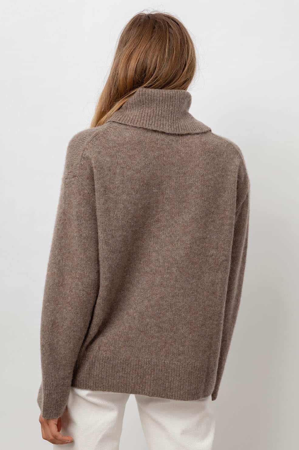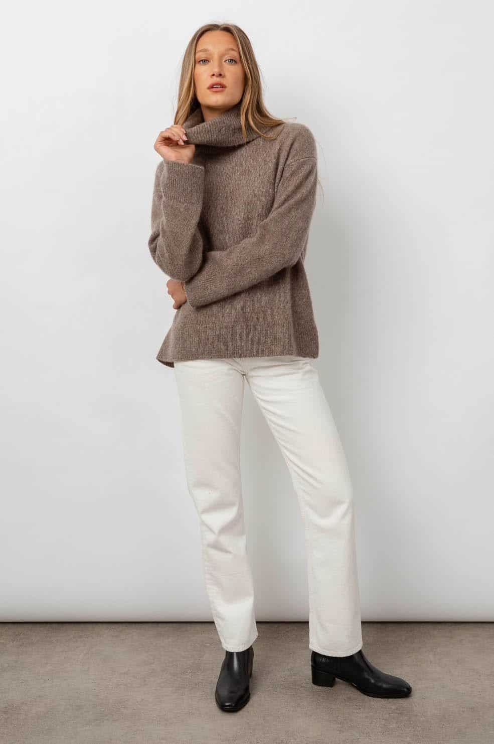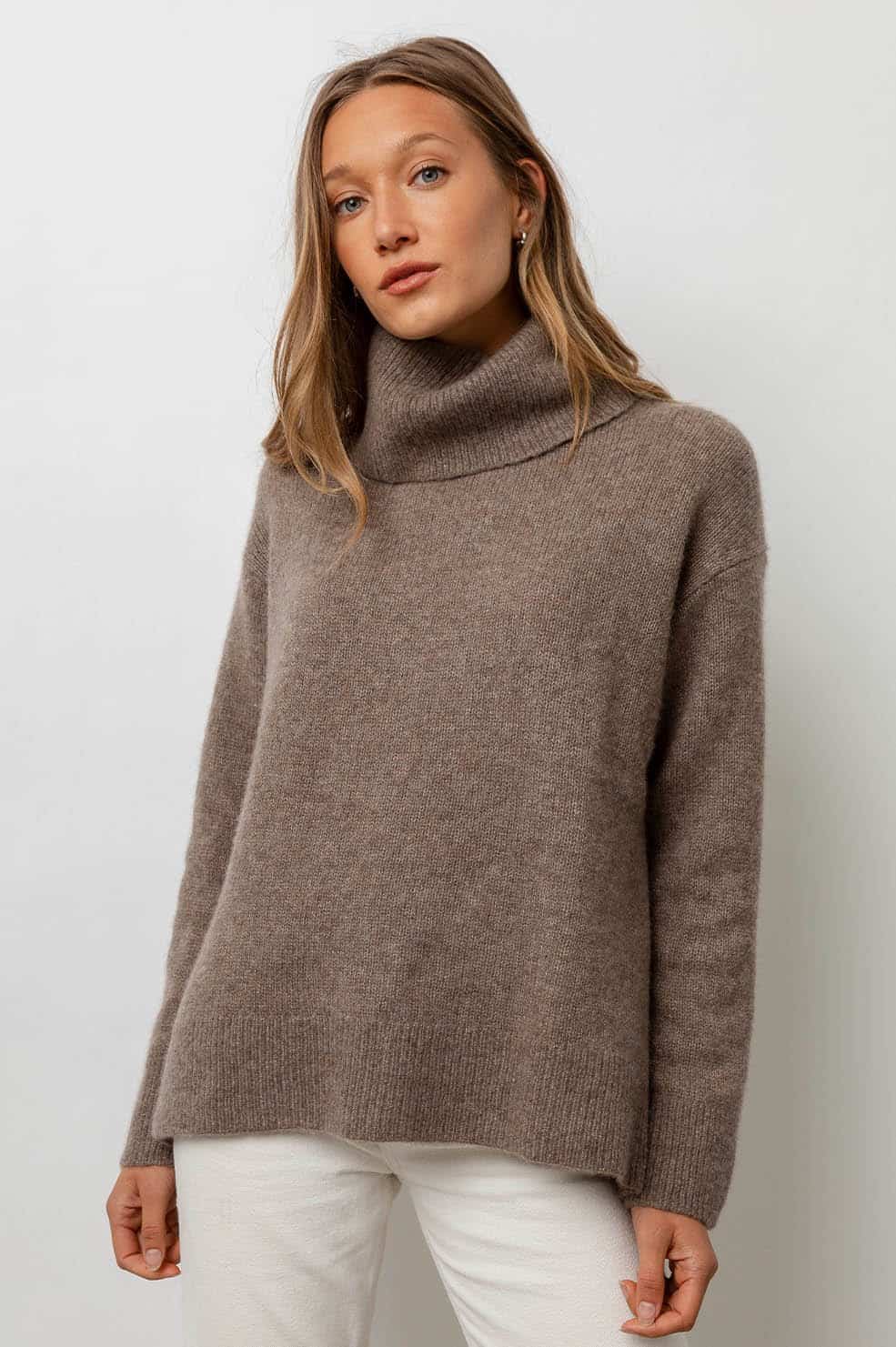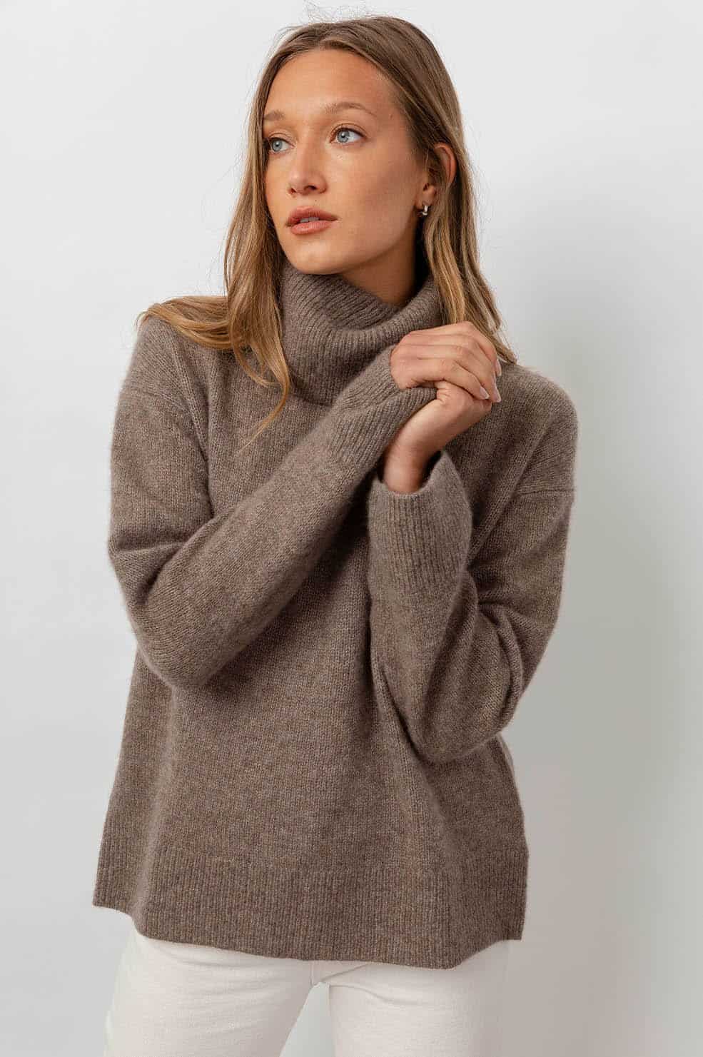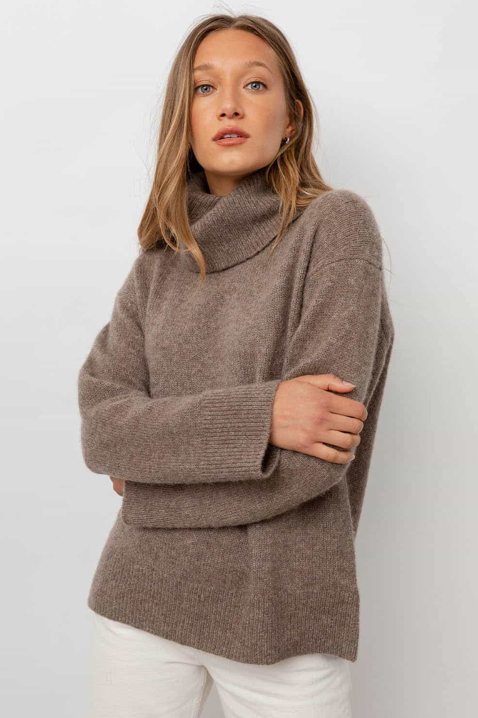 The Rails Imogen turtleneck jumper in hazelnut is a gorgeous cashmere silk blend jumper. It has a slightly oversized fit and long sleeves, with a ribbed trim at the neck, hem and cuffs. This is a classic yet stylish jumper that is a great addition to any wardrobe. Elevate your outfit by teaming this beautiful knit with your favourite jeans or by throwing it over your dresses for a stylish layered look.