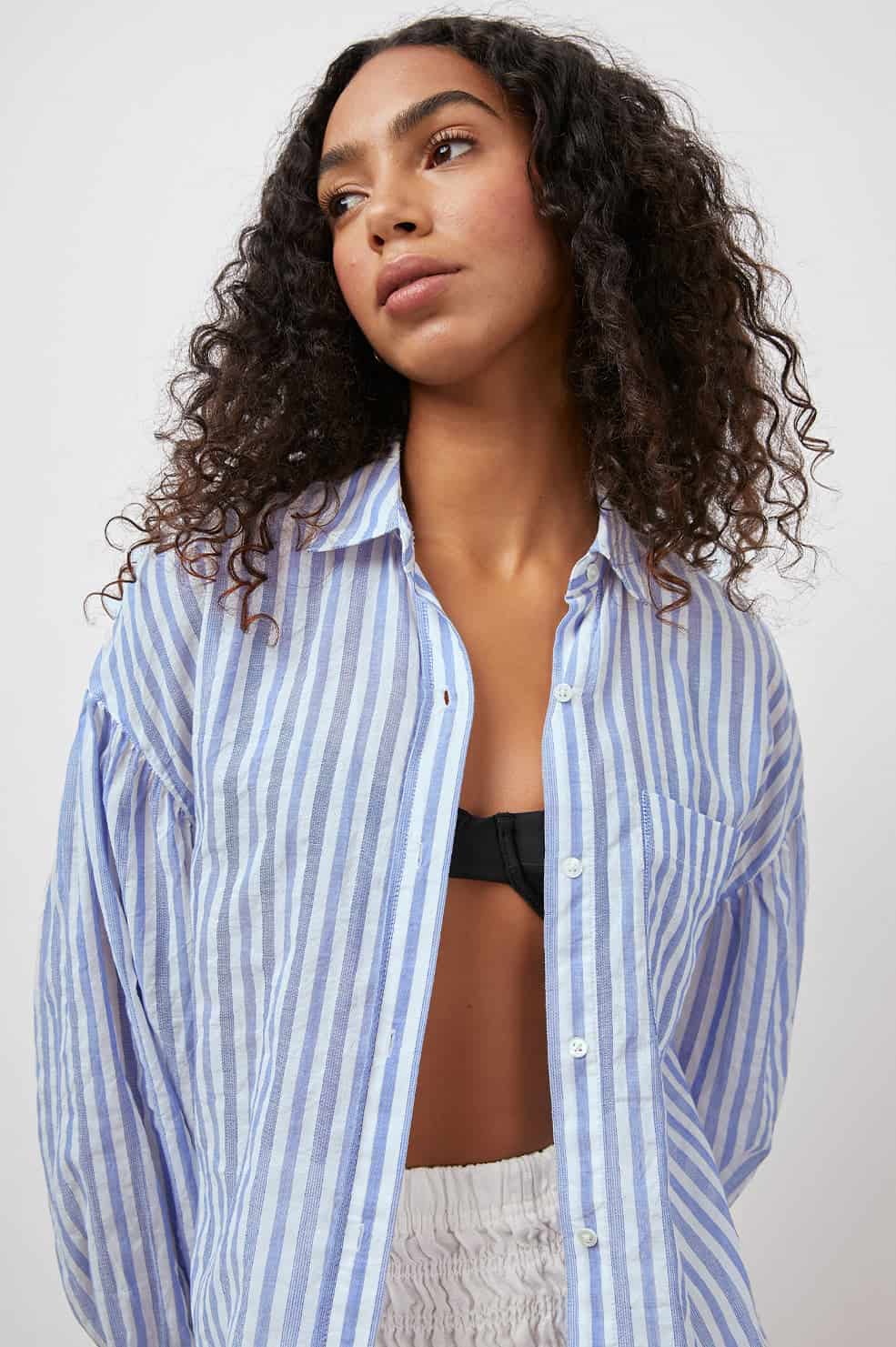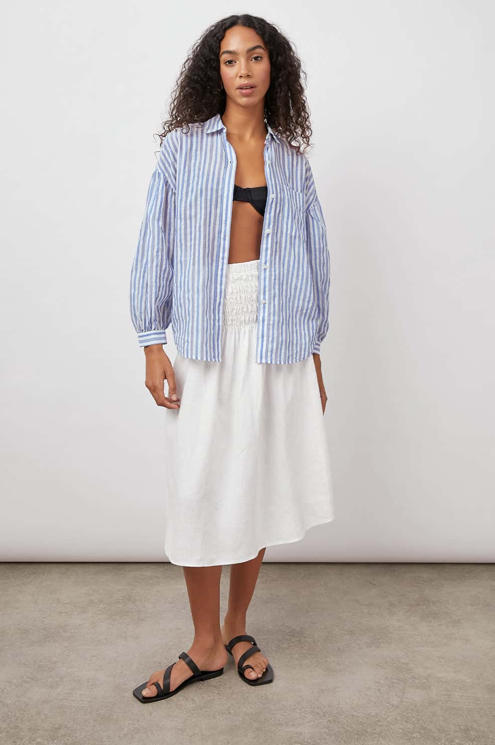 The Rails Janae shirt in lighthouse stripe is a soft white collared button-down shirt has a dropped shoulder, a chest patch pocket, full sleeves with shirring, and is made of lightweight, textured beach cotton. This feminine spin on the conventional button-down shirt that will have you looking put together from work to the weekend, paired perfectly with our Rails melrose slim jeans in sunfade.