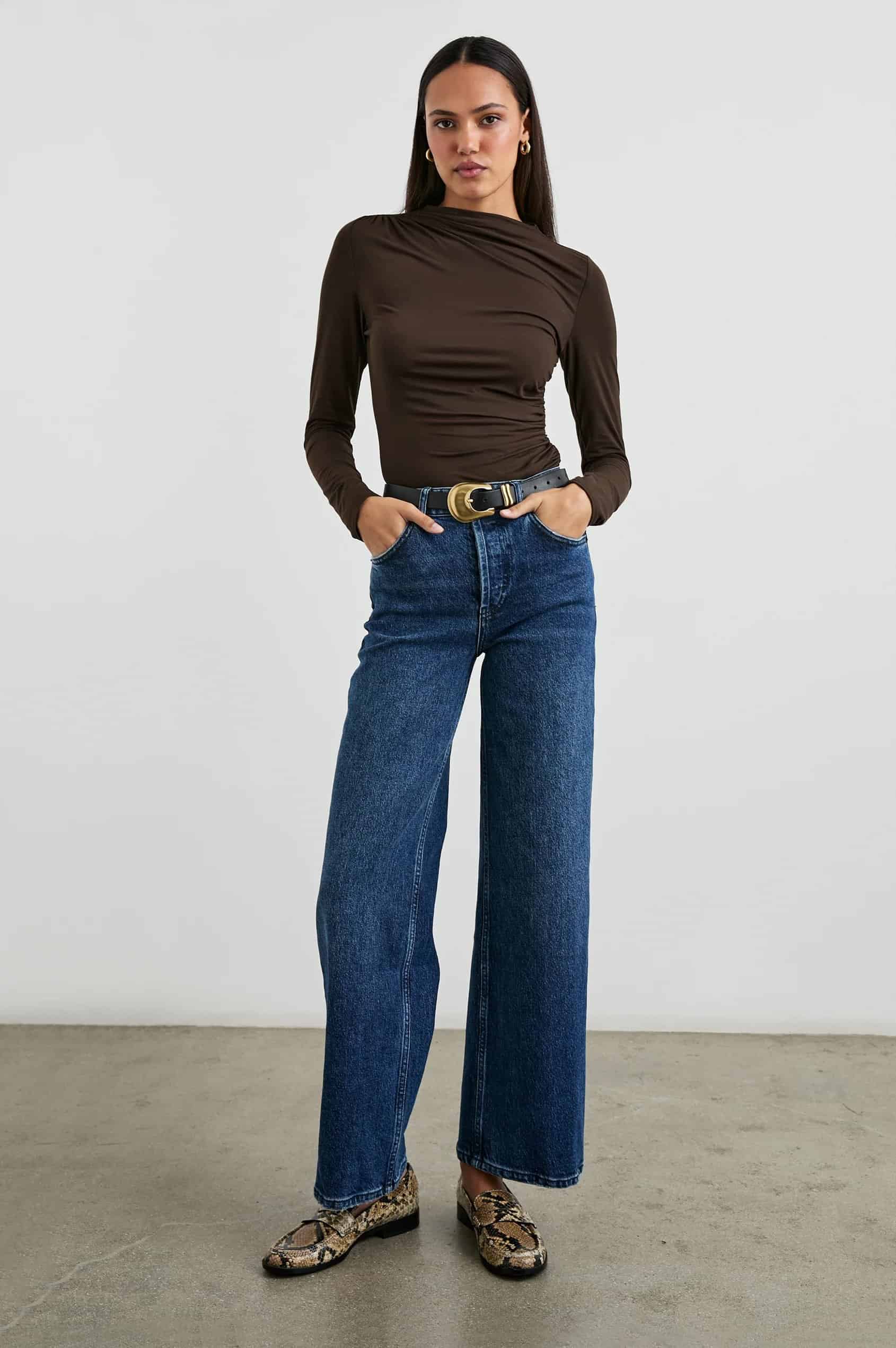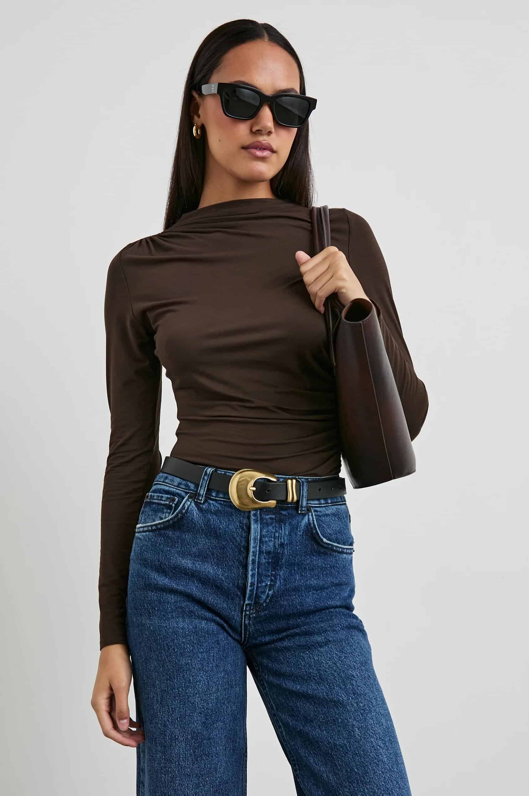 Meet the Rails Joelle Top in Espresso, a modern, elevated twist on the classic long sleeve. Crafted from luxuriously soft gauge jersey, this top offers a flattering drape with just the right amount of stretch for a smooth, body-skimming fit. The asymmetrical mock neck and shirring detail from the right shoulder add a touch of sophistication and contemporary edge, making it the perfect statement piece for your everyday wardrobe.