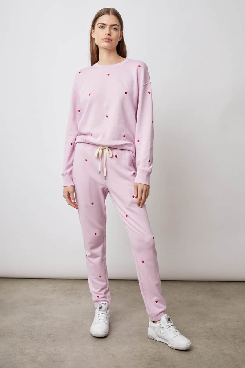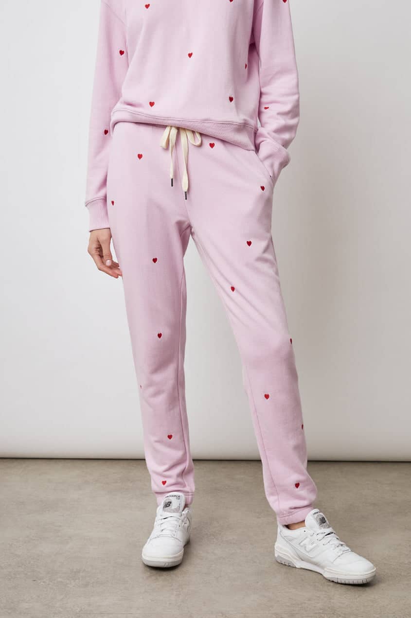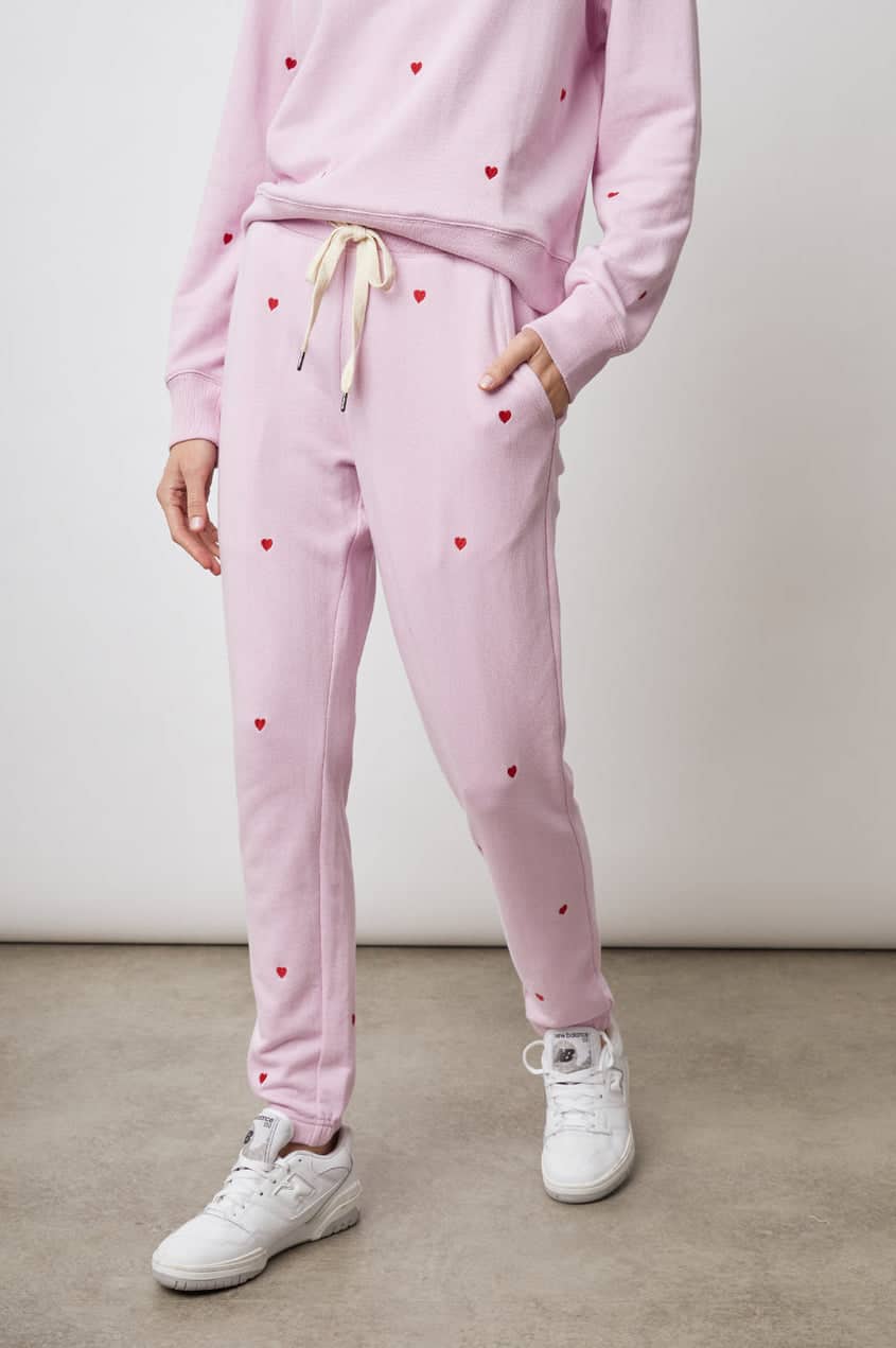 The Rails Kingston Joggers Red Embroidered Hearts adorned with red, embroidered hearts, is an easy upgrade to your lounge look. This pair comes with the softest terry fabric that's smooth on the outside and warm and fuzzy against the skin. Premium details include an elastic waist, convenient side pockets, and a tapered fit. Pair with the matching sweatshirt for the ultimate lounge fit.