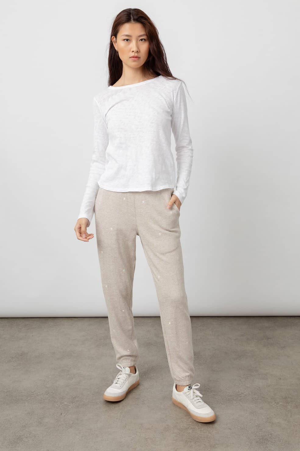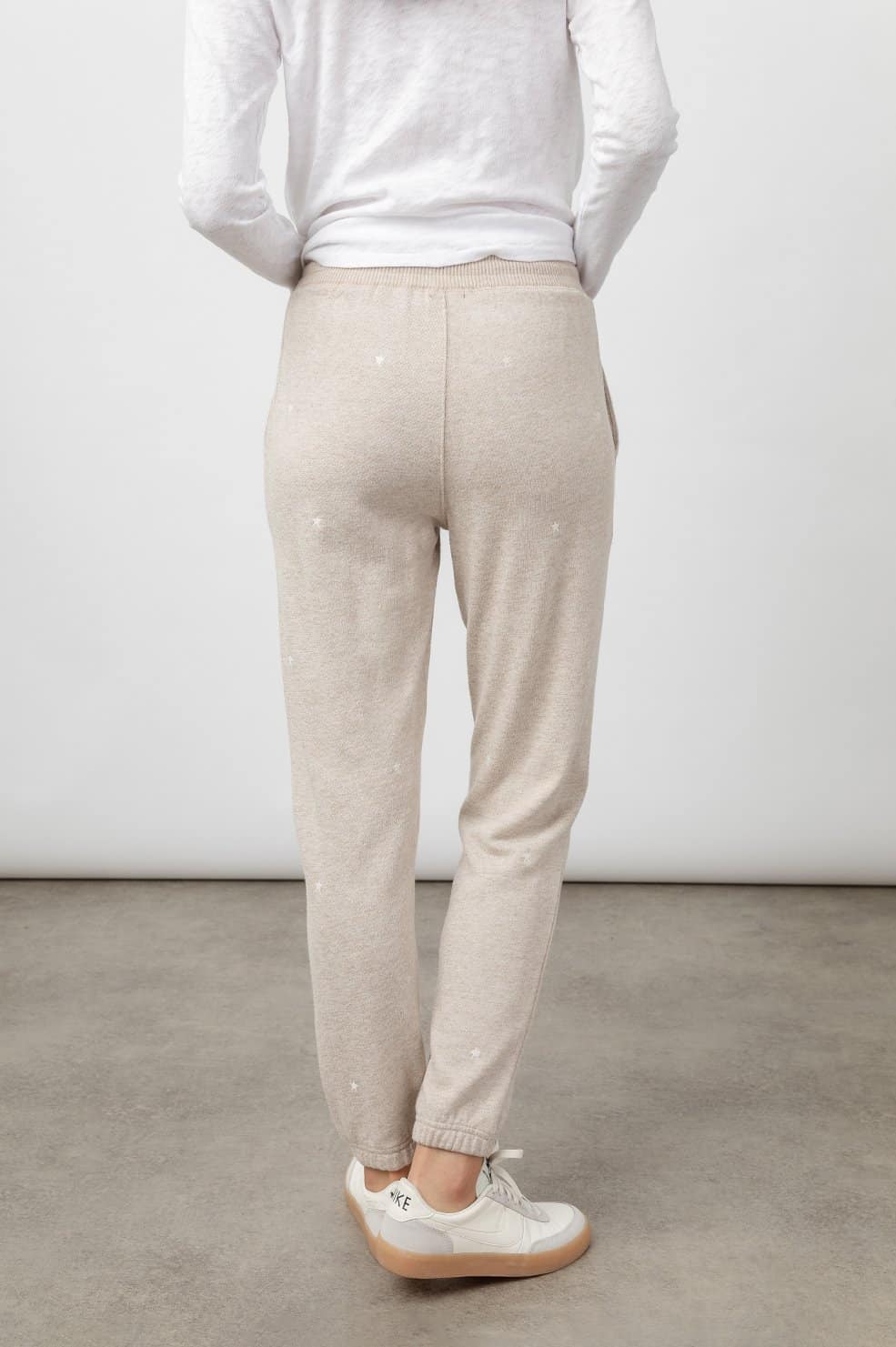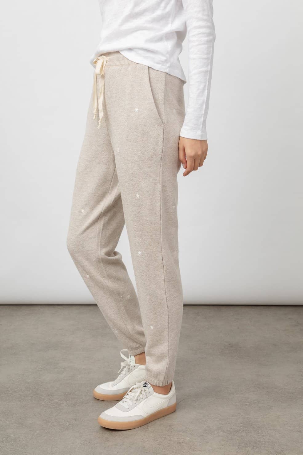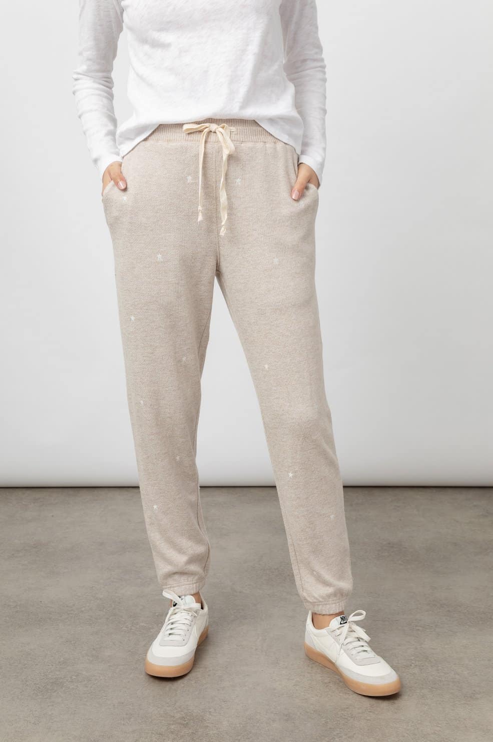 The Rails Kingston sweatpants in heather brown embroidered stars are super soft sweatpants featuring white embroidered stars all over. They have an elasticated waist with natural drawcord, side pockets, tapered leg, and elastic cuffs. This is the perfect sweatpant for wearing out and about or lounging around at home. Team with the Rails Ramona sweater in heather brown embroidered stars for a stylish and coordinated look.